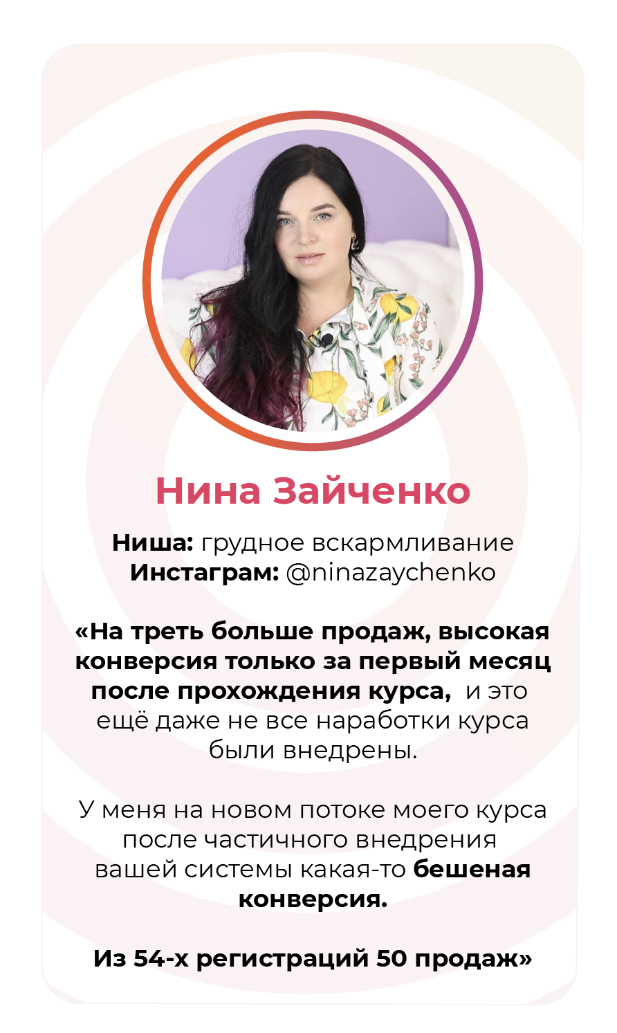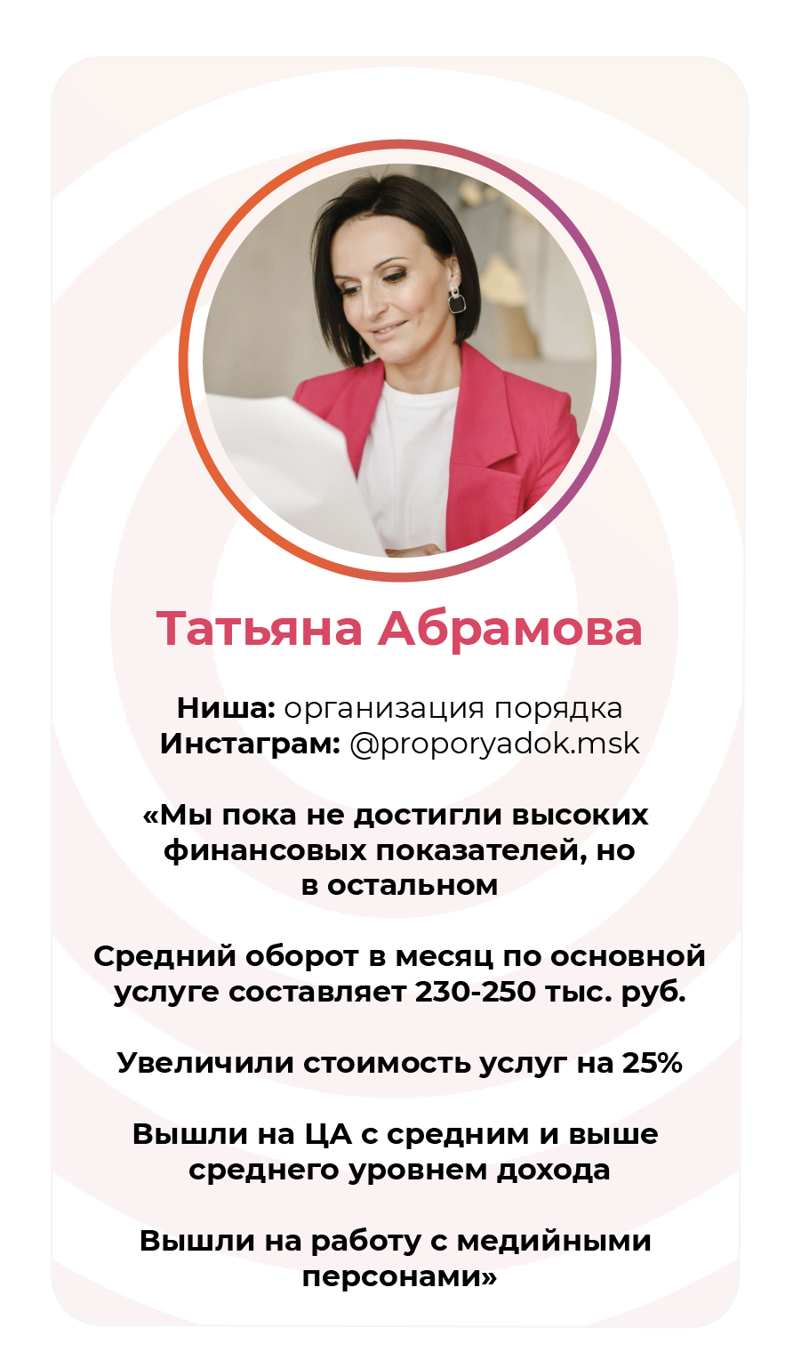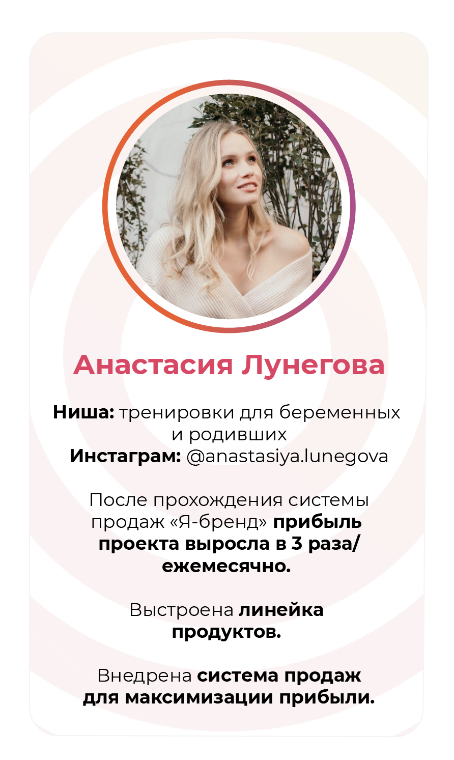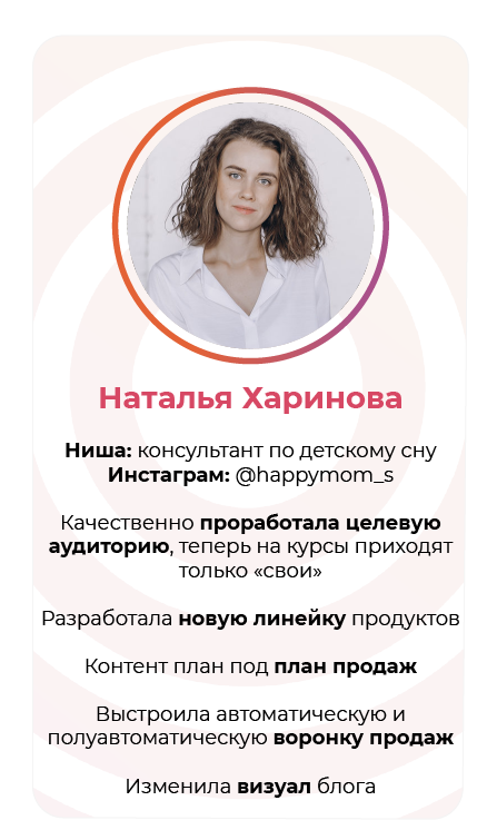Проект мой стартовал с января, сейчас вышла на доход чуть больше 100 тр, но цель ставлю в 5 раз больше! И знаю, что благодаря тем знаниям, которые вы дали,я смогу легко этого достичь. Я вышла на свою ЦА, настолько комфортная для меня аудитория, ощущения что они это я.