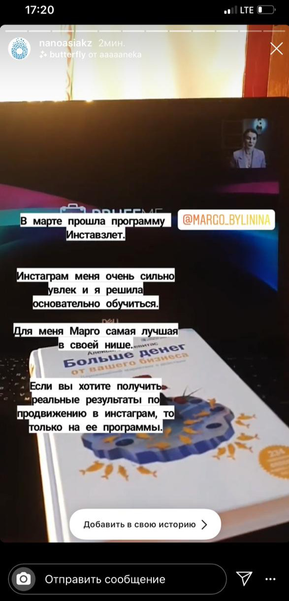 «Когда заходила в «Инставзлёт», первое что хотела получить – это понимание инстаграма. Не хотела ни кого нанимать, решила сама познать азы. Второе - естественно увеличение количества подписчиков и, соответственно, продаж. Рост подписчиков начался ещё во время