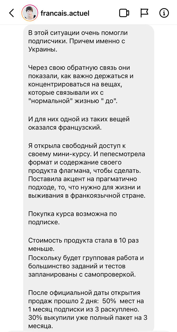 Выбрали из линейки курсов те, которые больше всего подходили под это и открыли продажу без прогревов. Просто 2 сторис, где я сказал о таком спец предложении, как вариант отвлечься от новостей и накручивания себя в негативном ключе. Такого рода медитация через готовку чего-то нового. Эти продажи мы открыли 1 марта и они принесли 500 000 выручку в первые сутки и около 1 000 000 за неделю. И таким образом мы на самом деле щупали почву на покупательскую способность и подготавливали читателей к последующим продажам.