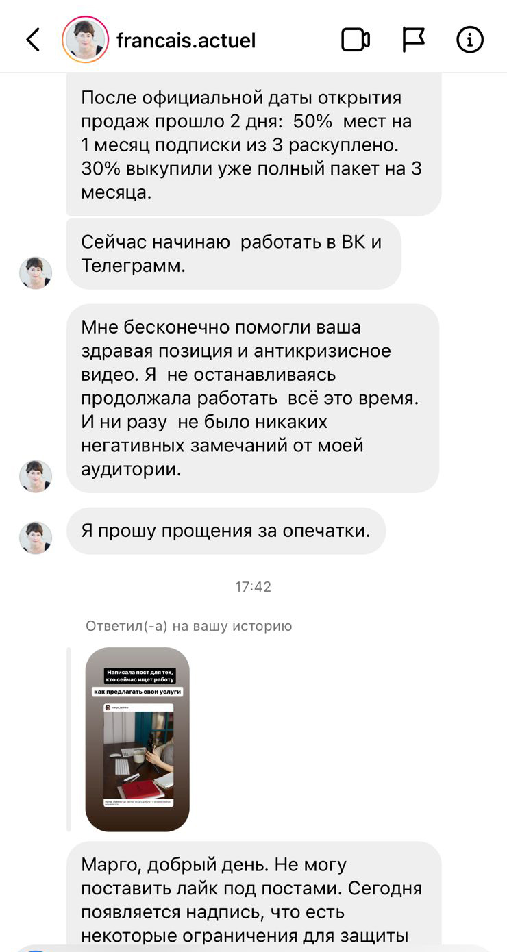 Но есть и такие примеры, которые лишний раз подтверждают, что паника — это не лучший советчик при принятии решений в кризисных ситуациях. Наши ученики, создатели Инстаграм проектов, которые построили систему продаж, чувствуют себя сегодня увереннее многих. Они перевыполняют планы продаж, осваивают новые каналы, выводят на рынок новые продукты. Они не только управляют ситуацией и не теряют своих позиций, но и готовы занимать освобождающиеся места в нише.