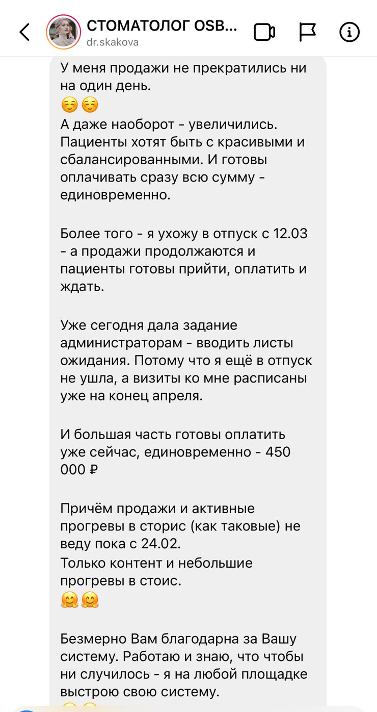 У меня в этот непростой для РФ период, когда многие мои коллеги сидят без работы — запись пациентов формируется уже на июнь. А по прибыли в марте 2022 (в пик кризиса) мы выросли в 2,5 раза. Доход составил 2 800 000 ₽ — это рекордные показатели пока на данный момент в моем проекте. И это при том, что я использую, в основном, безбюджетные техники продвижения в соцсети, а моя ЦА — это всего 1 495 подписчиков.