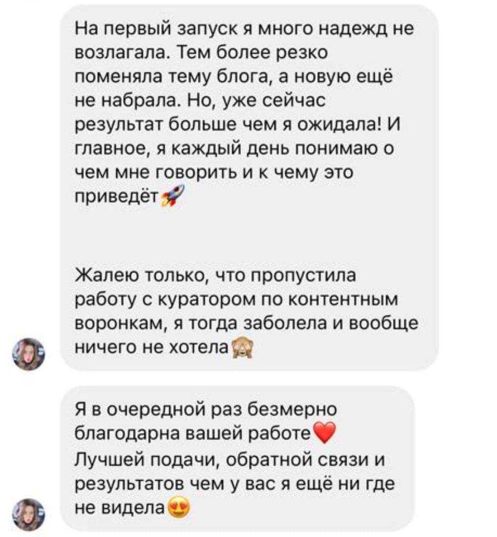 Но есть и такие примеры, которые лишний раз подтверждают, что паника — это не лучший советчик при принятии решений в кризисных ситуациях. Наши ученики, создатели Инстаграм проектов, которые построили систему продаж, чувствуют себя сегодня увереннее многих. Они перевыполняют планы продаж, осваивают новые каналы, выводят на рынок новые продукты. Они не только управляют ситуацией и не теряют своих позиций, но и готовы занимать освобождающиеся места в нише.