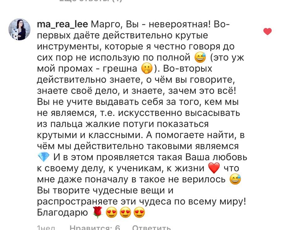 И еще, тренинги, которые я проходила после вашего курса уже не дотягивают, сложно учиться, когда ты уже учился у самого лучшего учителя. Это не лесть, это правда!