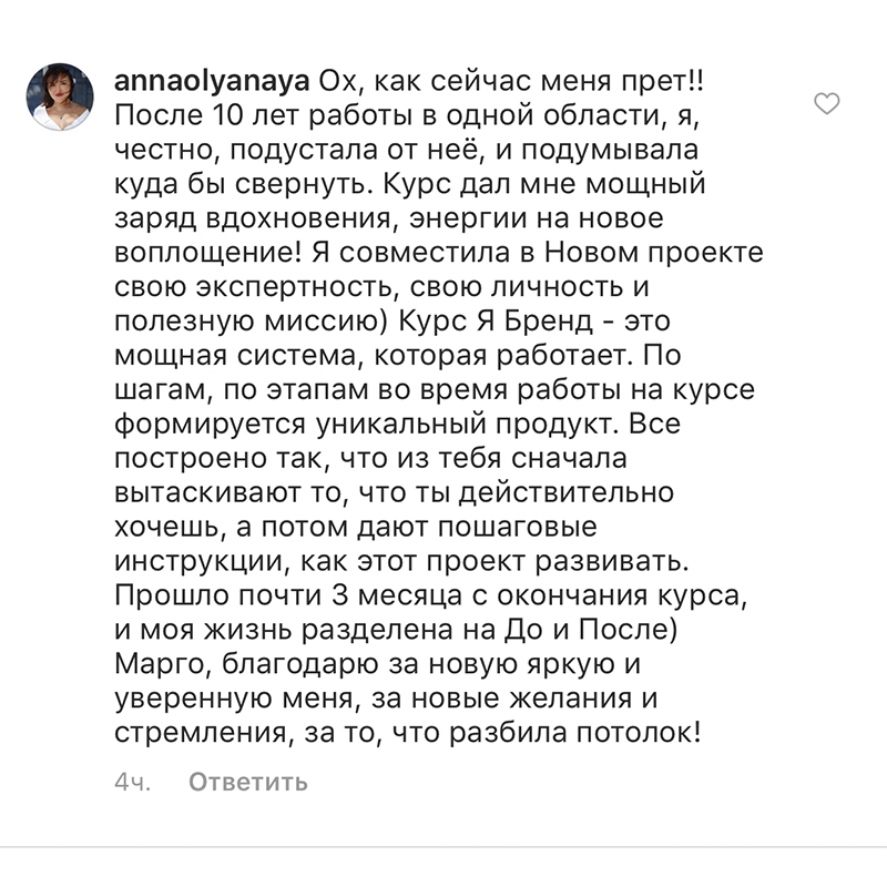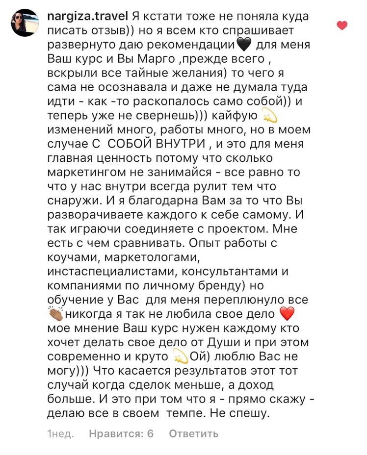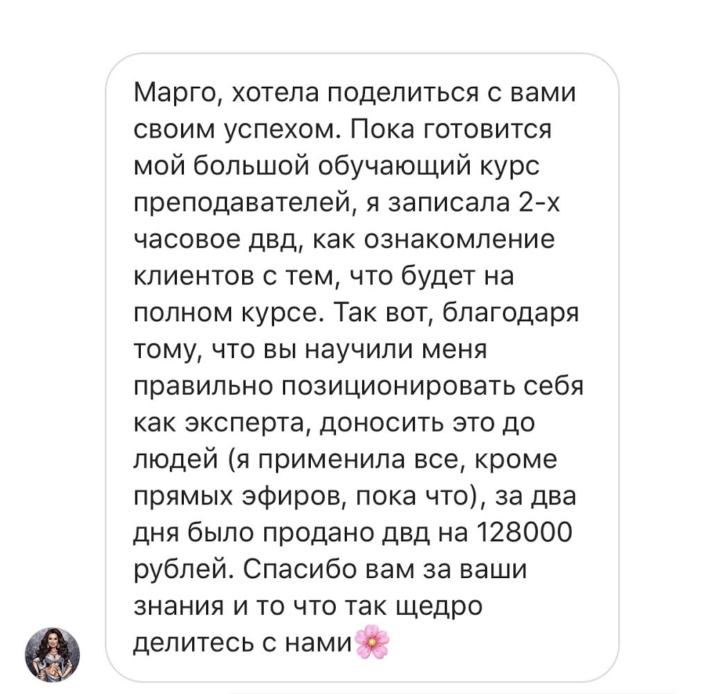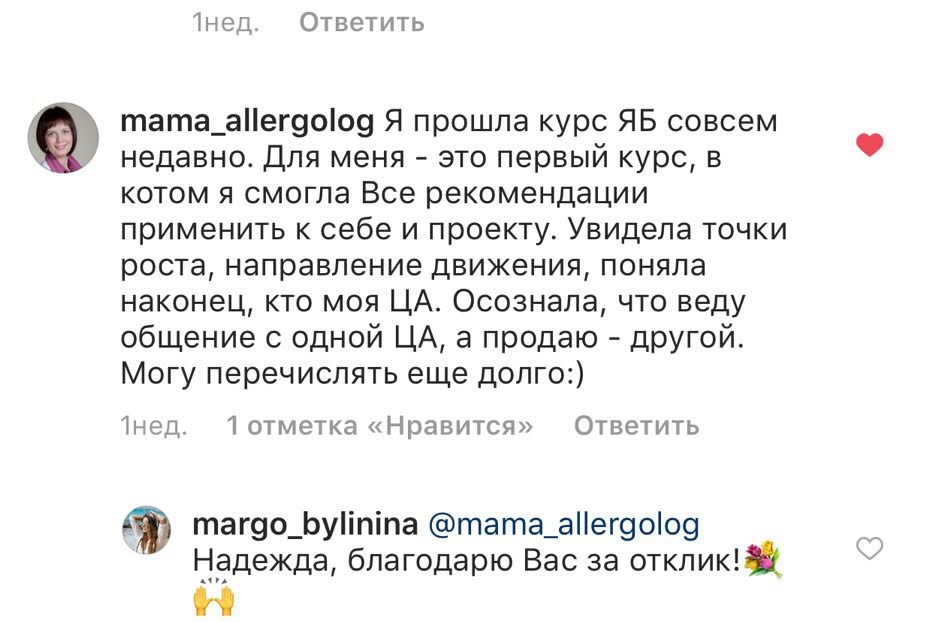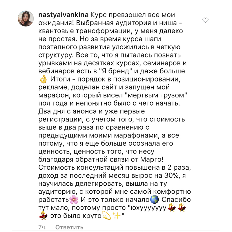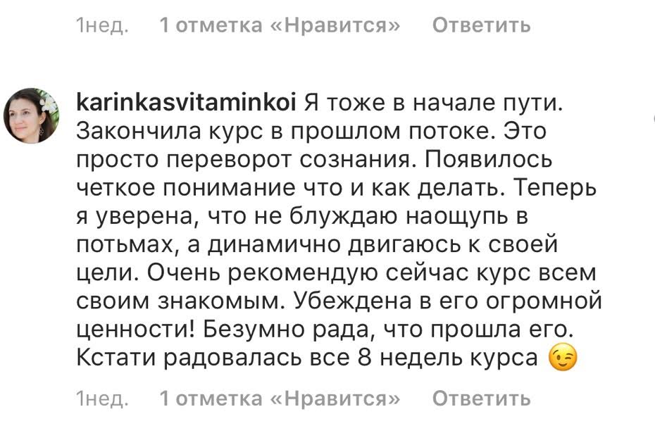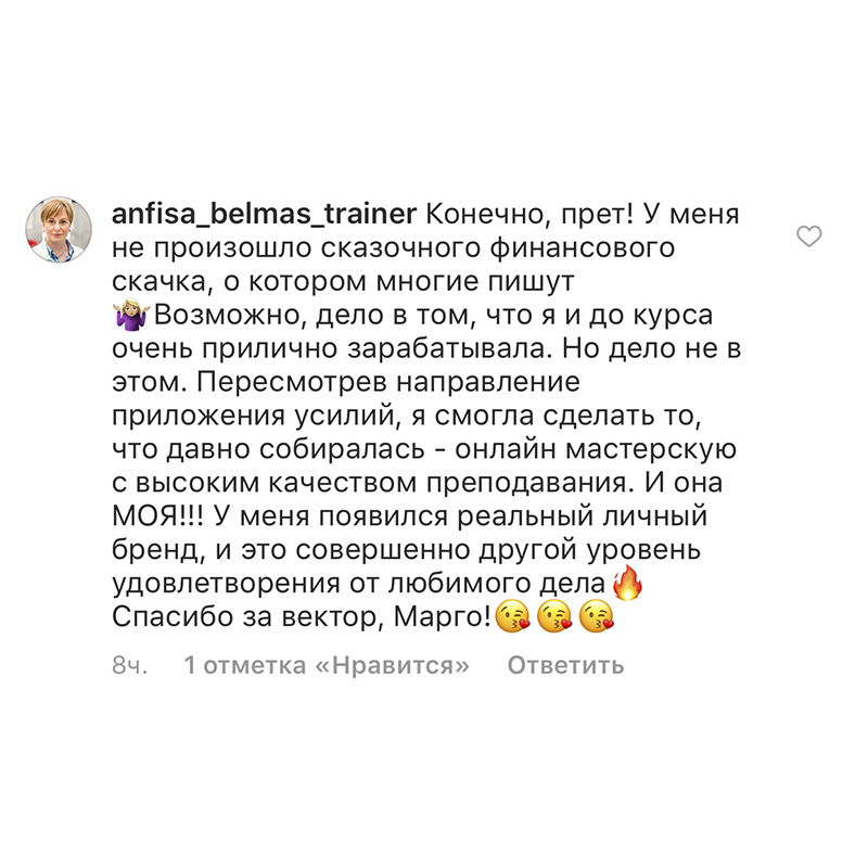 Проект мой стартовал с января, сейчас вышла на доход чуть больше 100 тр, но цель ставлю в 5 раз больше! И знаю, что благодаря тем знаниям, которые вы дали,я смогу легко этого достичь. Я вышла на свою ЦА, настолько комфортная для меня аудитория, ощущения что они это я.