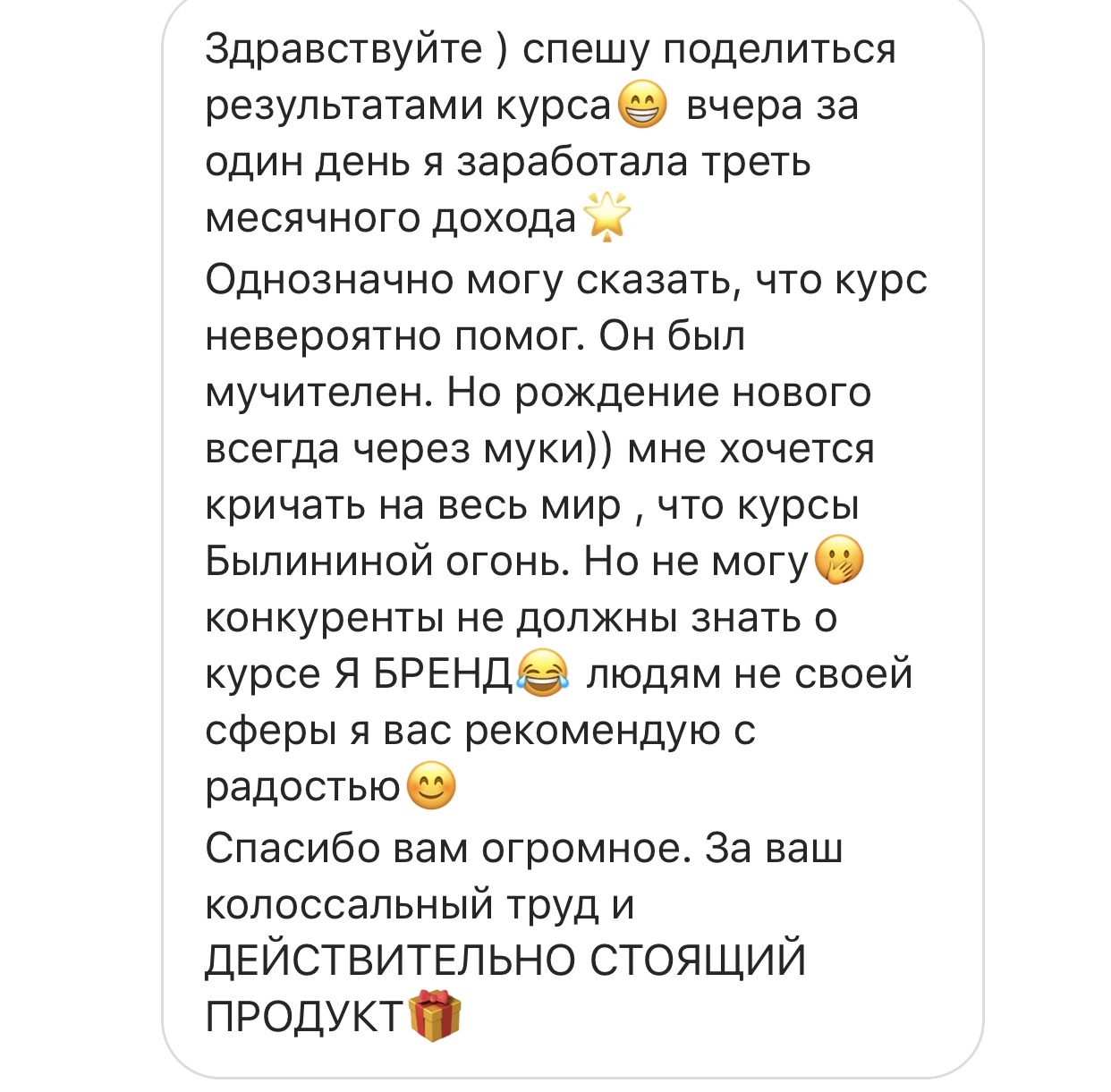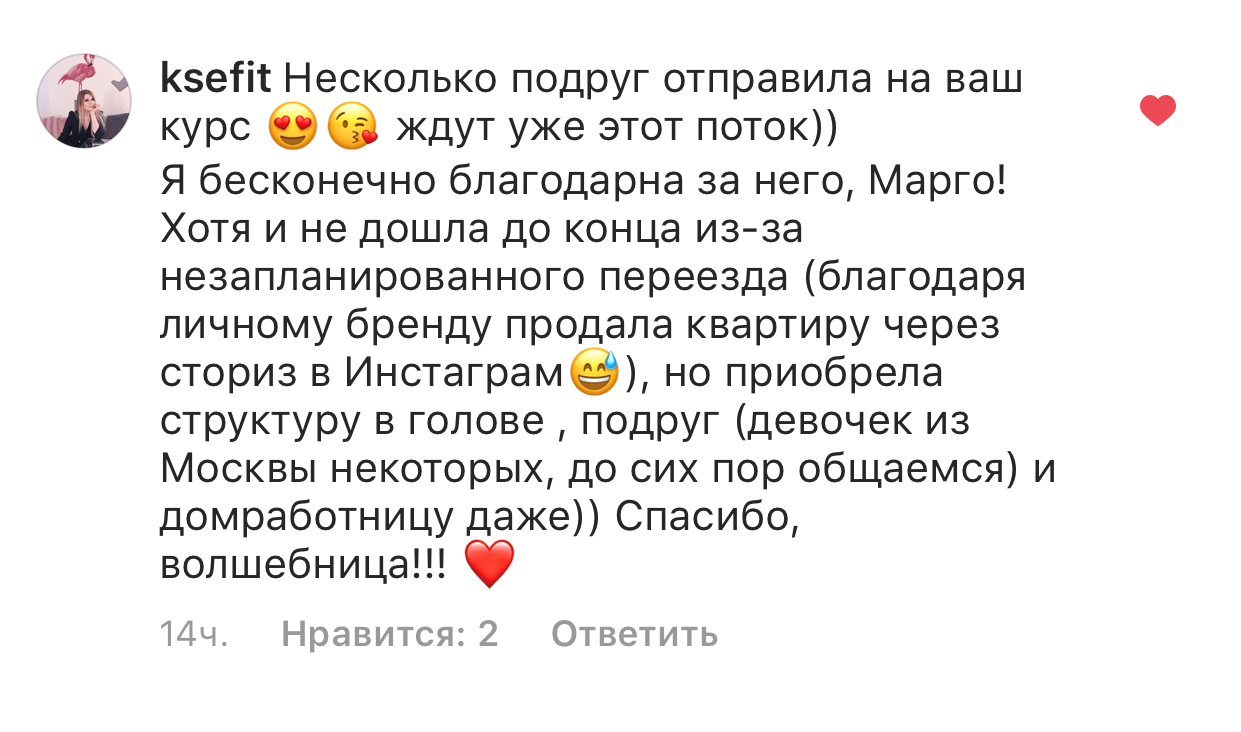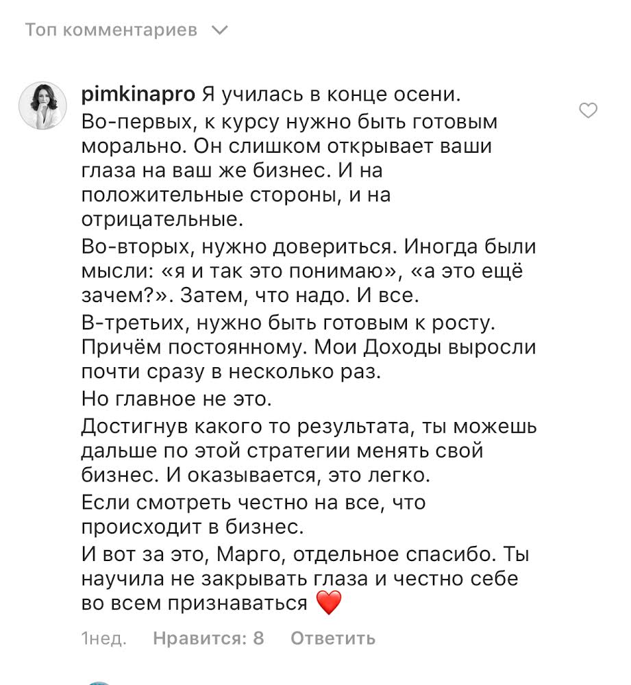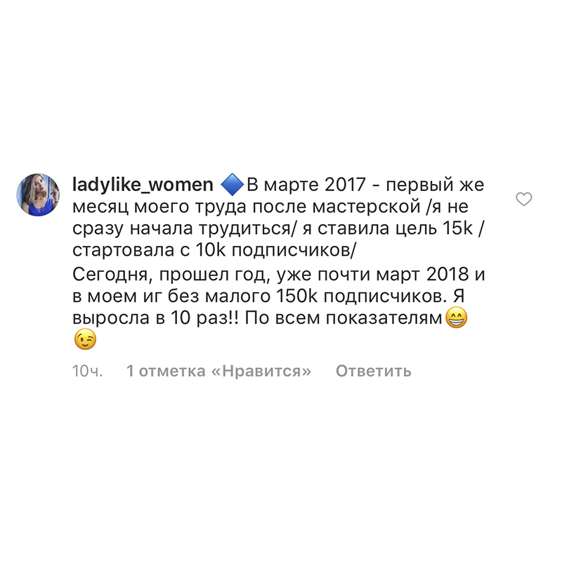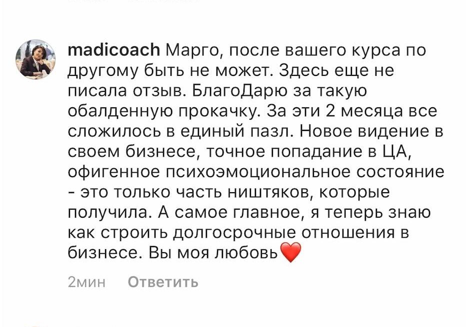 Проект мой стартовал с января, сейчас вышла на доход чуть больше 100 тр, но цель ставлю в 5 раз больше! И знаю, что благодаря тем знаниям, которые вы дали,я смогу легко этого достичь. Я вышла на свою ЦА, настолько комфортная для меня аудитория, ощущения что они это я.
