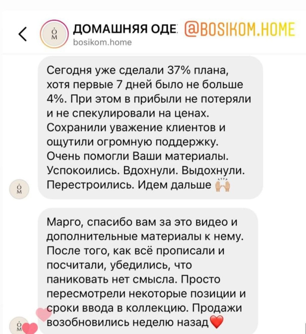 Но есть и такие примеры, которые лишний раз подтверждают, что паника — это не лучший советчик при принятии решений в кризисных ситуациях. Наши ученики, создатели Инстаграм проектов, которые построили систему продаж, чувствуют себя сегодня увереннее многих. Они перевыполняют планы продаж, осваивают новые каналы, выводят на рынок новые продукты. Они не только управляют ситуацией и не теряют своих позиций, но и готовы занимать освобождающиеся места в нише.