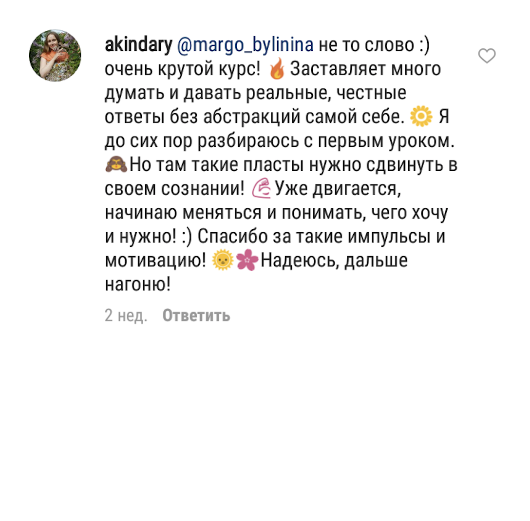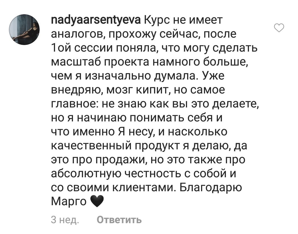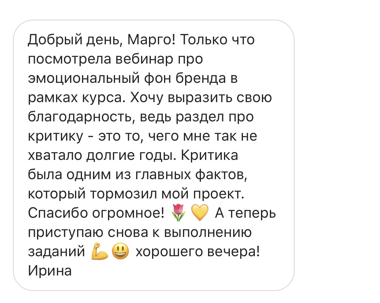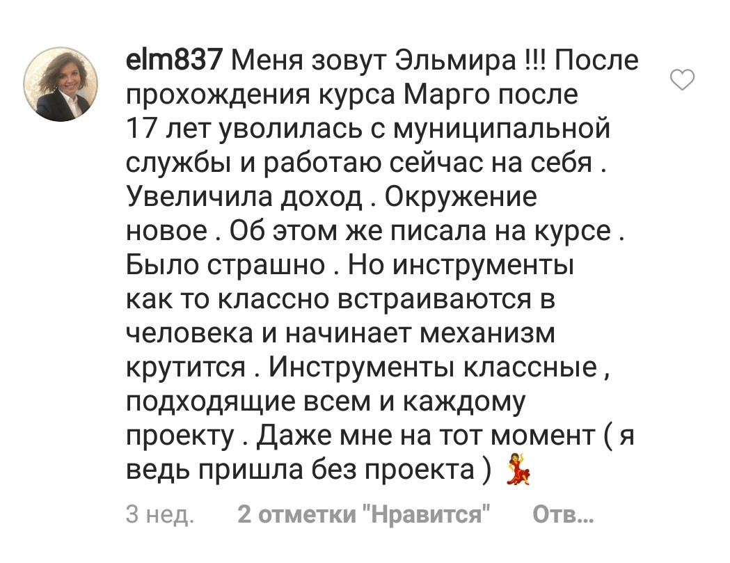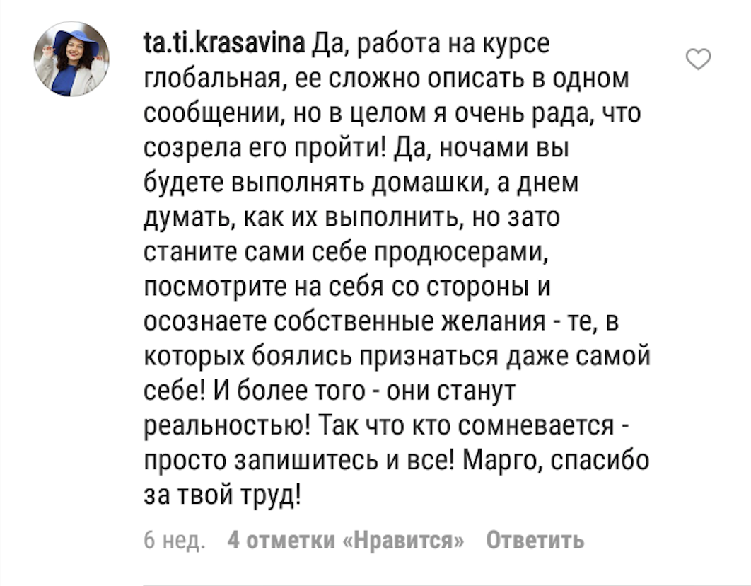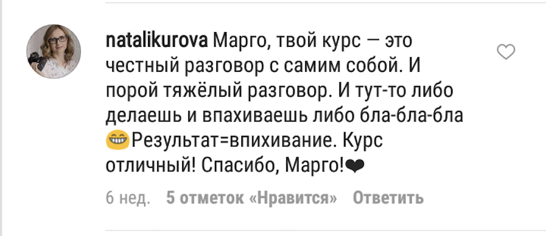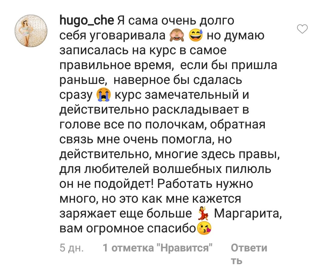 Спасибо Марго за этот курс! Марго помогла раскрыть мне себя.