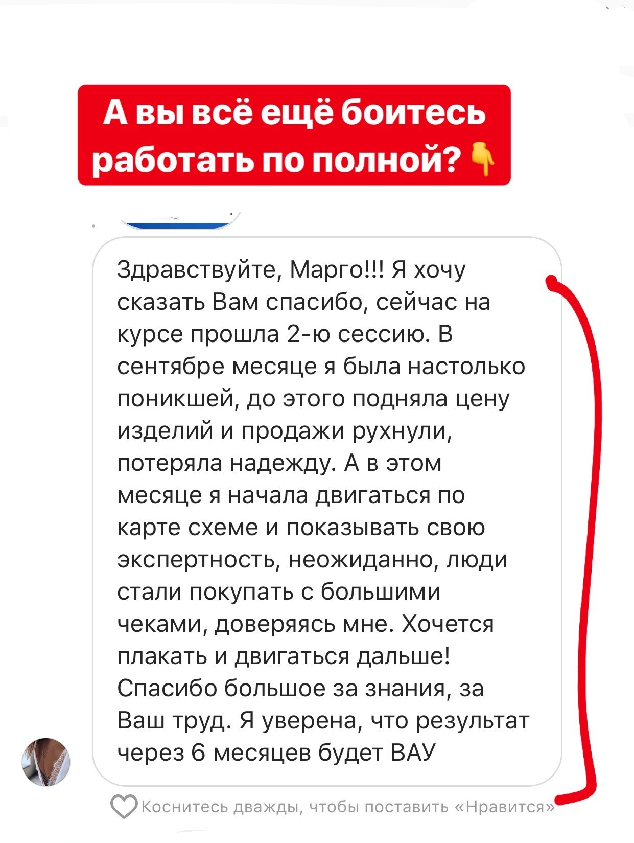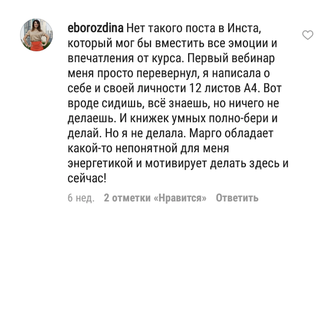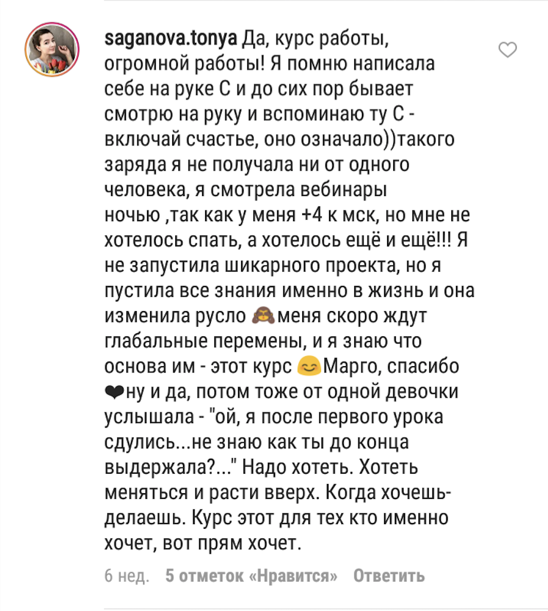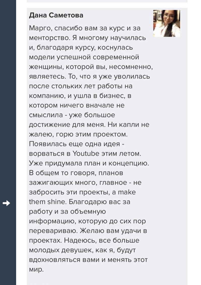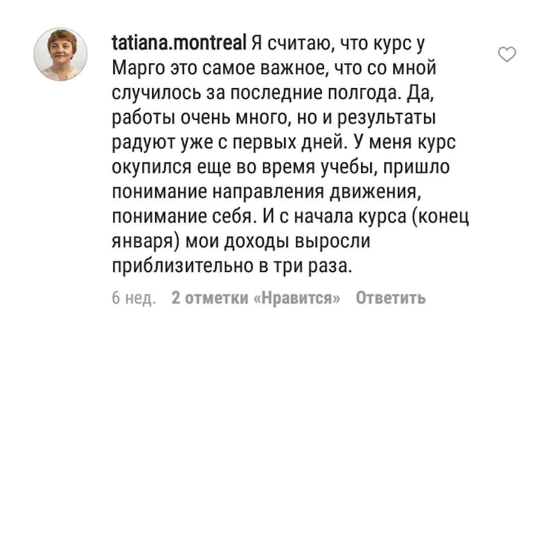 Спасибо Марго за этот курс! Марго помогла раскрыть мне себя.