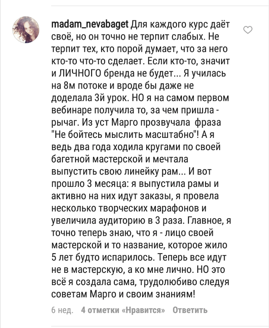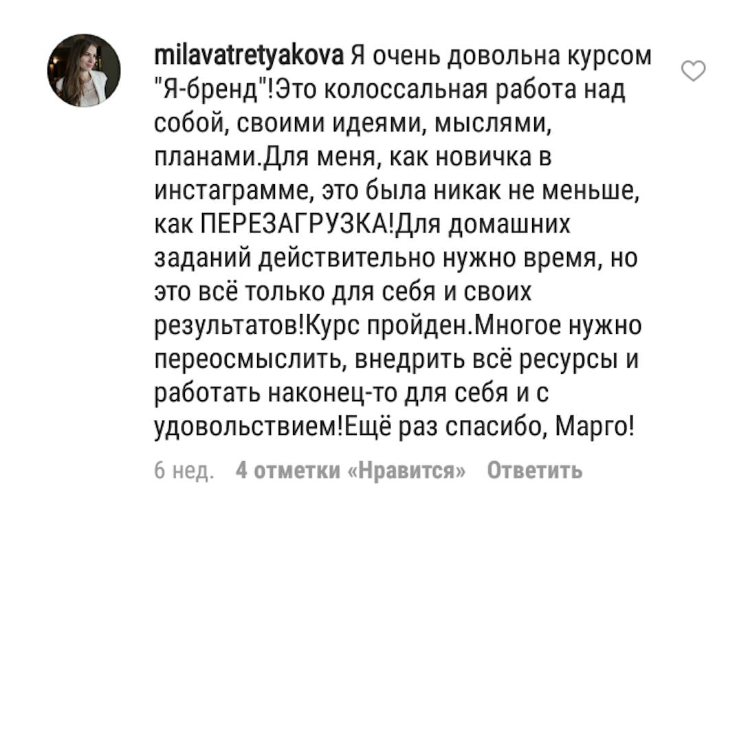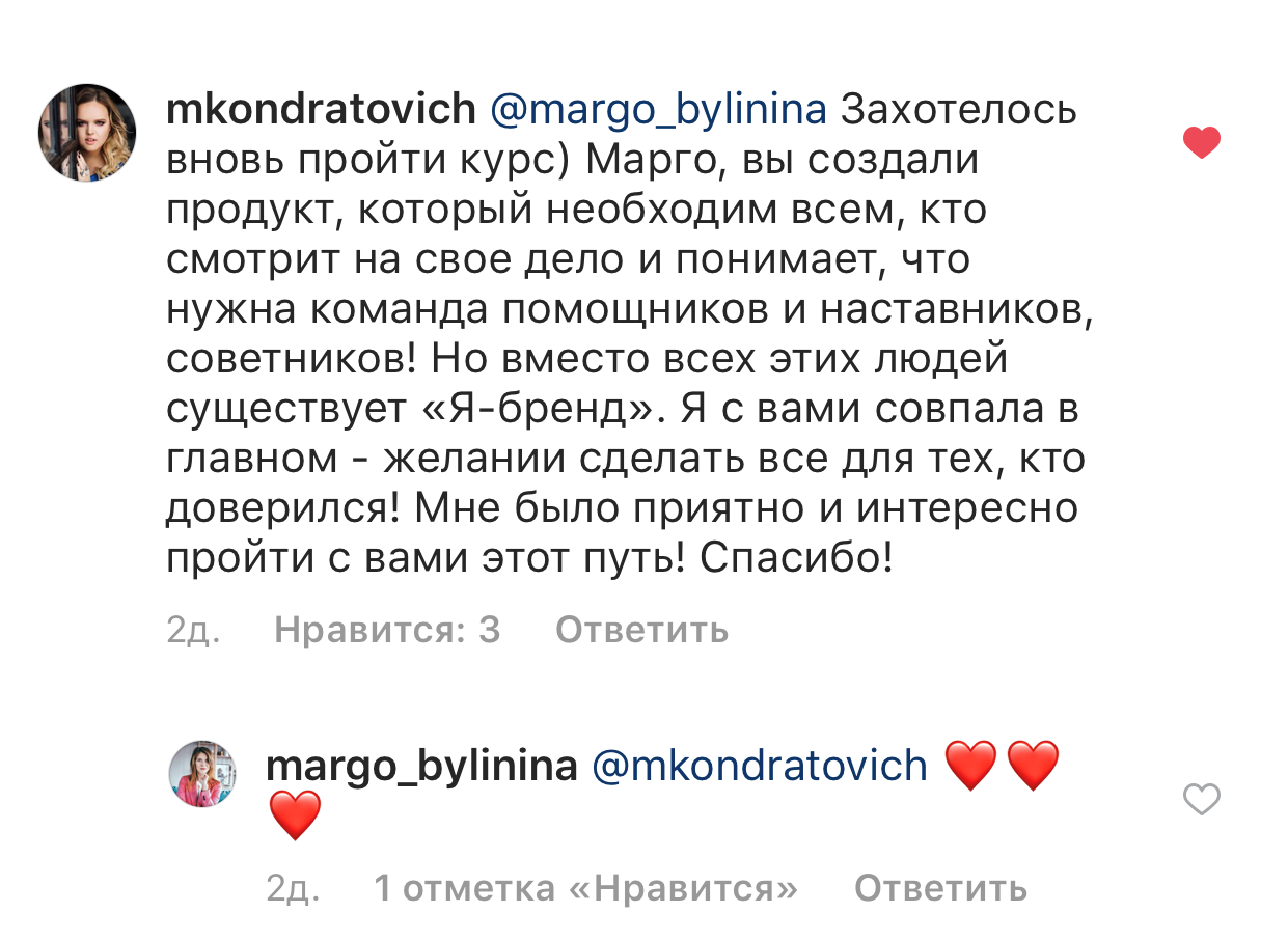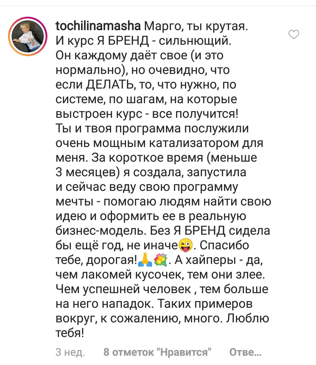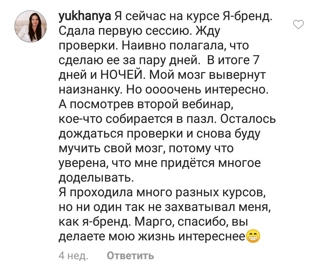 Я получила гораздо больше того, за чем я шла. Для меня самым ценным в курсе стало то, что Марго научила меня мечтать. Звучит глупо? Но поверьте, мечтать нужно учиться, нужно учиться видеть то, что ты по-настоящему хочешь. На курсе, у меня наконец-то хватило смелости признаться самой себе в том, чего же я по-настоящему хочу. Курс научил меня быть собой. Да, я, наконец, увидела и полюбила все свои достатки и не достоинства, ведь это часть меня, часть моего неповторимого бренда. Но, я не только научилась мечтать, я стала действовать, каждый день, шаг за шагом, строить свой бренд, лепить свое дело и ту жизнь, которой хочу жить именно я.