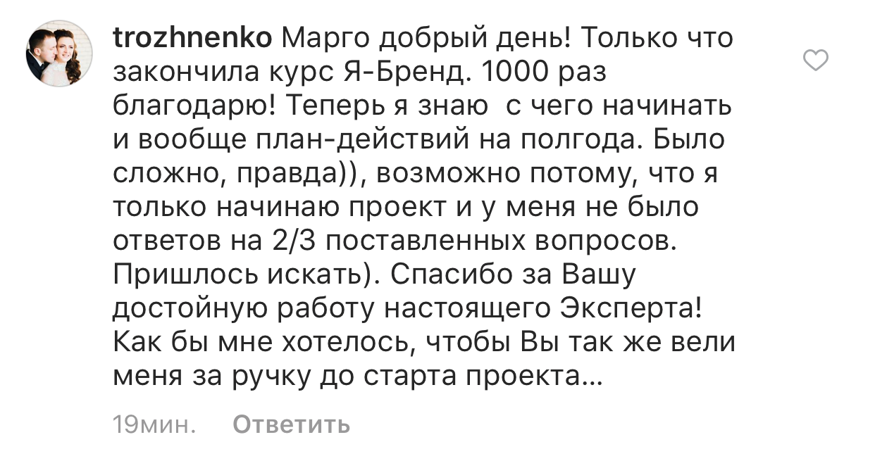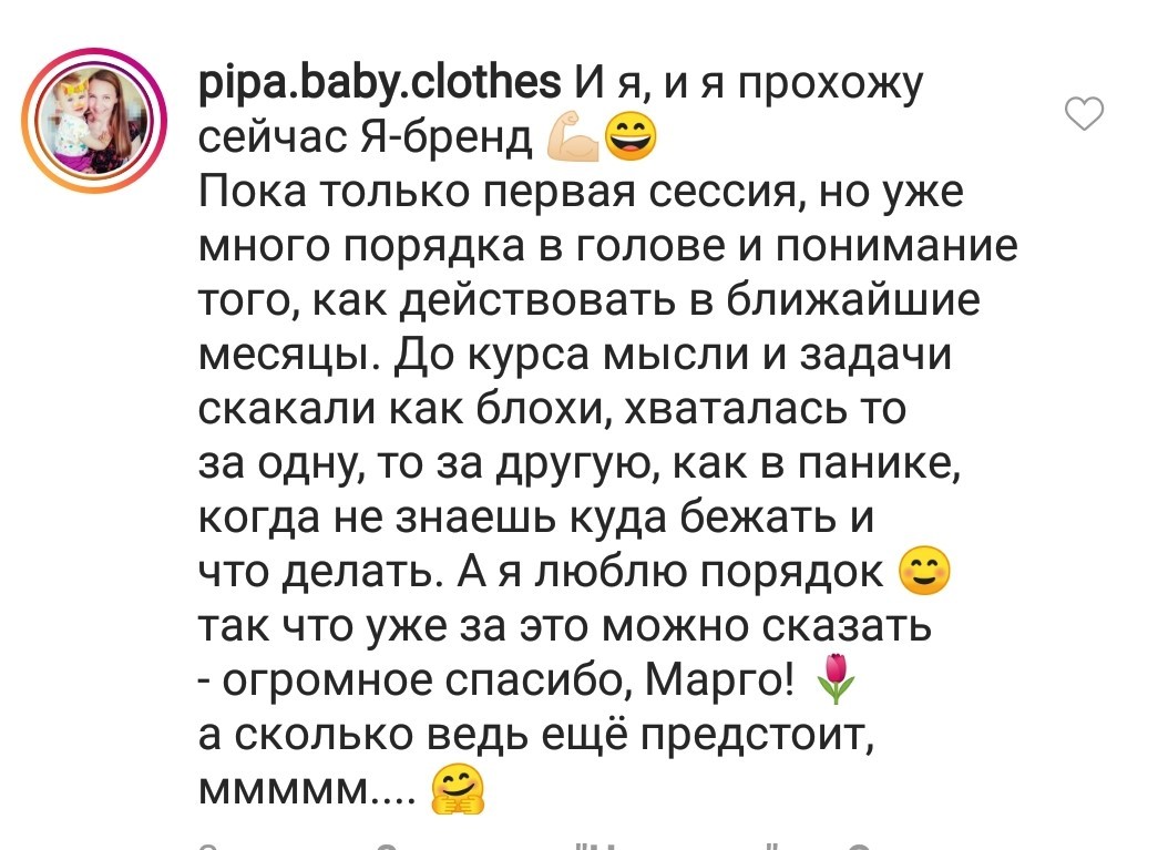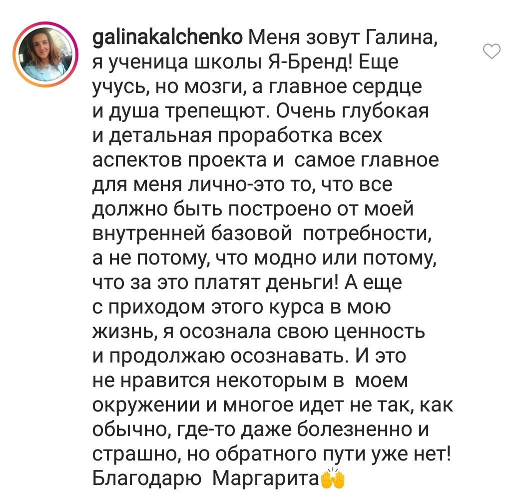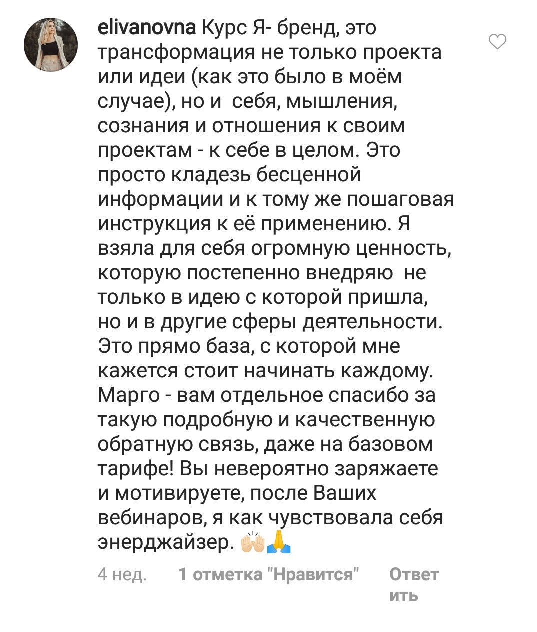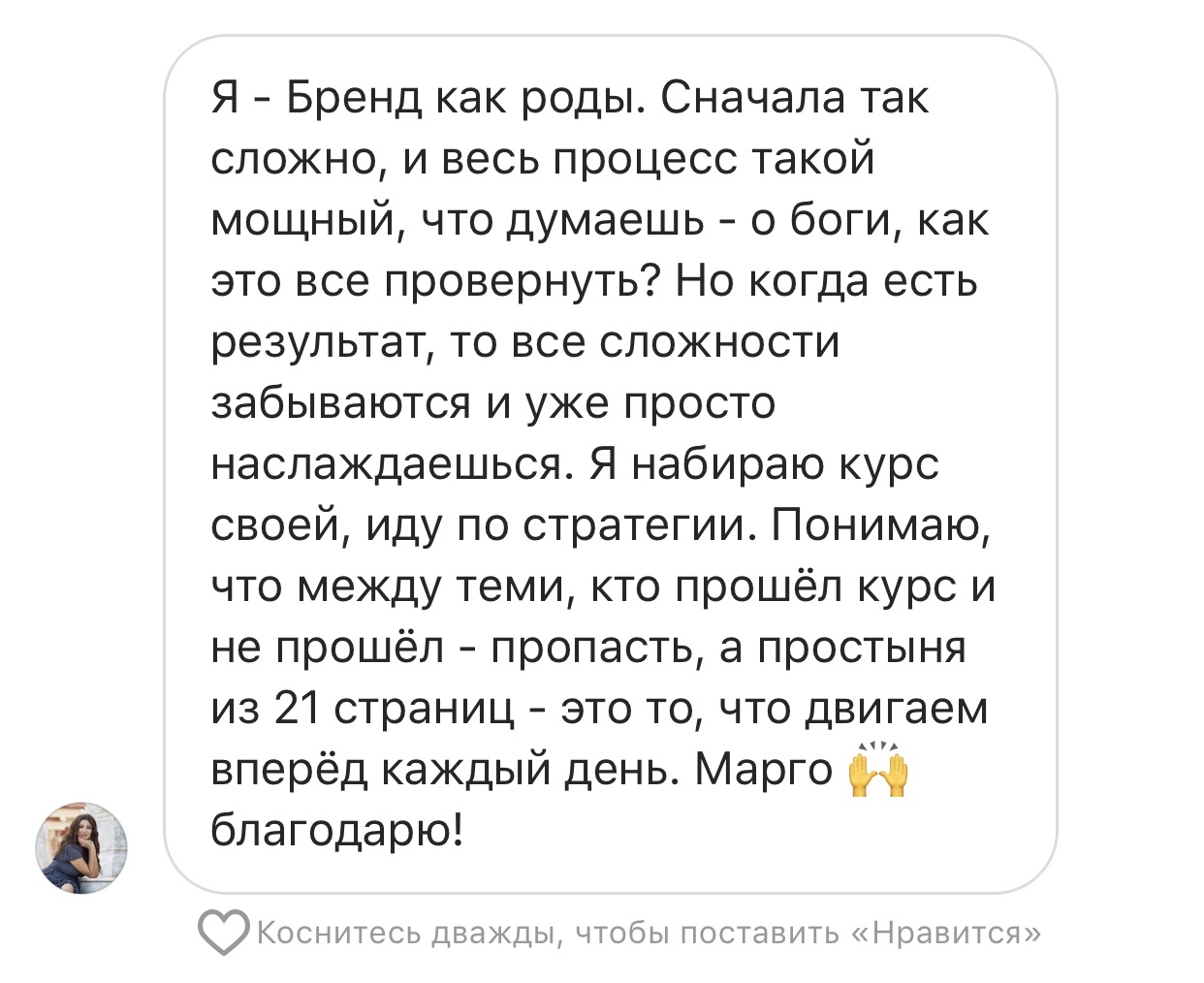Я получила гораздо больше того, за чем я шла. Для меня самым ценным в курсе стало то, что Марго научила меня мечтать. Звучит глупо? Но поверьте, мечтать нужно учиться, нужно учиться видеть то, что ты по-настоящему хочешь. На курсе, у меня наконец-то хватило смелости признаться самой себе в том, чего же я по-настоящему хочу. Курс научил меня быть собой. Да, я, наконец, увидела и полюбила все свои достатки и не достоинства, ведь это часть меня, часть моего неповторимого бренда. Но, я не только научилась мечтать, я стала действовать, каждый день, шаг за шагом, строить свой бренд, лепить свое дело и ту жизнь, которой хочу жить именно я.