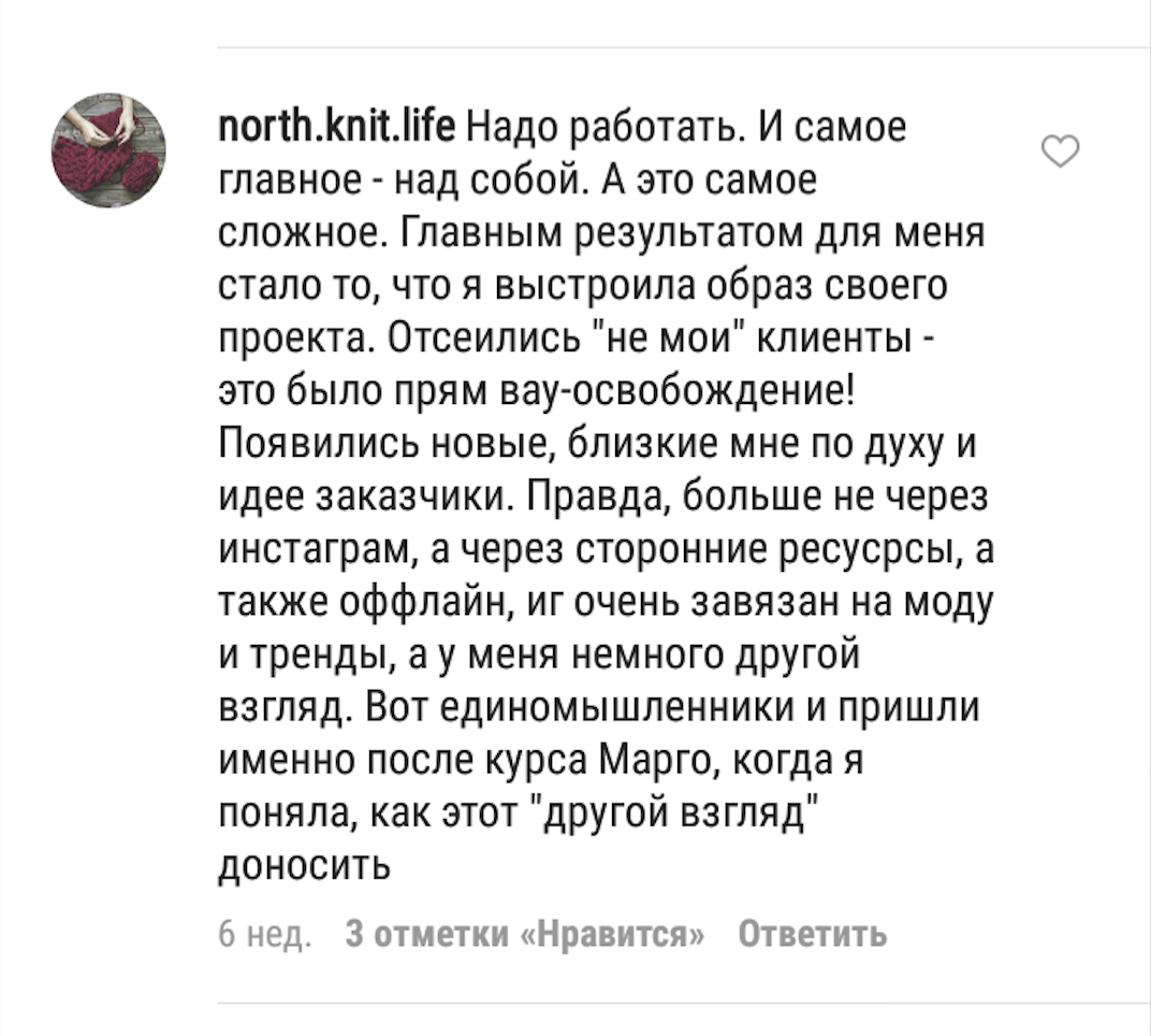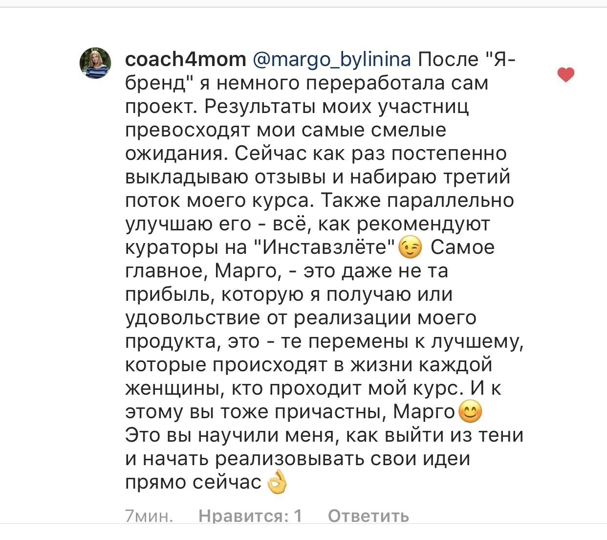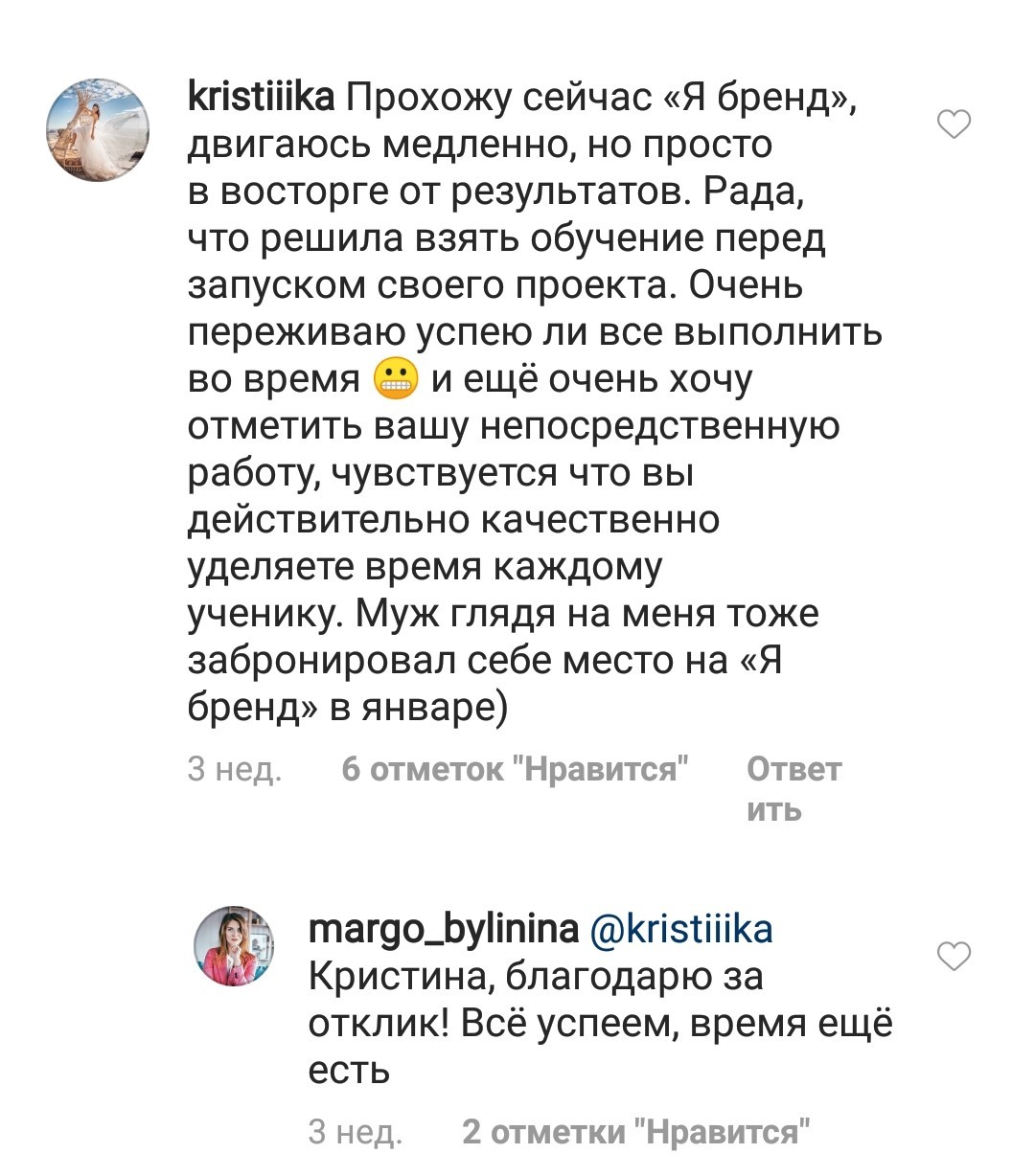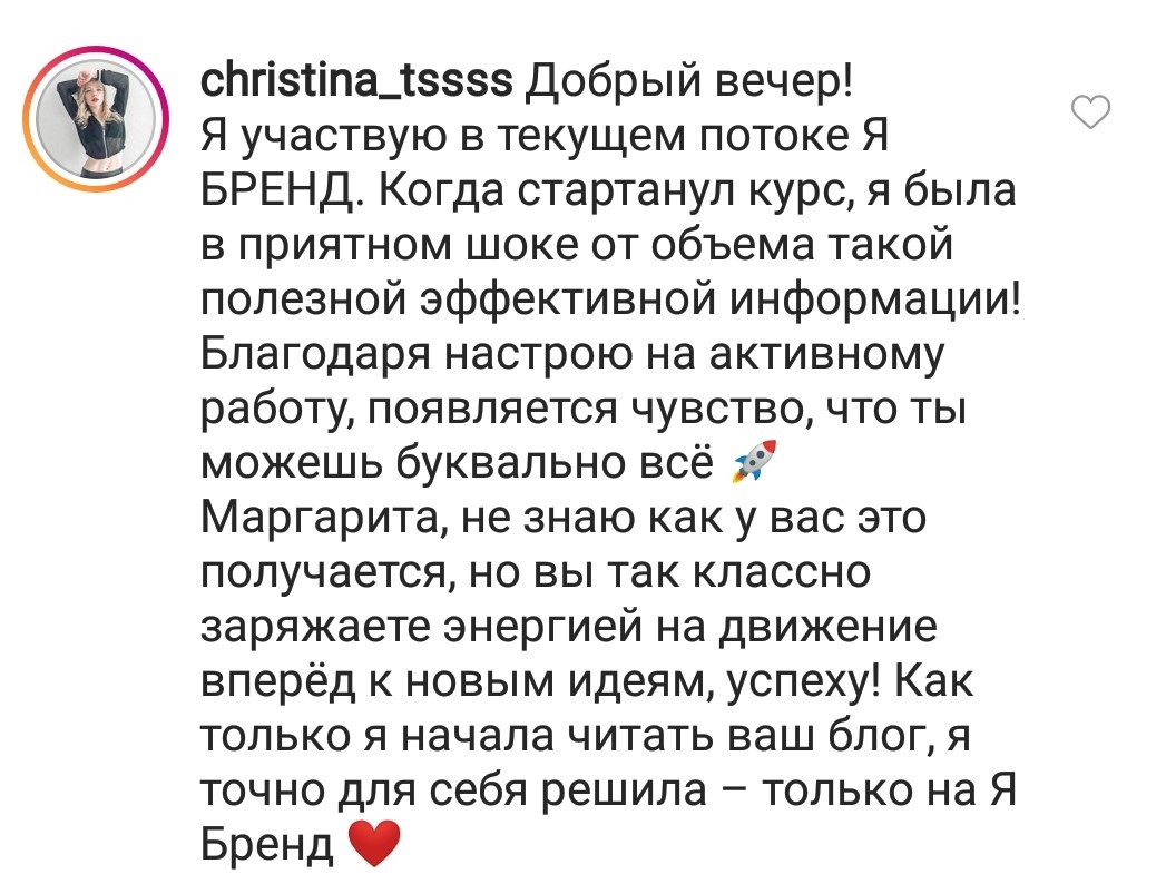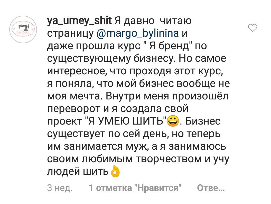 Я получила гораздо больше того, за чем я шла. Для меня самым ценным в курсе стало то, что Марго научила меня мечтать. Звучит глупо? Но поверьте, мечтать нужно учиться, нужно учиться видеть то, что ты по-настоящему хочешь. На курсе, у меня наконец-то хватило смелости признаться самой себе в том, чего же я по-настоящему хочу. Курс научил меня быть собой. Да, я, наконец, увидела и полюбила все свои достатки и не достоинства, ведь это часть меня, часть моего неповторимого бренда. Но, я не только научилась мечтать, я стала действовать, каждый день, шаг за шагом, строить свой бренд, лепить свое дело и ту жизнь, которой хочу жить именно я.