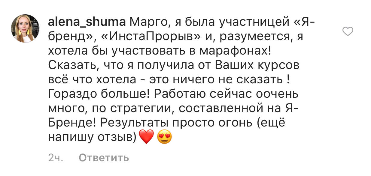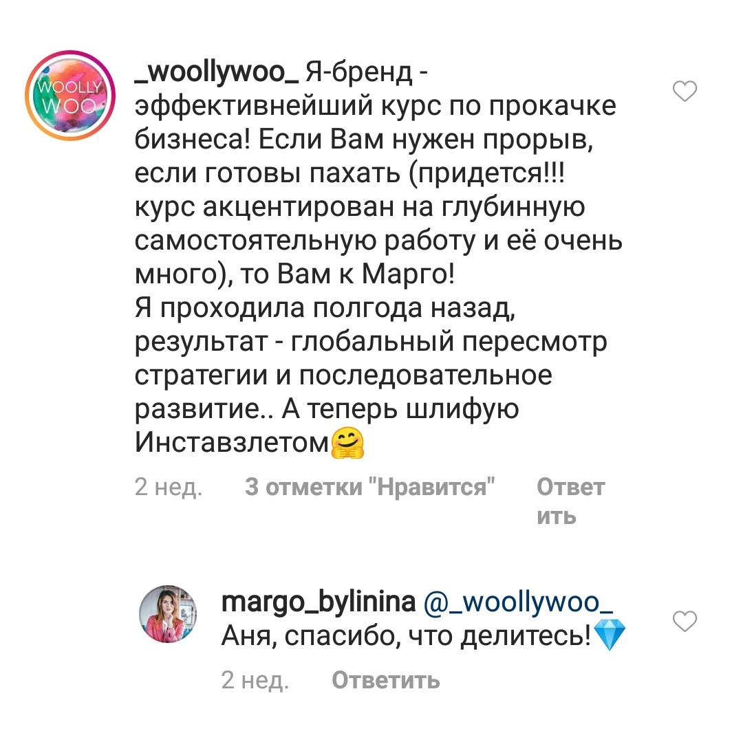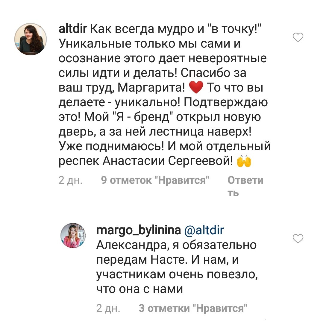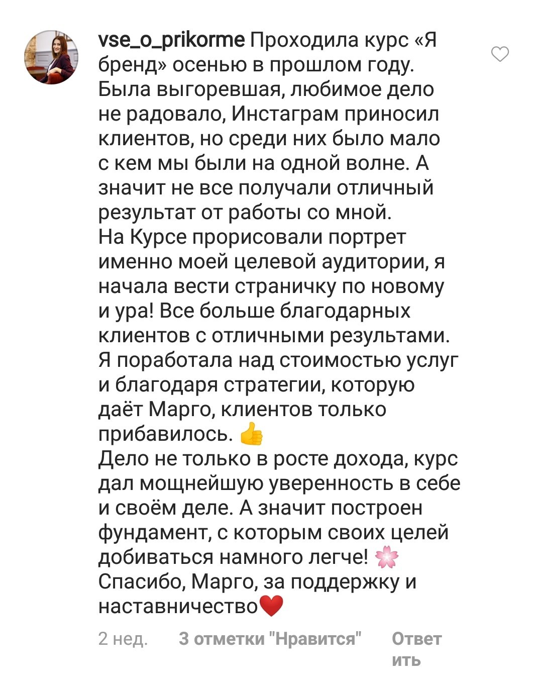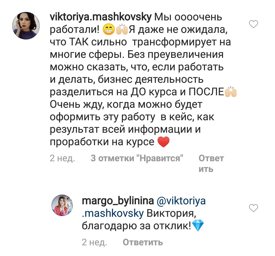 Я получила гораздо больше того, за чем я шла. Для меня самым ценным в курсе стало то, что Марго научила меня мечтать. Звучит глупо? Но поверьте, мечтать нужно учиться, нужно учиться видеть то, что ты по-настоящему хочешь. На курсе, у меня наконец-то хватило смелости признаться самой себе в том, чего же я по-настоящему хочу. Курс научил меня быть собой. Да, я, наконец, увидела и полюбила все свои достатки и не достоинства, ведь это часть меня, часть моего неповторимого бренда. Но, я не только научилась мечтать, я стала действовать, каждый день, шаг за шагом, строить свой бренд, лепить свое дело и ту жизнь, которой хочу жить именно я.