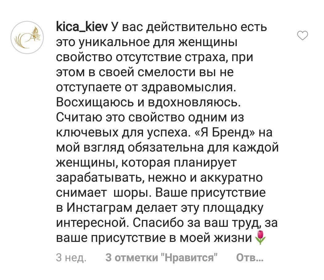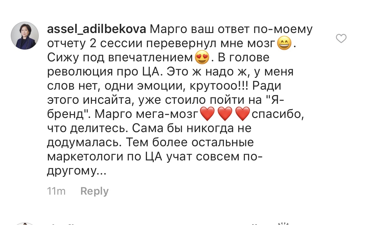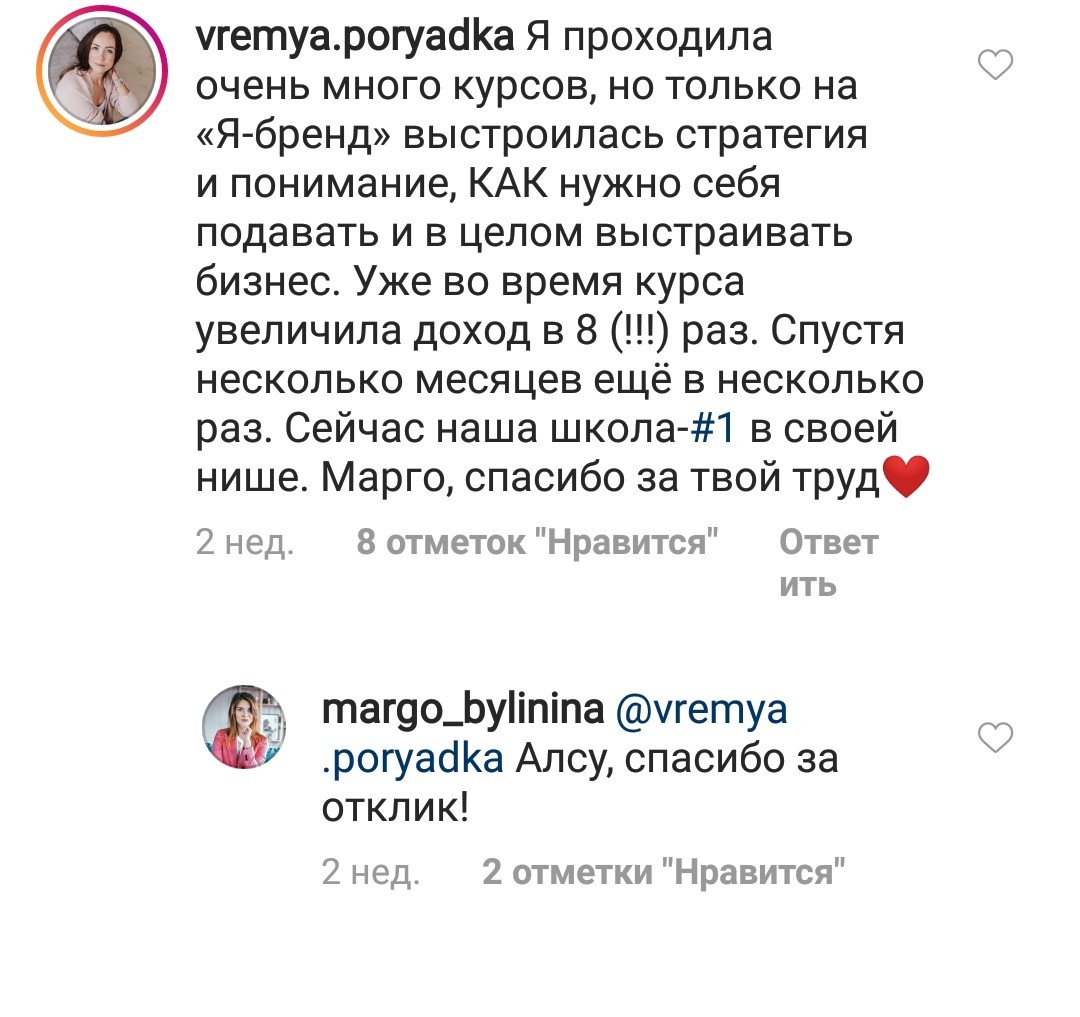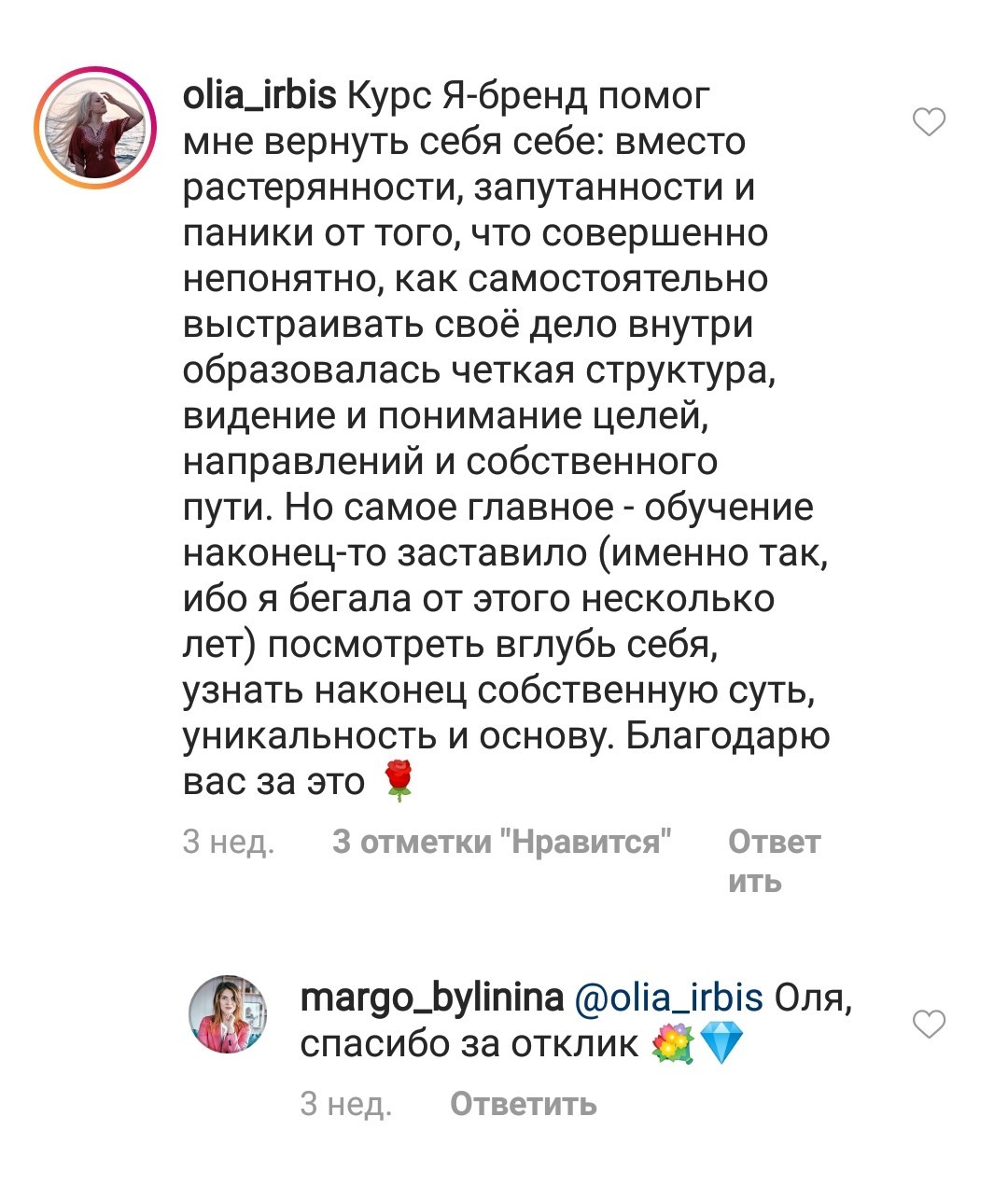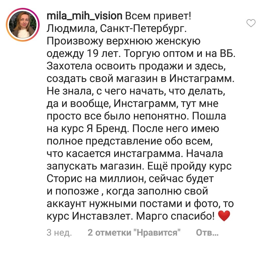 Я получила гораздо больше того, за чем я шла. Для меня самым ценным в курсе стало то, что Марго научила меня мечтать. Звучит глупо? Но поверьте, мечтать нужно учиться, нужно учиться видеть то, что ты по-настоящему хочешь. На курсе, у меня наконец-то хватило смелости признаться самой себе в том, чего же я по-настоящему хочу. Курс научил меня быть собой. Да, я, наконец, увидела и полюбила все свои достатки и не достоинства, ведь это часть меня, часть моего неповторимого бренда. Но, я не только научилась мечтать, я стала действовать, каждый день, шаг за шагом, строить свой бренд, лепить свое дело и ту жизнь, которой хочу жить именно я.