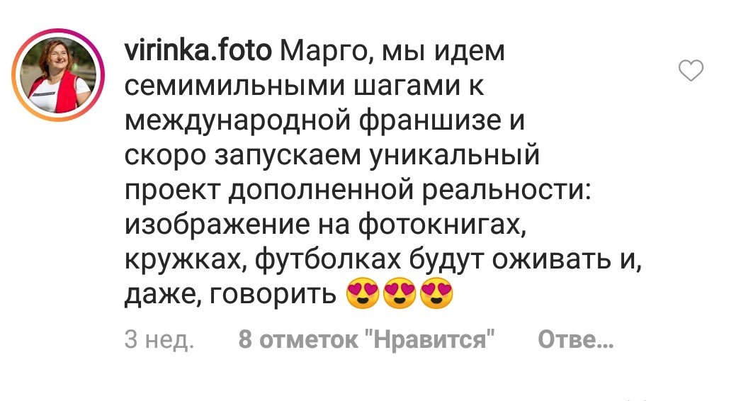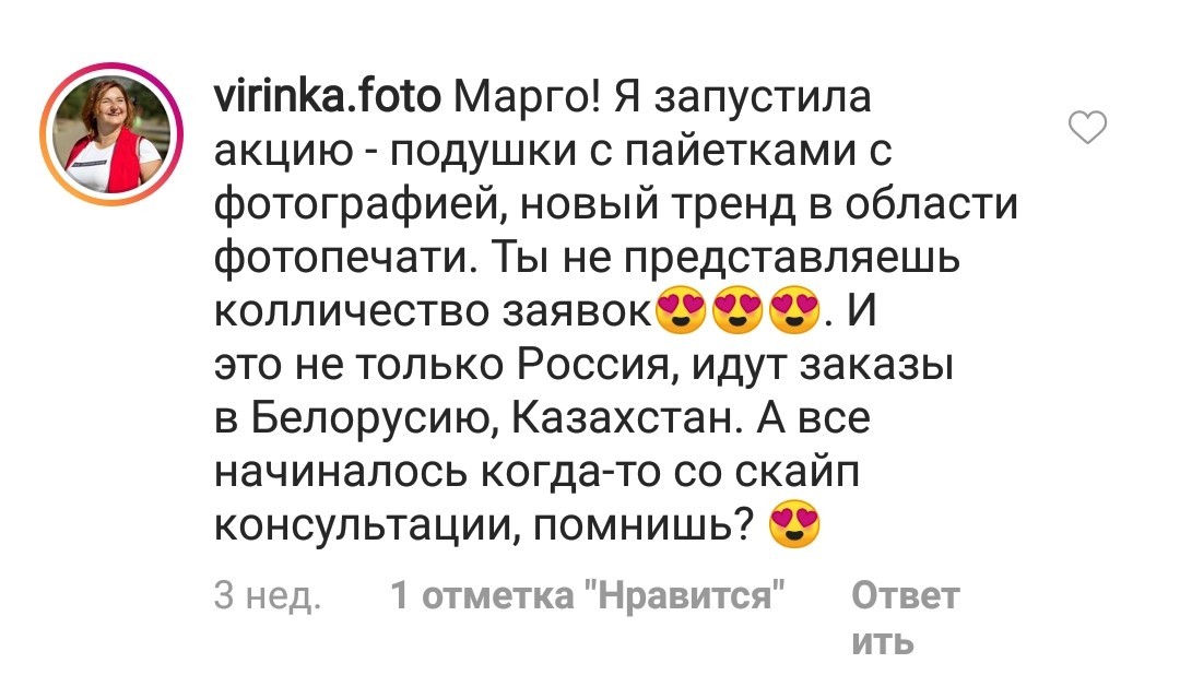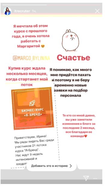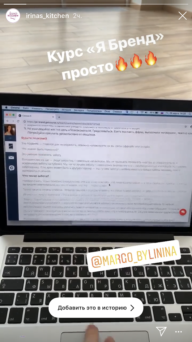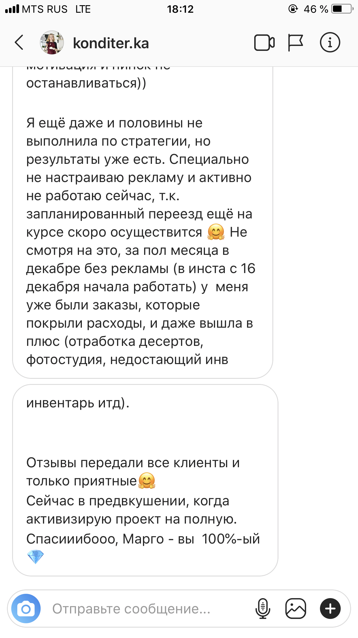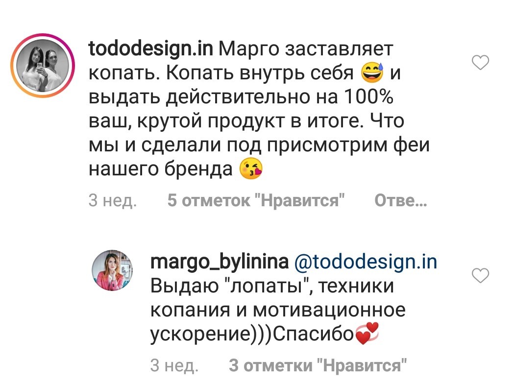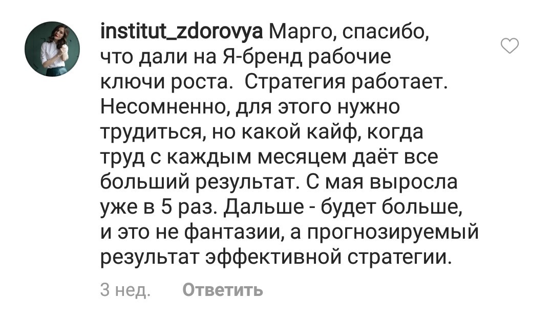 Я получила гораздо больше того, за чем я шла. Для меня самым ценным в курсе стало то, что Марго научила меня мечтать. Звучит глупо? Но поверьте, мечтать нужно учиться, нужно учиться видеть то, что ты по-настоящему хочешь. На курсе, у меня наконец-то хватило смелости признаться самой себе в том, чего же я по-настоящему хочу. Курс научил меня быть собой. Да, я, наконец, увидела и полюбила все свои достатки и не достоинства, ведь это часть меня, часть моего неповторимого бренда. Но, я не только научилась мечтать, я стала действовать, каждый день, шаг за шагом, строить свой бренд, лепить свое дело и ту жизнь, которой хочу жить именно я.