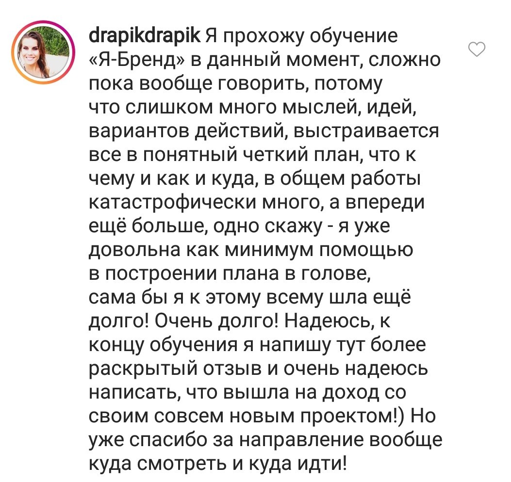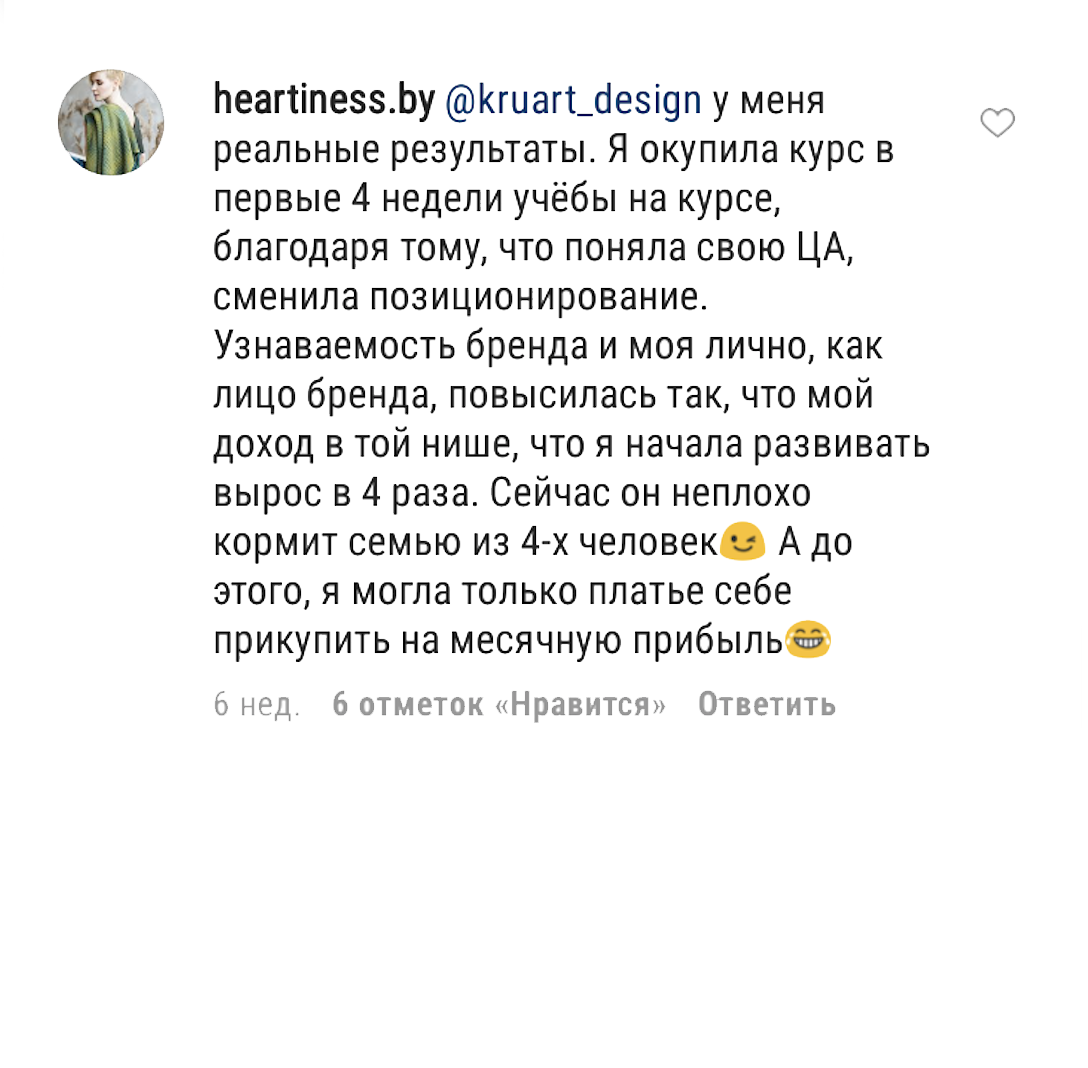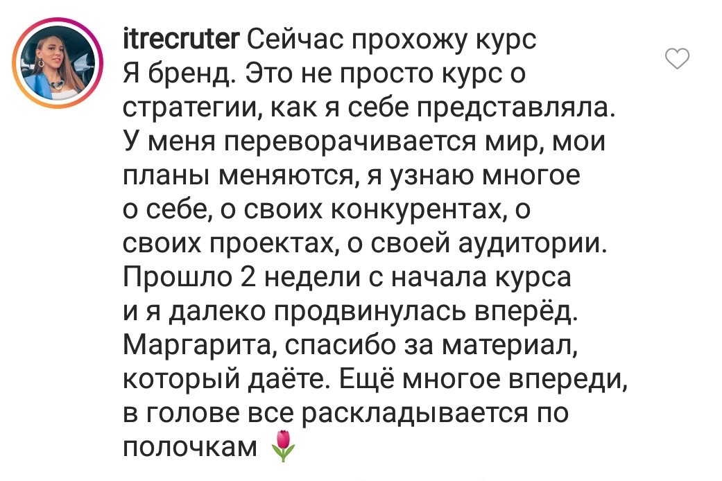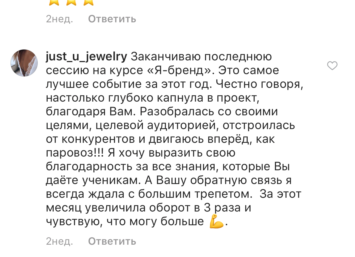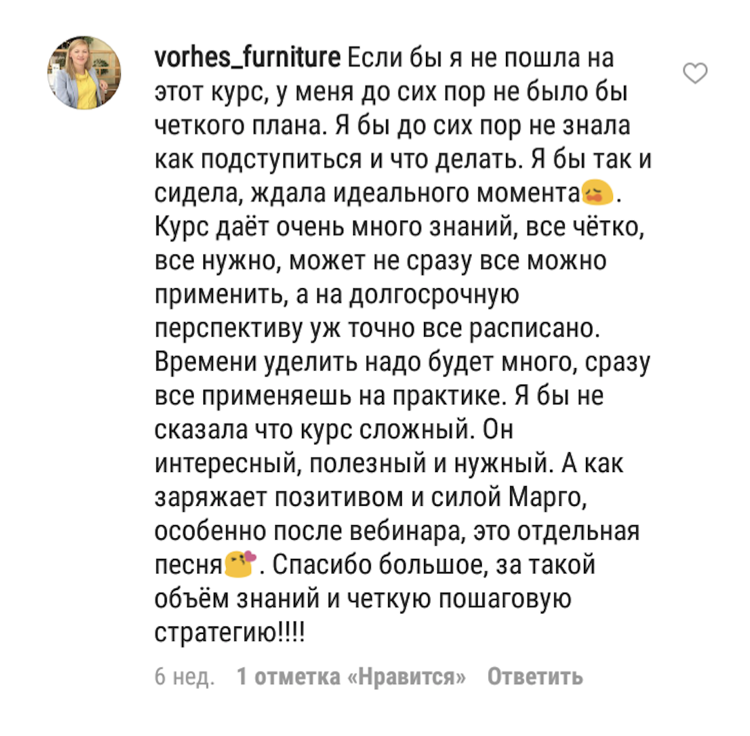 Курс был наполнен не только теорией, но и практикой. Бывало я ночами сидела за домашними заданиями, но именно это и дало результат. Помимо основных тем, было множество дополнительной информации, которая оказалась невероятно ценной. И, конечно, на курсе я получила множество современных инструментов для построения и продвижения своего бренда, технические моменты, которых я так боялась, теперь даются мне гораздо легче. Мои проекты приобрели очертания и каждый день набирают все больше и больше силы.
