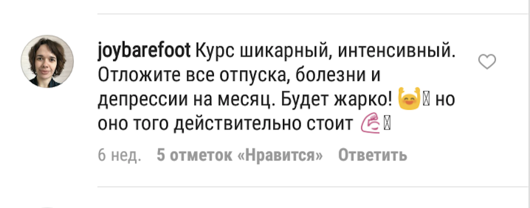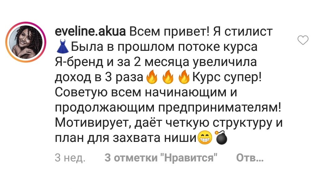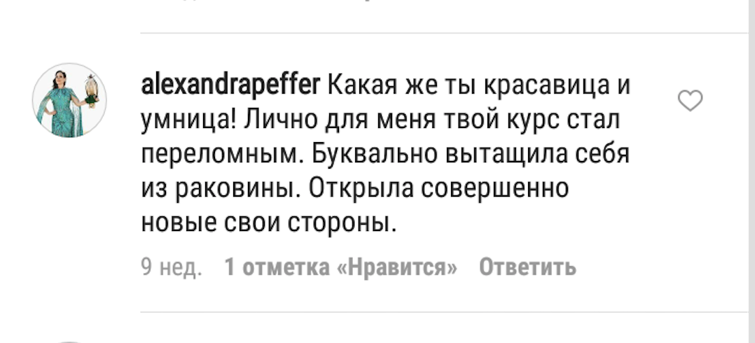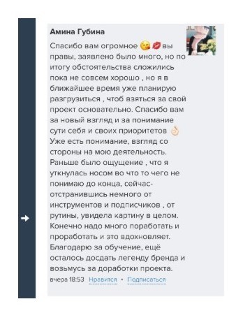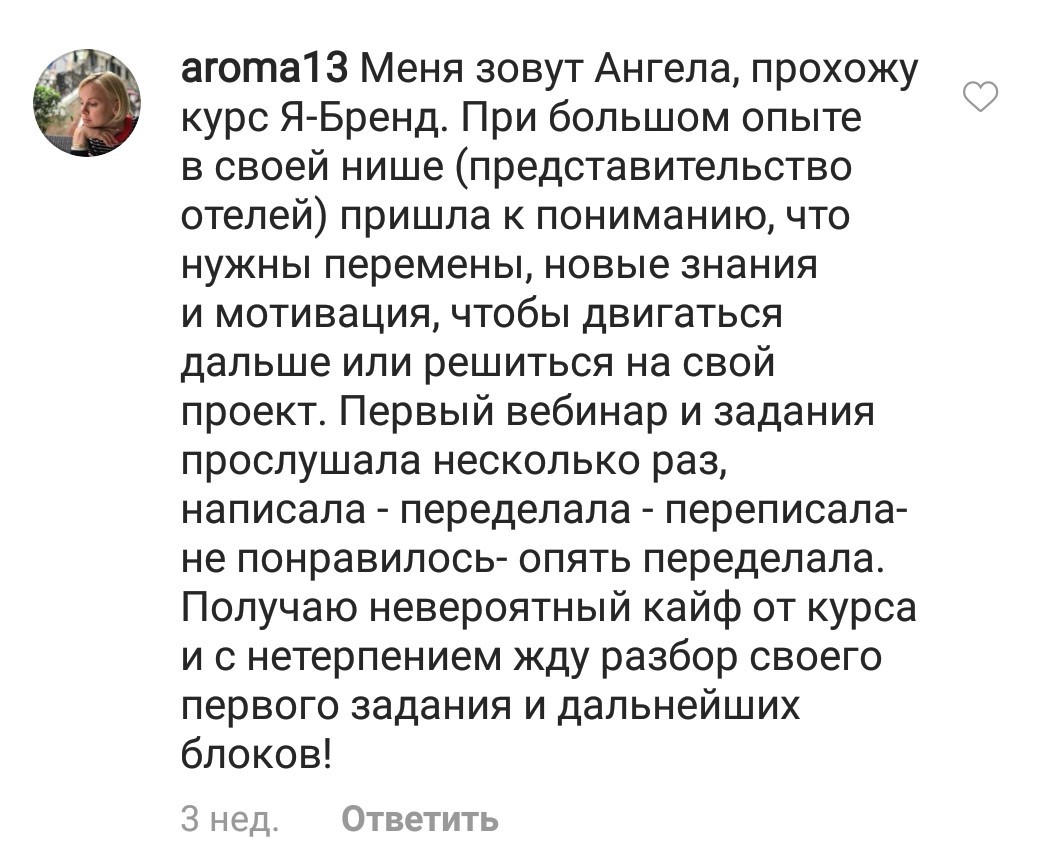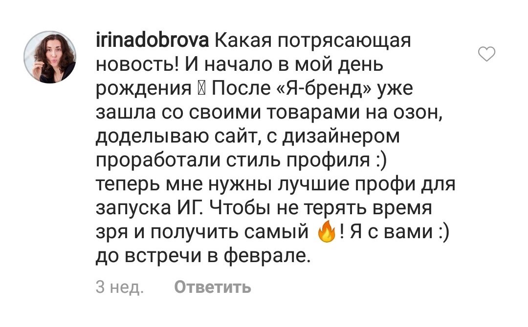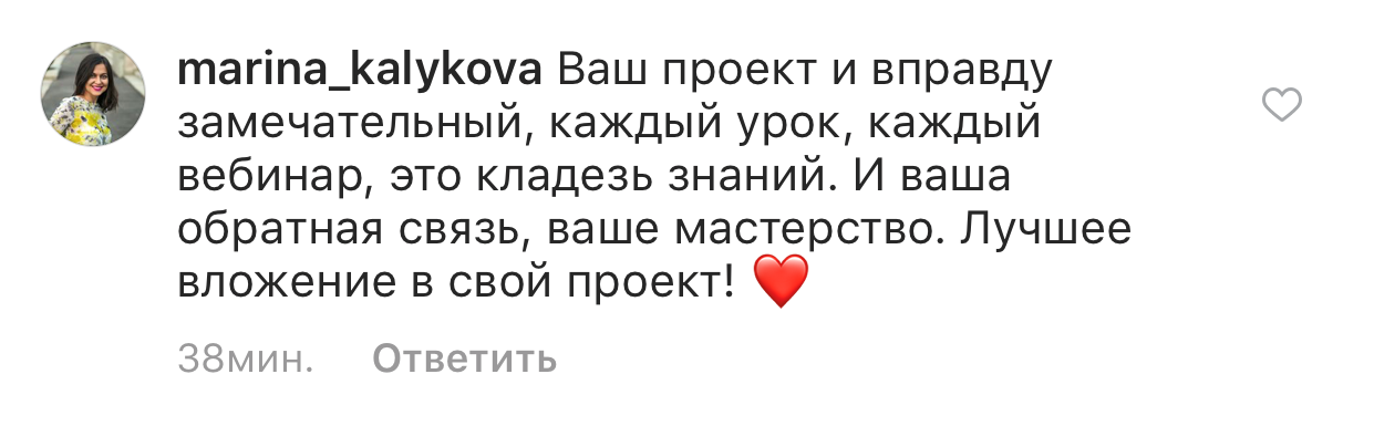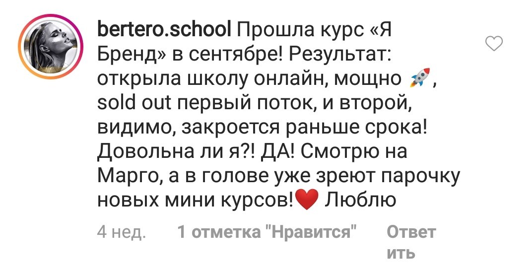 Курс был наполнен не только теорией, но и практикой. Бывало я ночами сидела за домашними заданиями, но именно это и дало результат. Помимо основных тем, было множество дополнительной информации, которая оказалась невероятно ценной. И, конечно, на курсе я получила множество современных инструментов для построения и продвижения своего бренда, технические моменты, которых я так боялась, теперь даются мне гораздо легче. Мои проекты приобрели очертания и каждый день набирают все больше и больше силы.