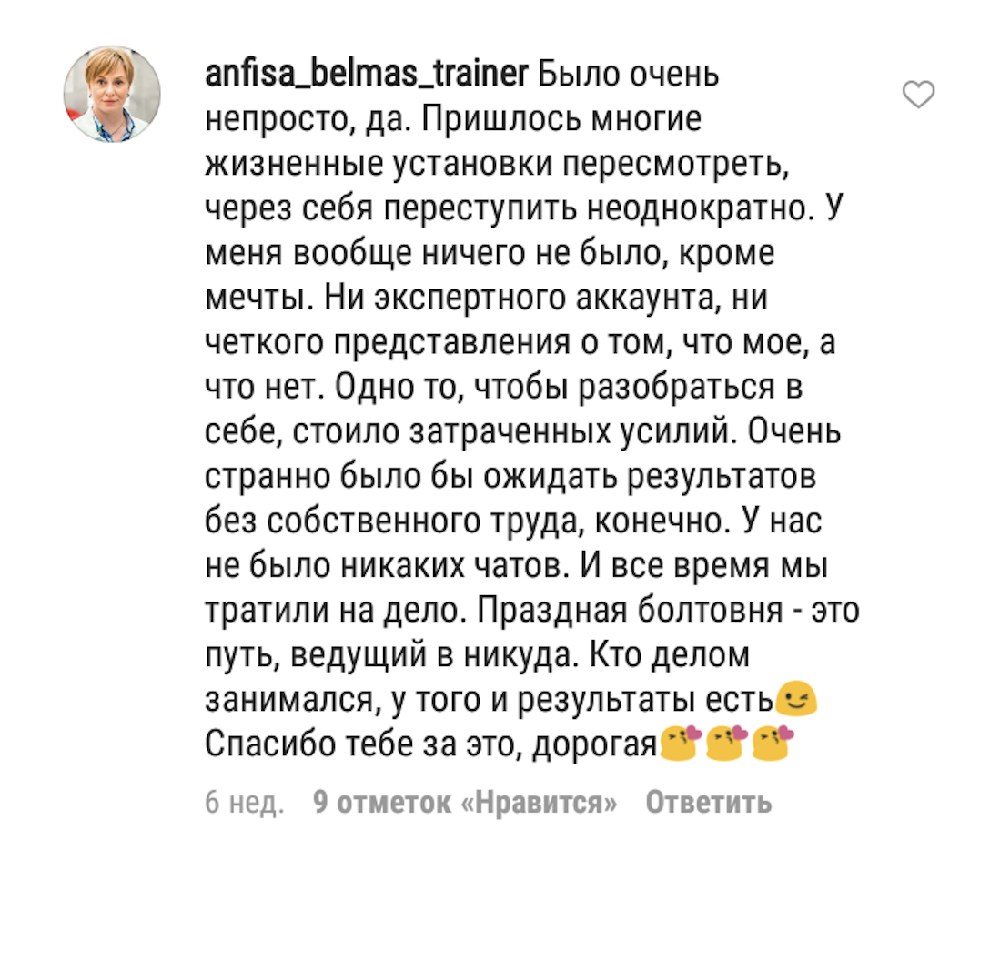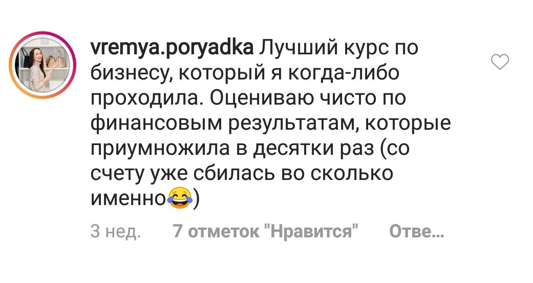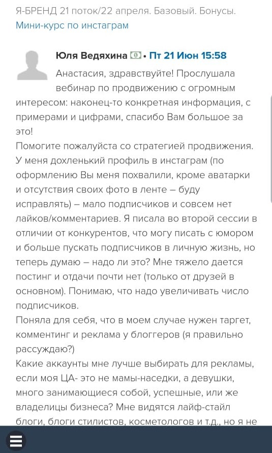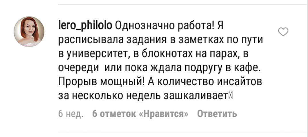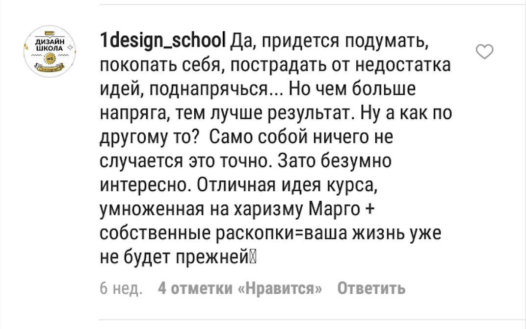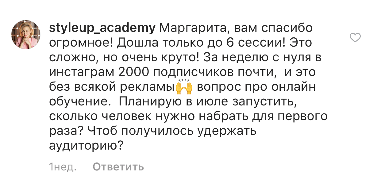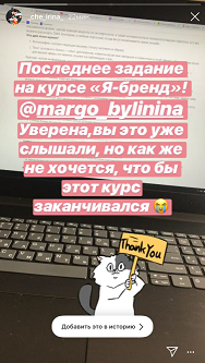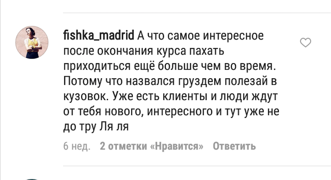 Курс был наполнен не только теорией, но и практикой. Бывало я ночами сидела за домашними заданиями, но именно это и дало результат. Помимо основных тем, было множество дополнительной информации, которая оказалась невероятно ценной. И, конечно, на курсе я получила множество современных инструментов для построения и продвижения своего бренда, технические моменты, которых я так боялась, теперь даются мне гораздо легче. Мои проекты приобрели очертания и каждый день набирают все больше и больше силы.