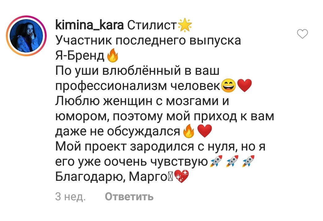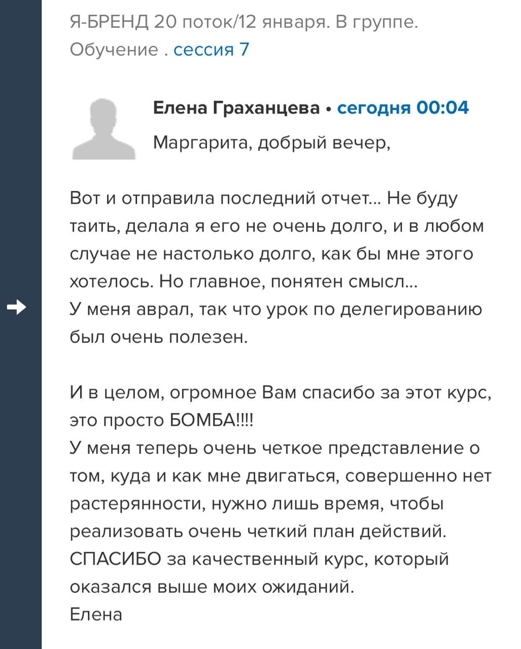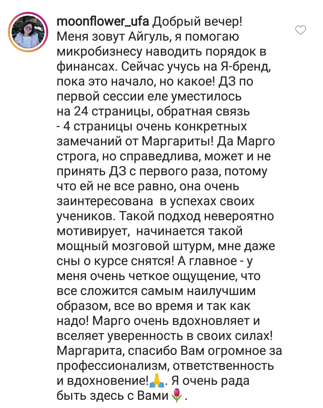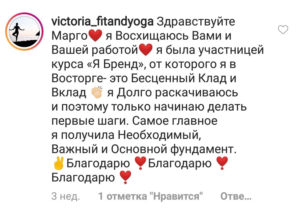 С момента обучения прошло уже несколько месяцев, но пишу свой отзыв только сейчас. Я сознательно дала своим эмоциям стихнуть и посмотреть, ну а что же будет дальше, на долго ли хватит запала. Могу сказать, что с каждым днем я все больше вхожу во вкус, знания укладываются, теория воплощается в практику и я вижу свои первые результаты. Марго стала для меня тем самым наставником и вдохновителем, и она появилась именно в тот момент, когда это было нужно. А фото Марго в ленте каждый раз напоминает мне о моей мечте, и я с радостью иду к ней дальше. Марго научила меня говорить, говорить о себе, своих желаниях, своей мечте и любимом деле. Теперь точно могу сказать Я – бренд
