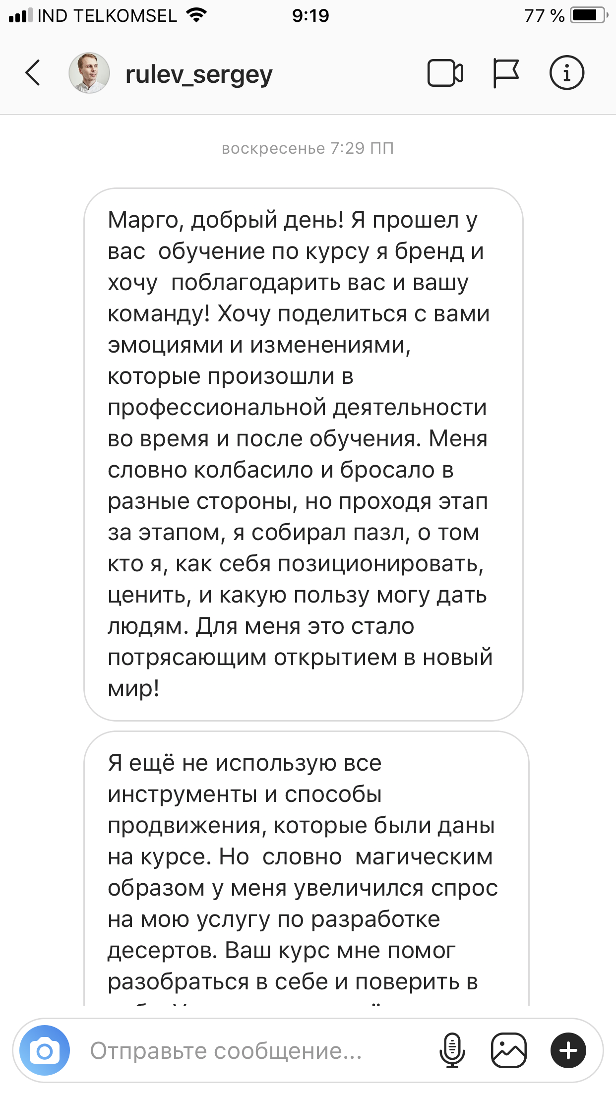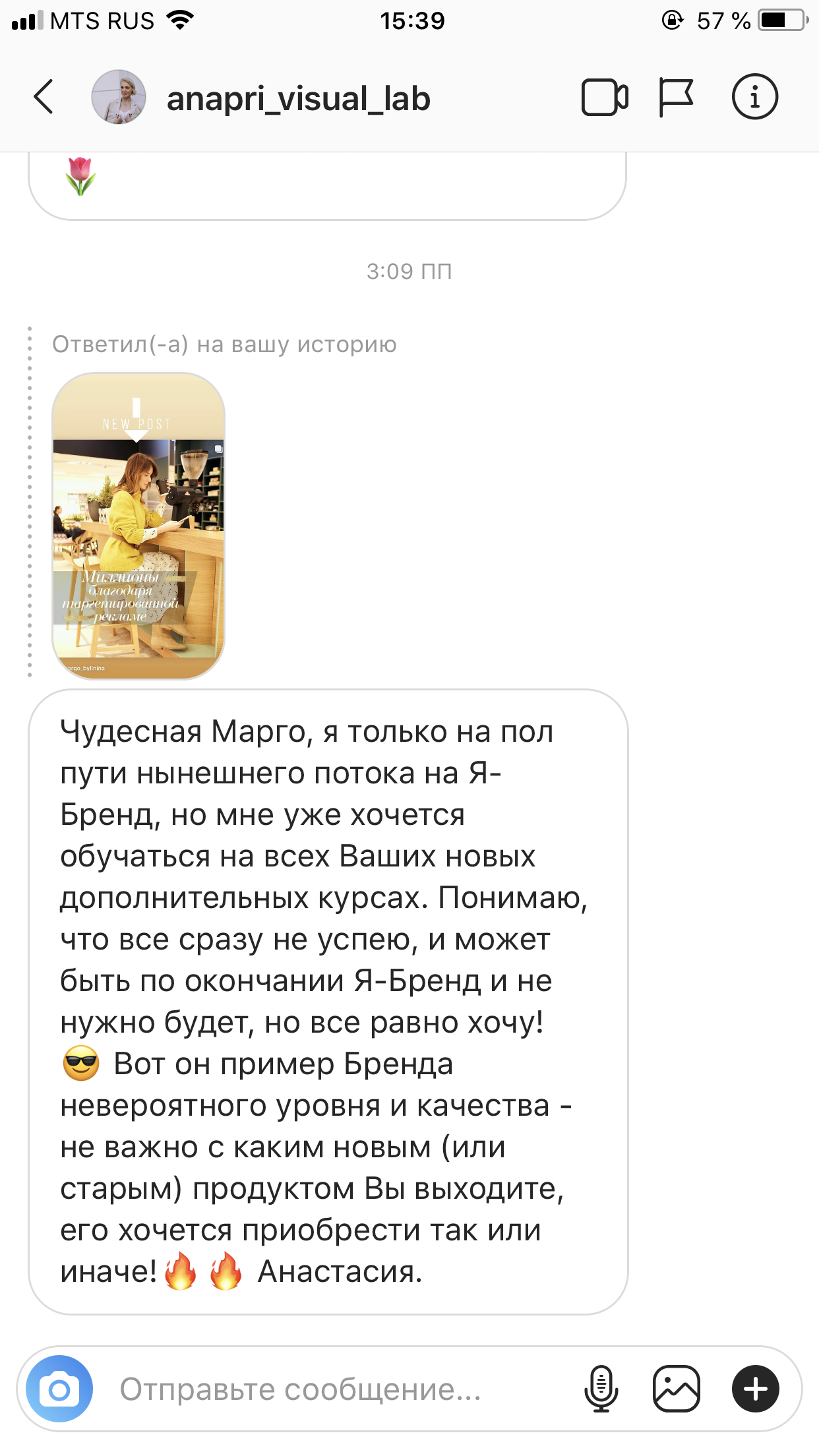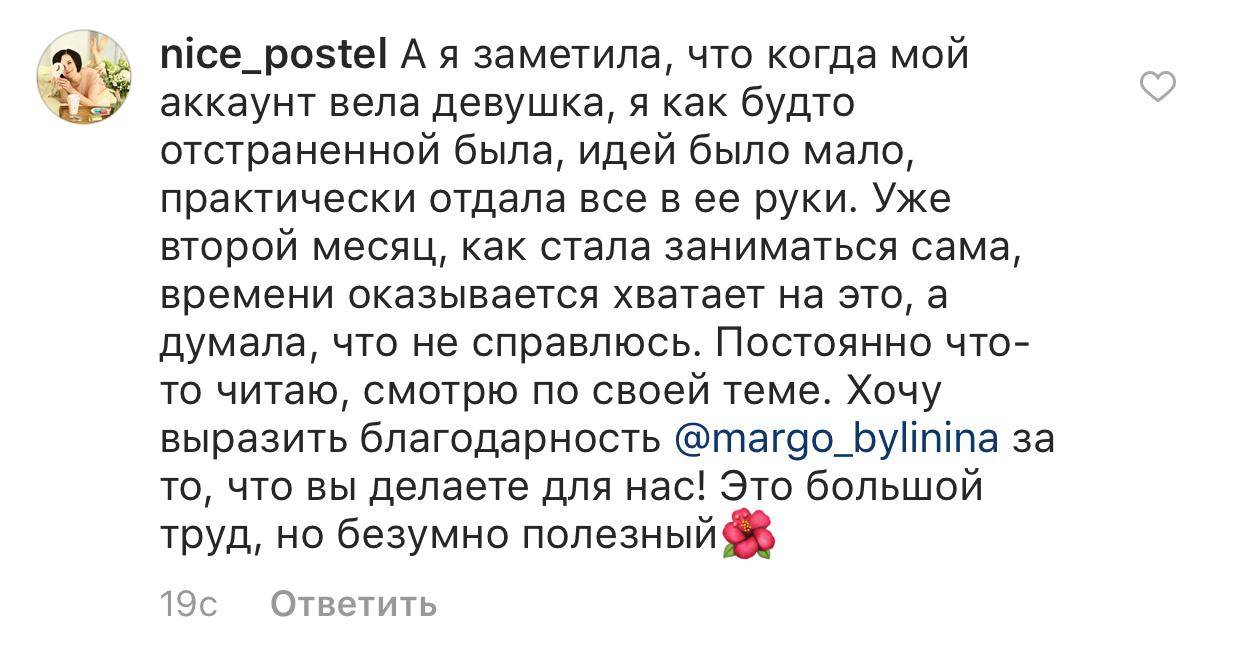 С момента обучения прошло уже несколько месяцев, но пишу свой отзыв только сейчас. Я сознательно дала своим эмоциям стихнуть и посмотреть, ну а что же будет дальше, на долго ли хватит запала. Могу сказать, что с каждым днем я все больше вхожу во вкус, знания укладываются, теория воплощается в практику и я вижу свои первые результаты. Марго стала для меня тем самым наставником и вдохновителем, и она появилась именно в тот момент, когда это было нужно. А фото Марго в ленте каждый раз напоминает мне о моей мечте, и я с радостью иду к ней дальше. Марго научила меня говорить, говорить о себе, своих желаниях, своей мечте и любимом деле. Теперь точно могу сказать Я – бренд