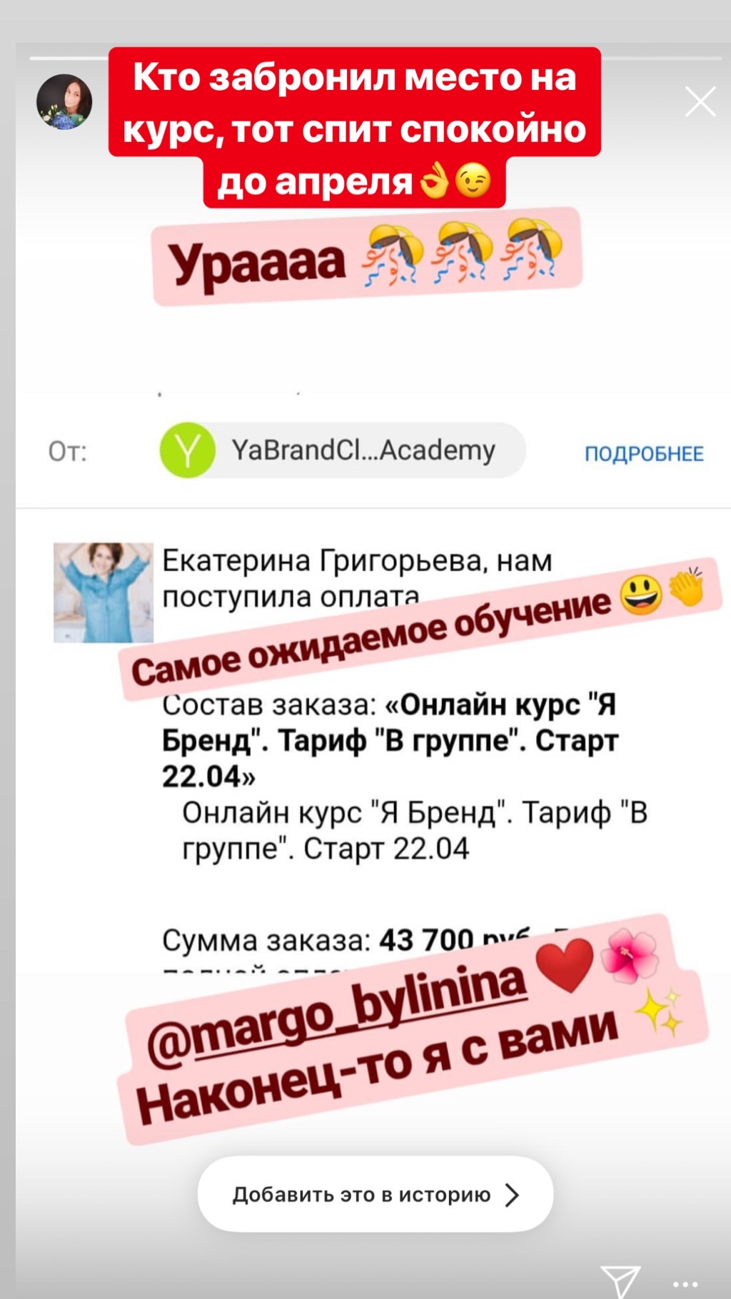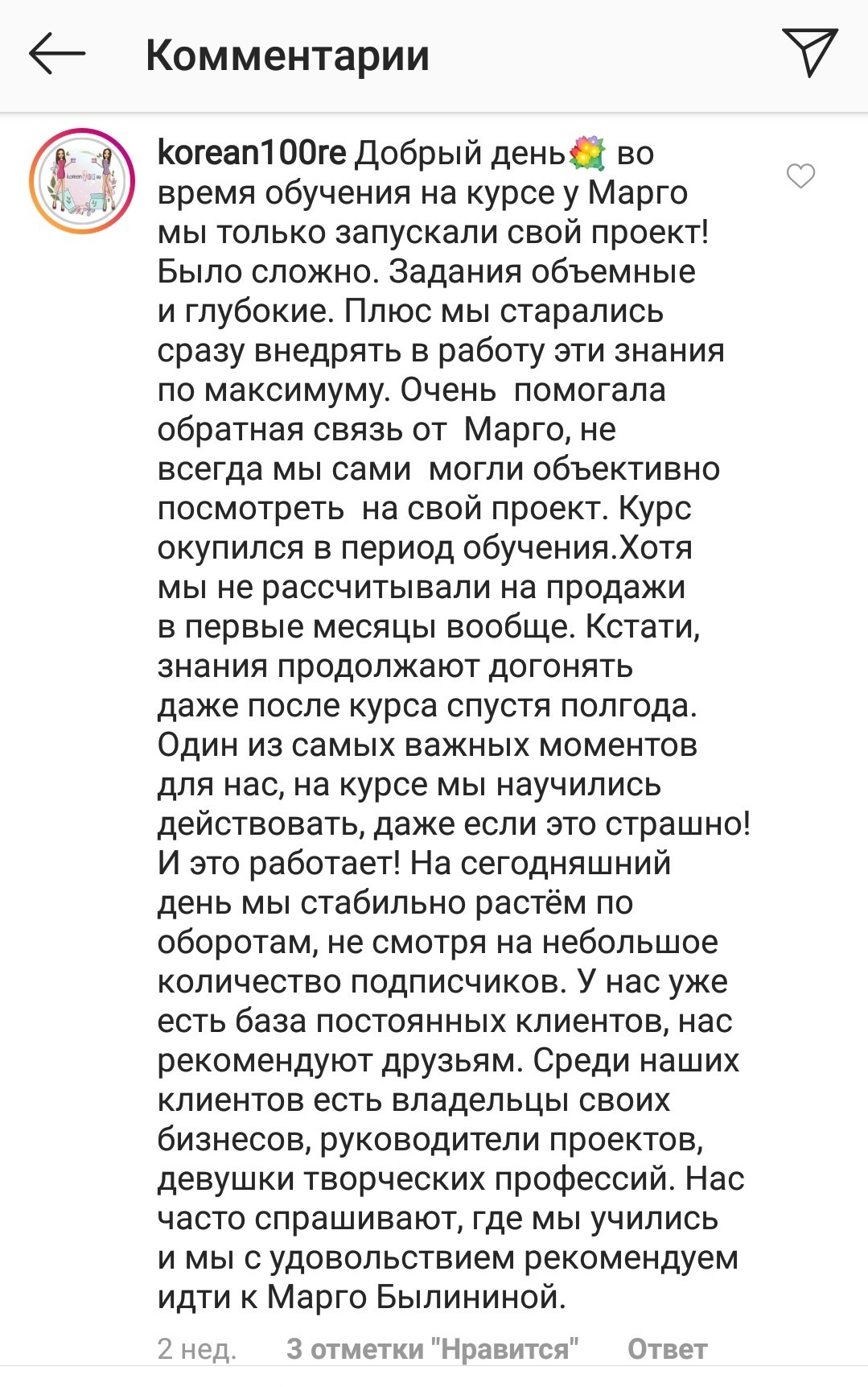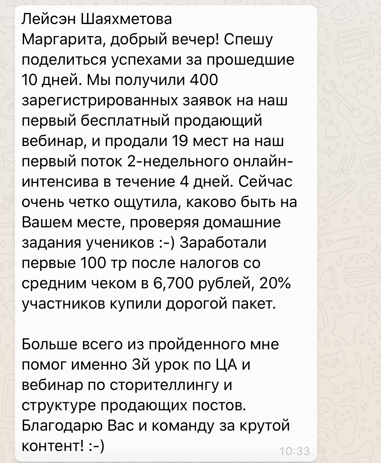 Стоимость тренинга я уже окупила за первую неделю примерно, как начала учиться, если я правильно помню, то училаст в 15м потоке.