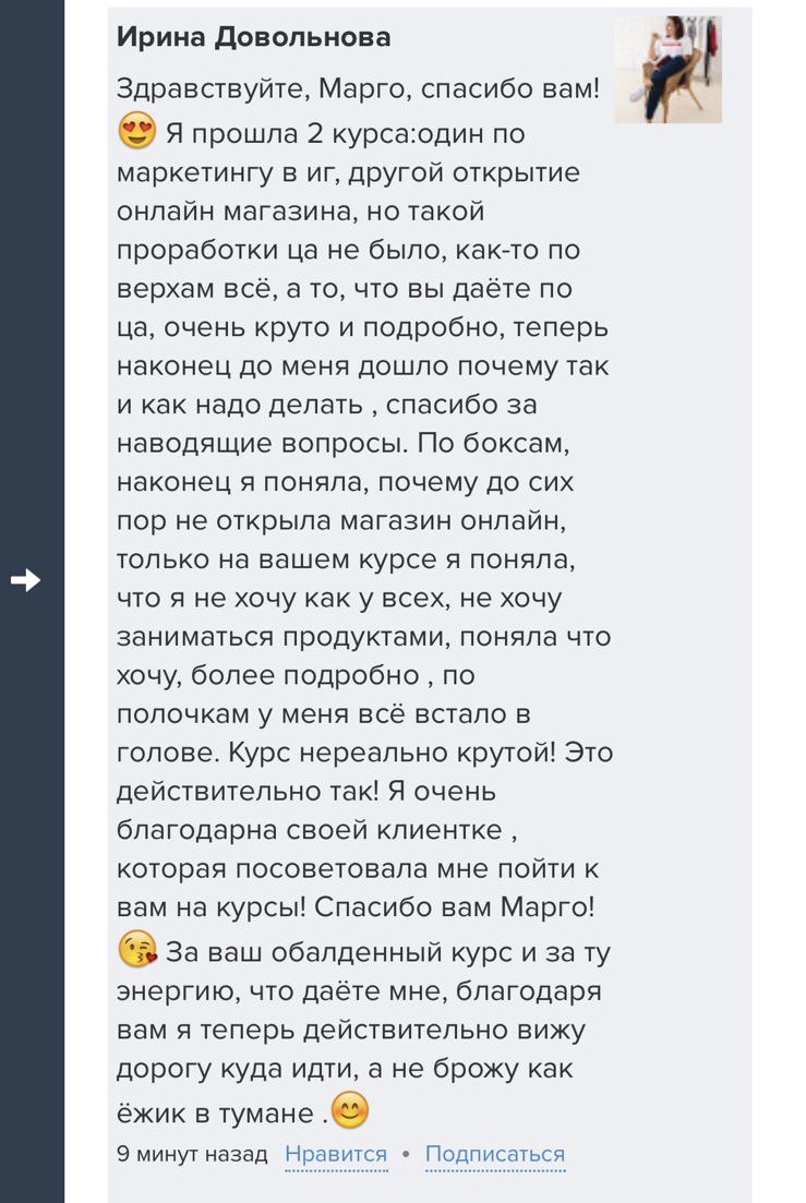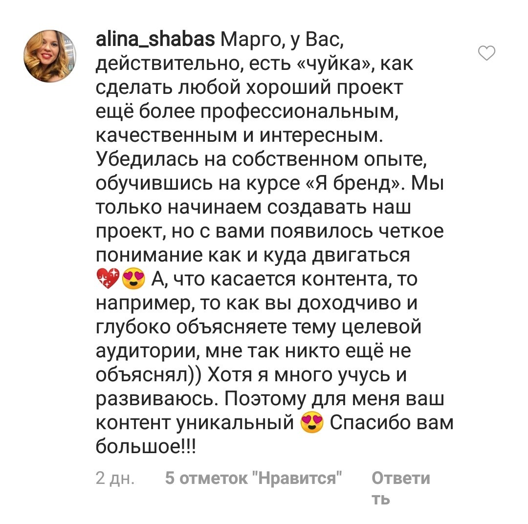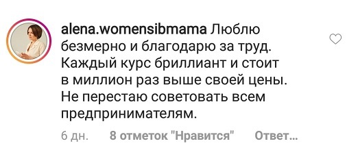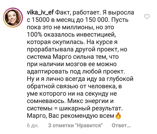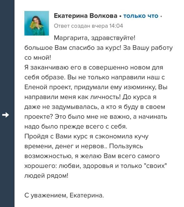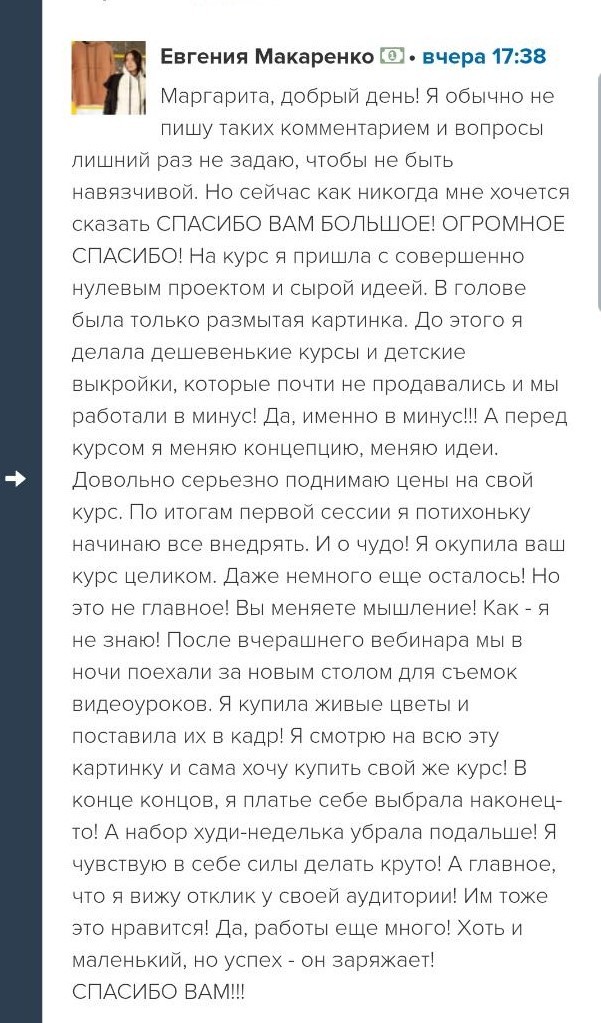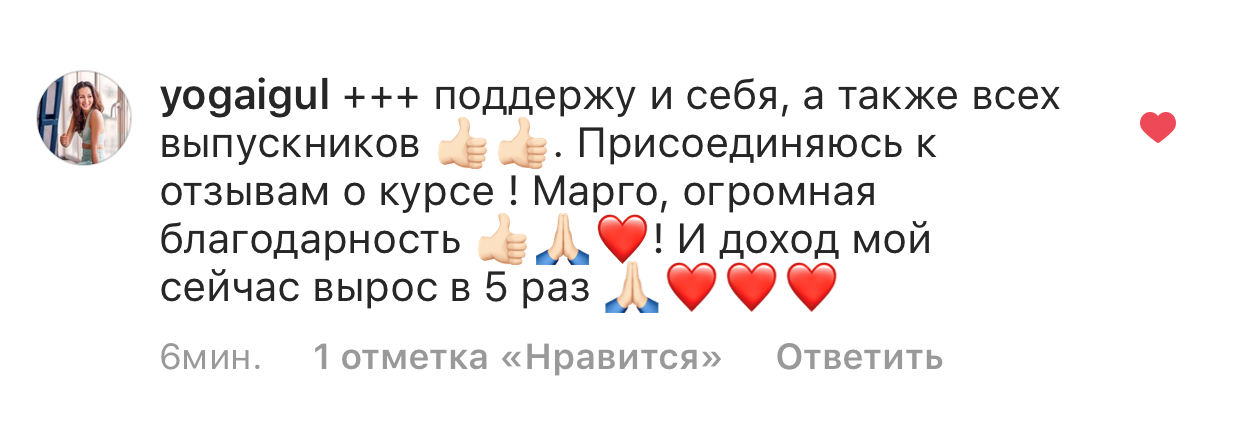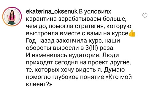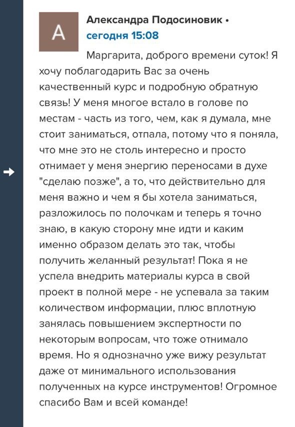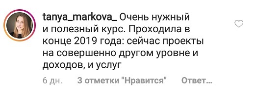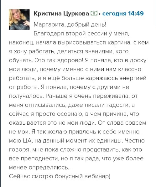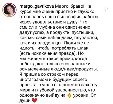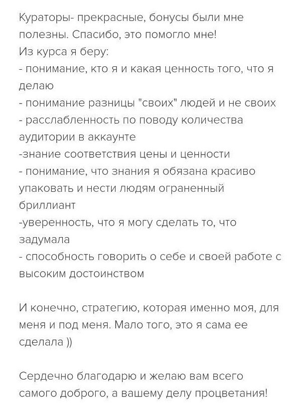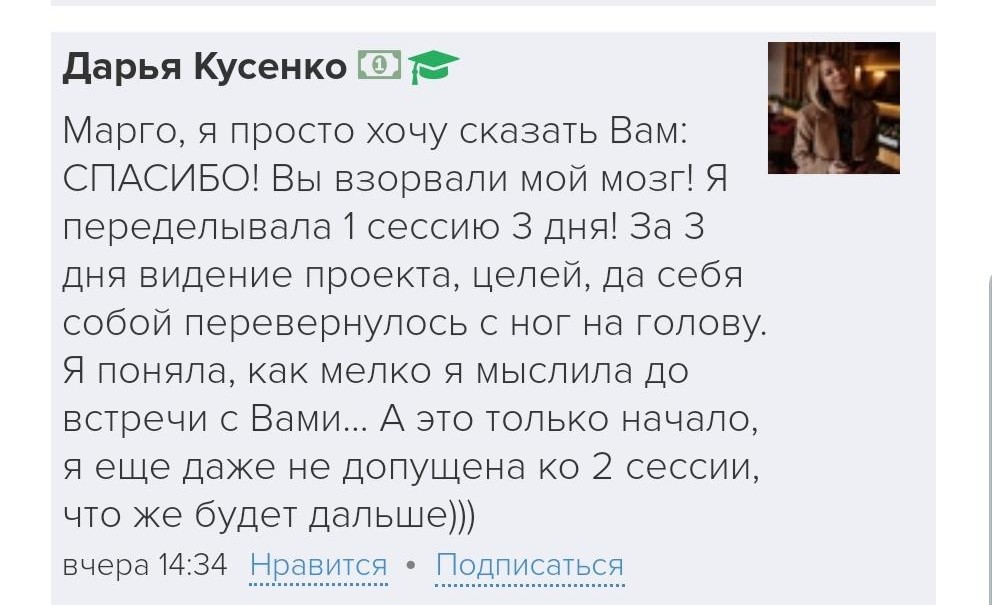 Проект мой стартовал с января, сейчас вышла на доход чуть больше 100 тр, но цель ставлю в 5 раз больше! И знаю, что благодаря тем знаниям, которые вы дали,я смогу легко этого достичь. Я вышла на свою ЦА, настолько комфортная для меня аудитория, ощущения что они это я.