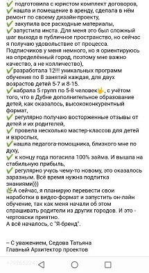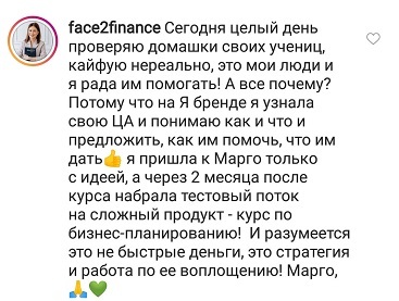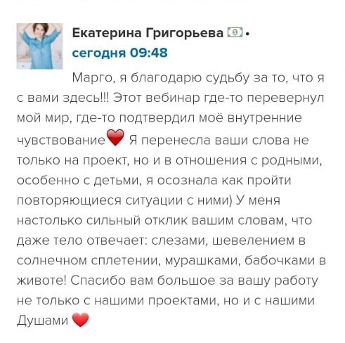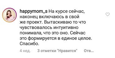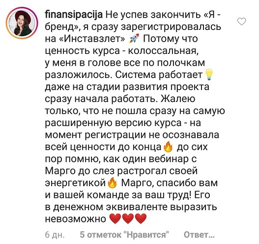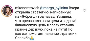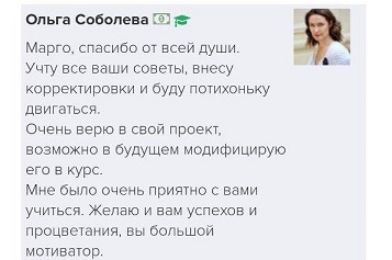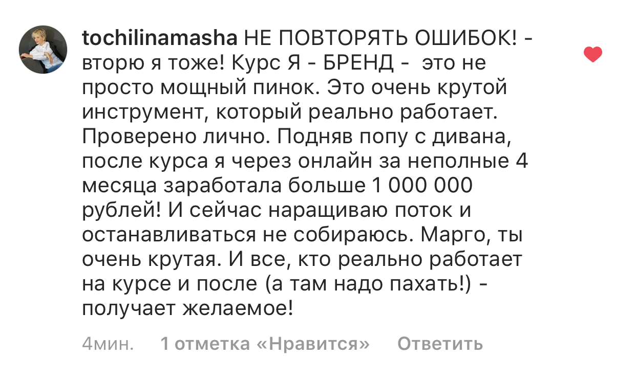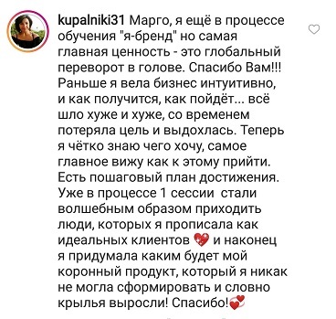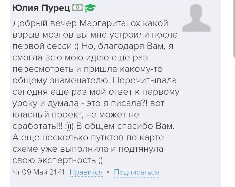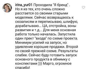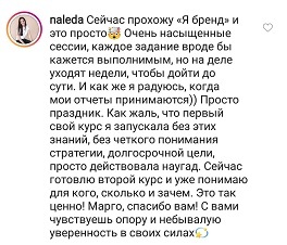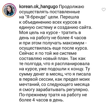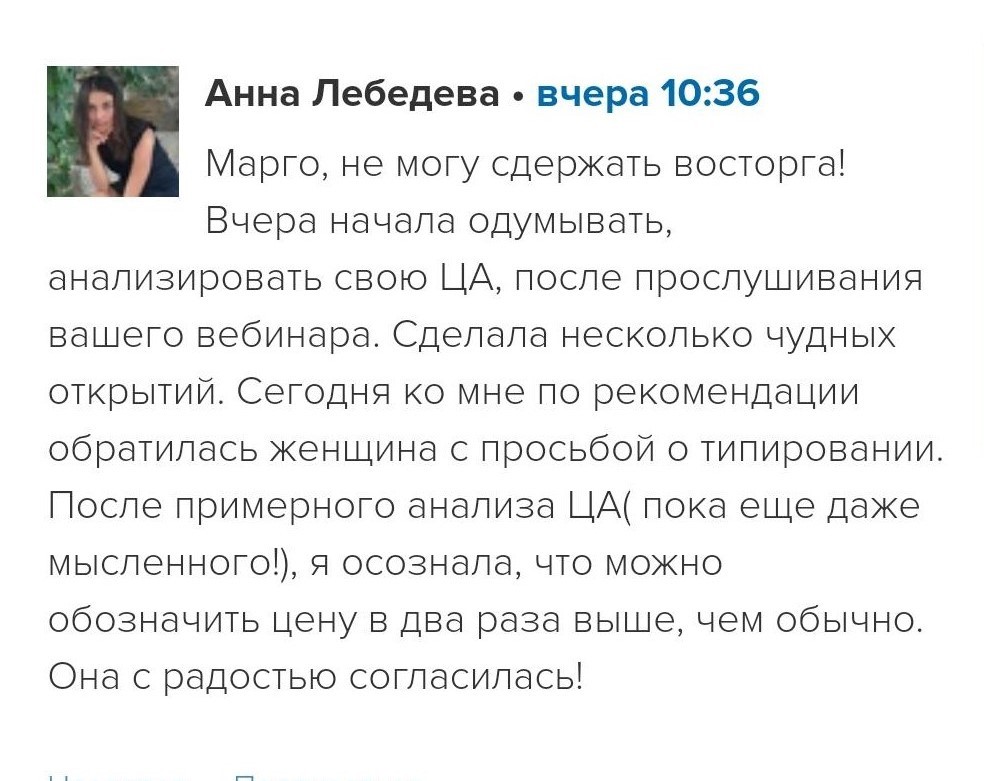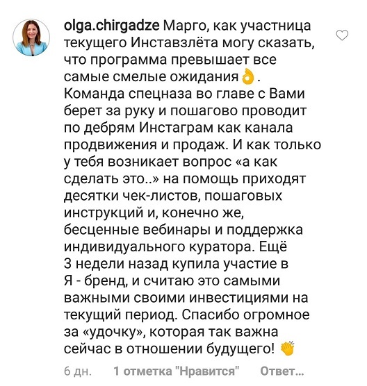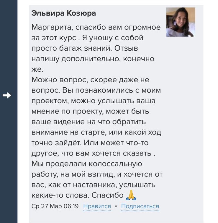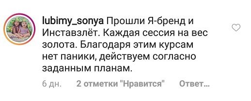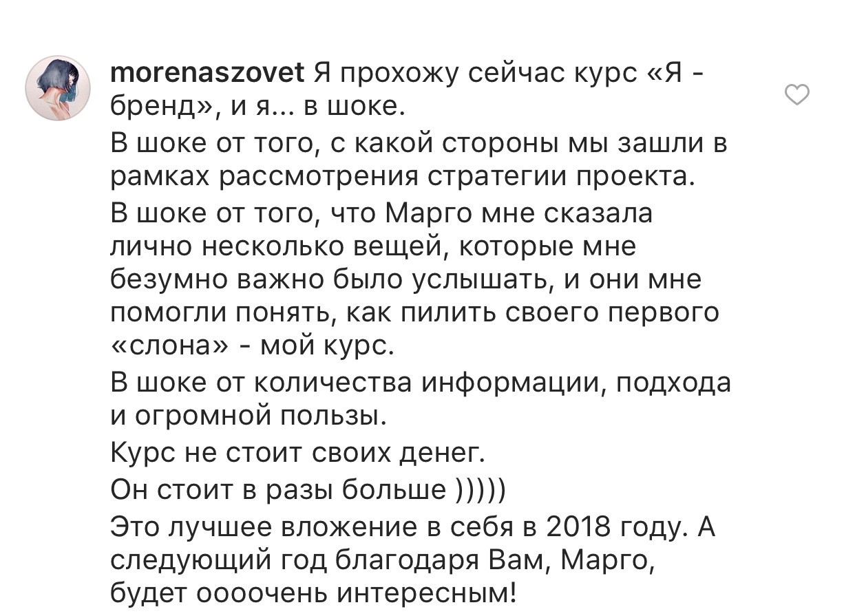 Проект мой стартовал с января, сейчас вышла на доход чуть больше 100 тр, но цель ставлю в 5 раз больше! И знаю, что благодаря тем знаниям, которые вы дали,я смогу легко этого достичь. Я вышла на свою ЦА, настолько комфортная для меня аудитория, ощущения что они это я.