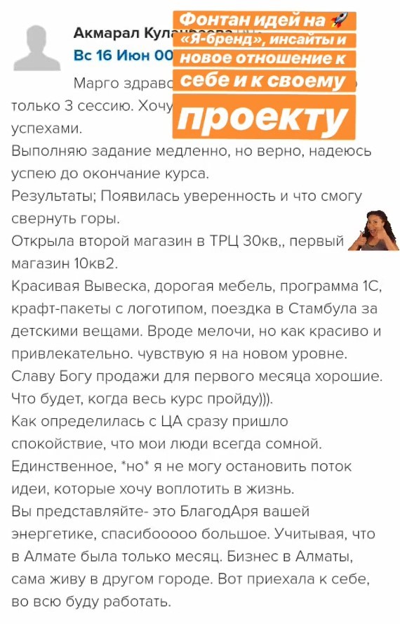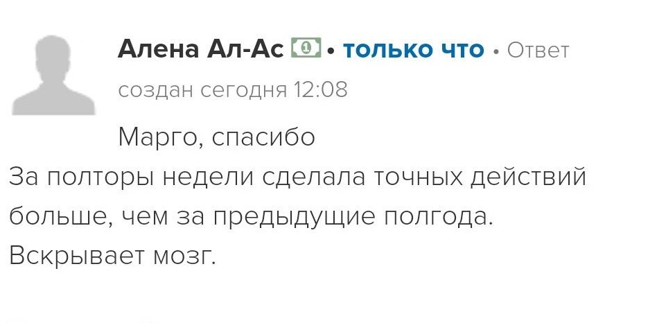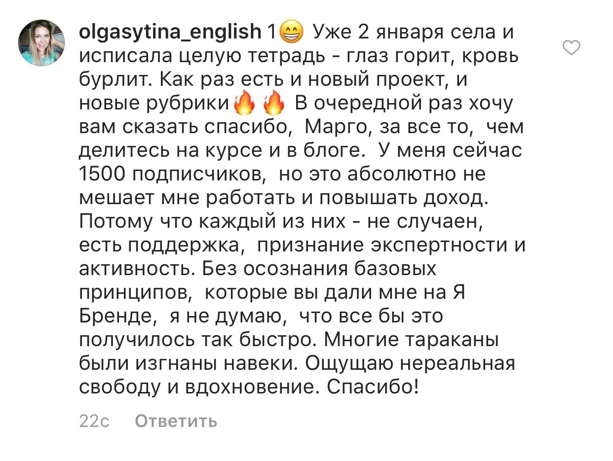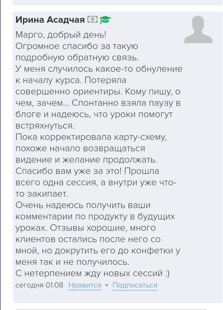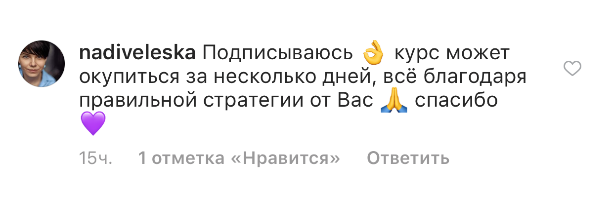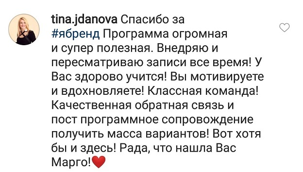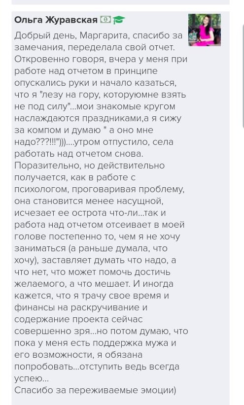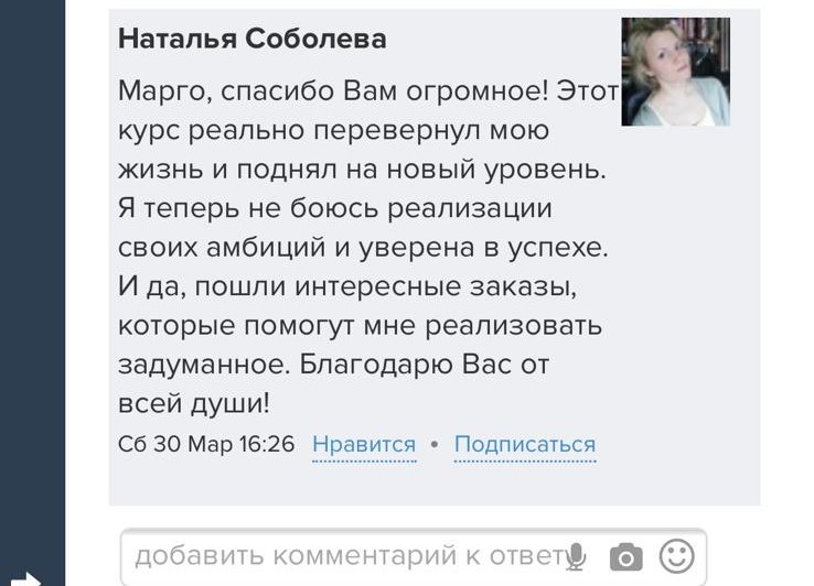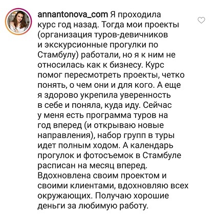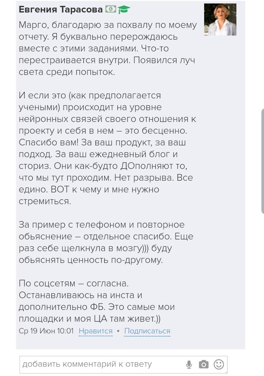 Проект мой стартовал с января, сейчас вышла на доход чуть больше 100 тр, но цель ставлю в 5 раз больше! И знаю, что благодаря тем знаниям, которые вы дали,я смогу легко этого достичь. Я вышла на свою ЦА, настолько комфортная для меня аудитория, ощущения что они это я.
