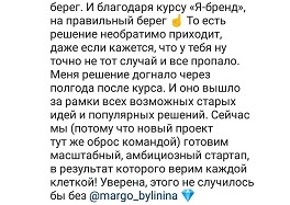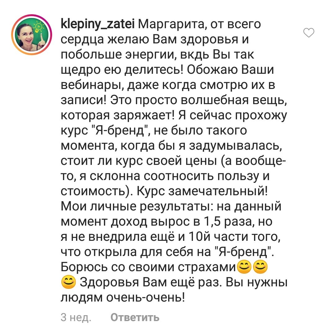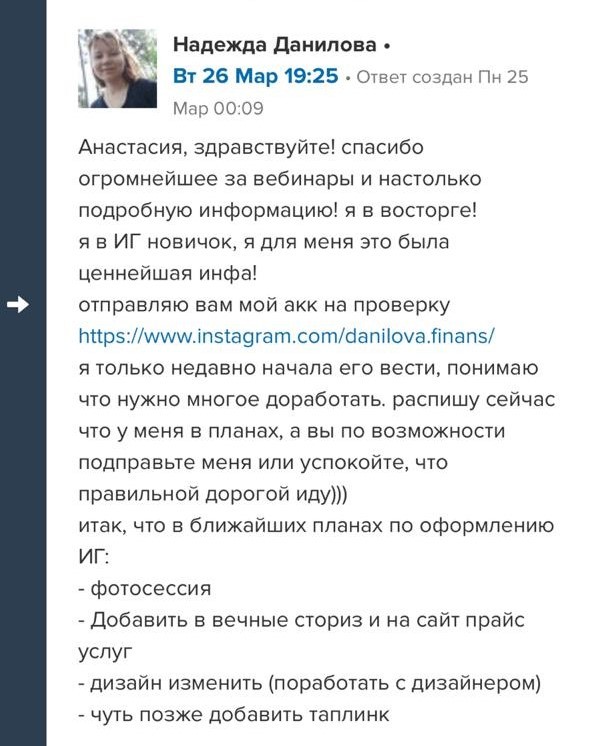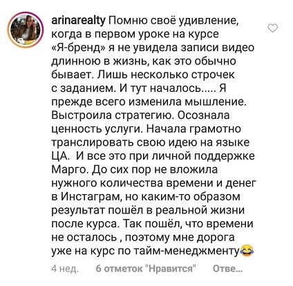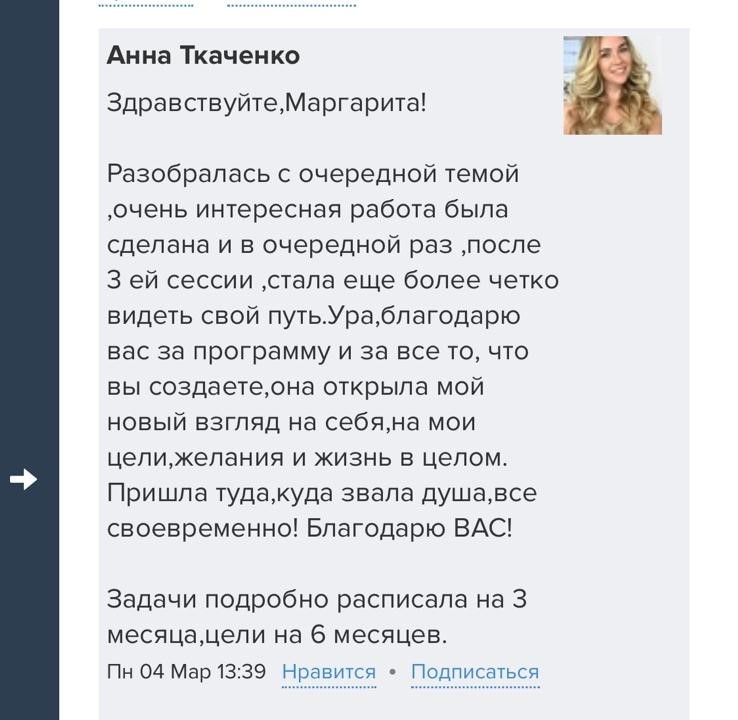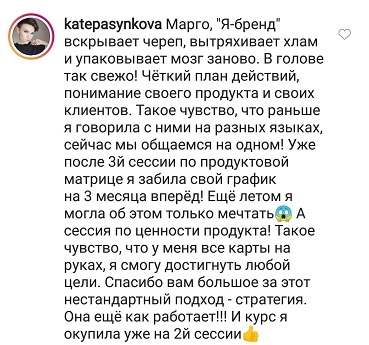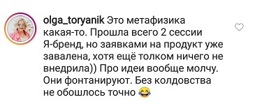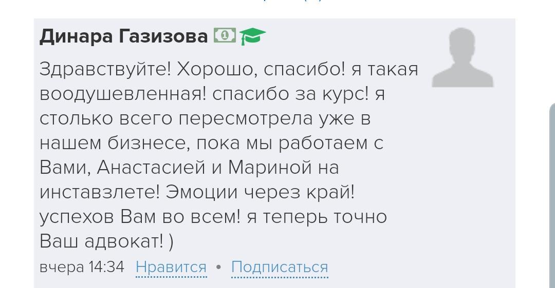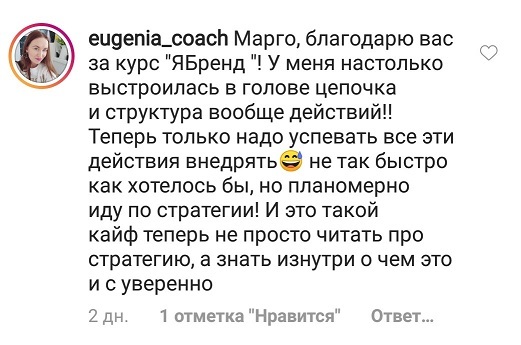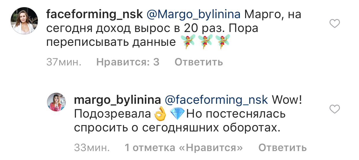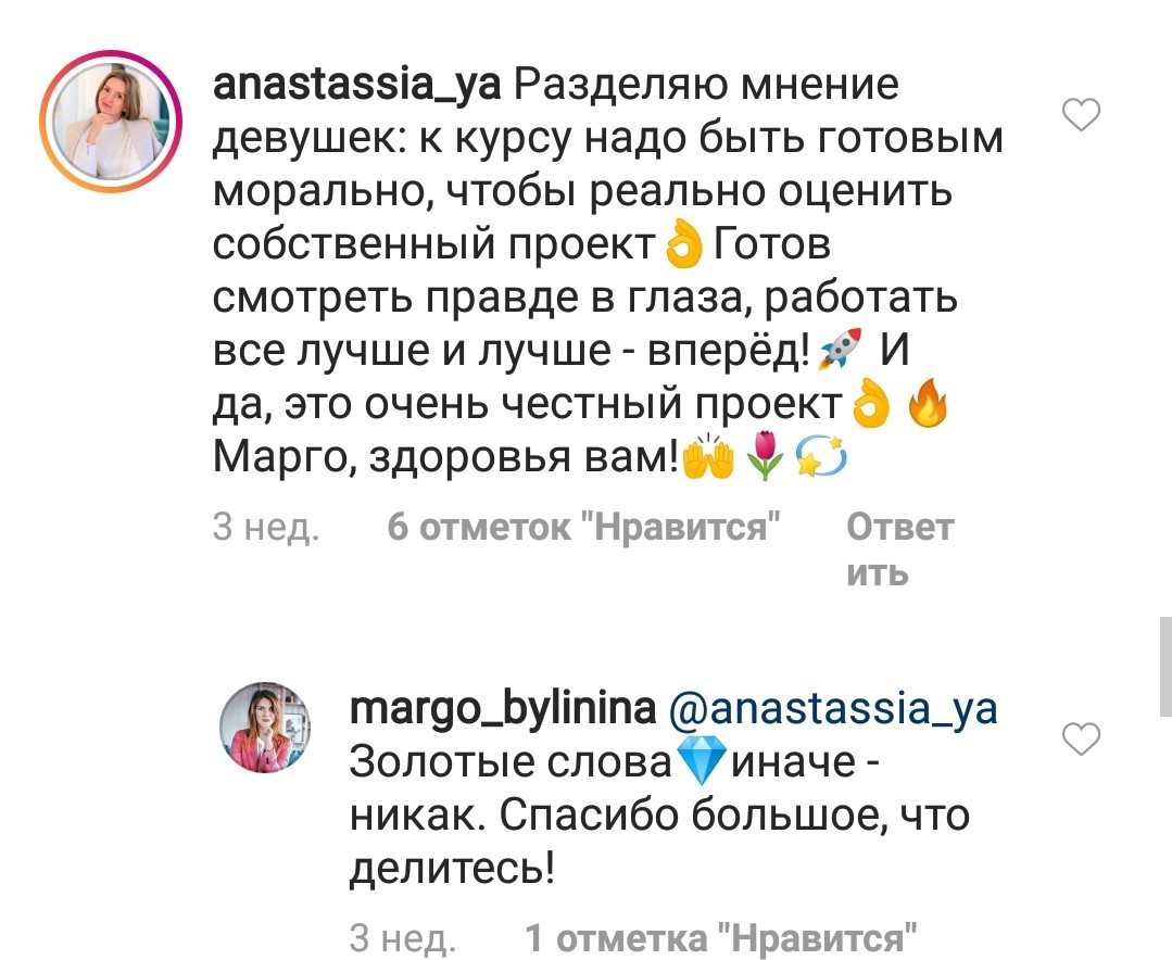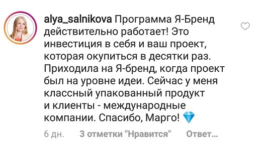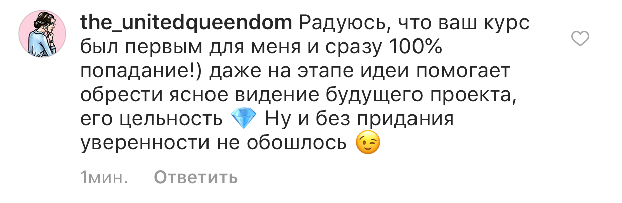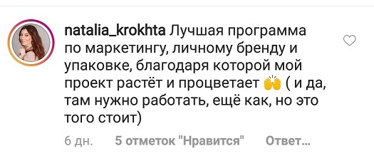 Проект мой стартовал с января, сейчас вышла на доход чуть больше 100 тр, но цель ставлю в 5 раз больше! И знаю, что благодаря тем знаниям, которые вы дали,я смогу легко этого достичь. Я вышла на свою ЦА, настолько комфортная для меня аудитория, ощущения что они это я.