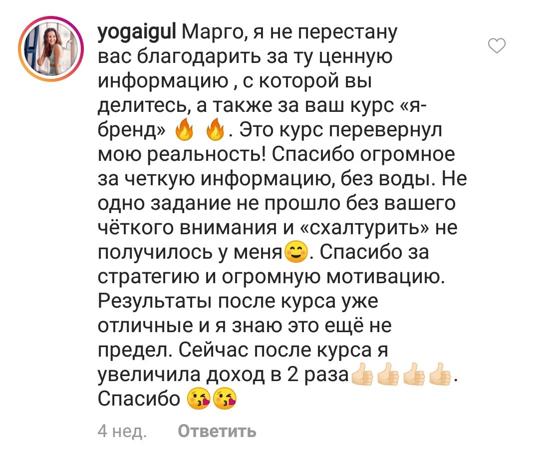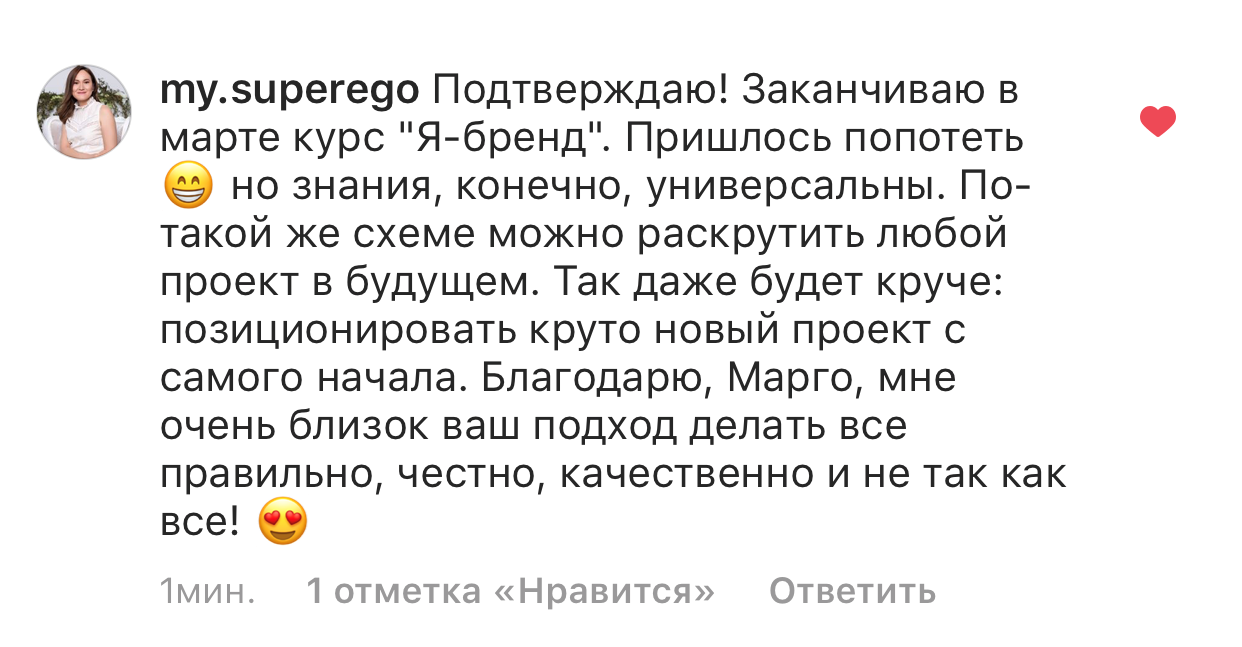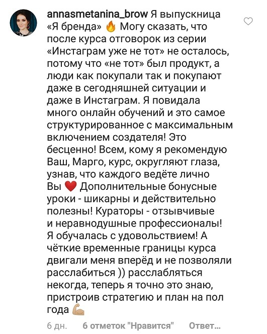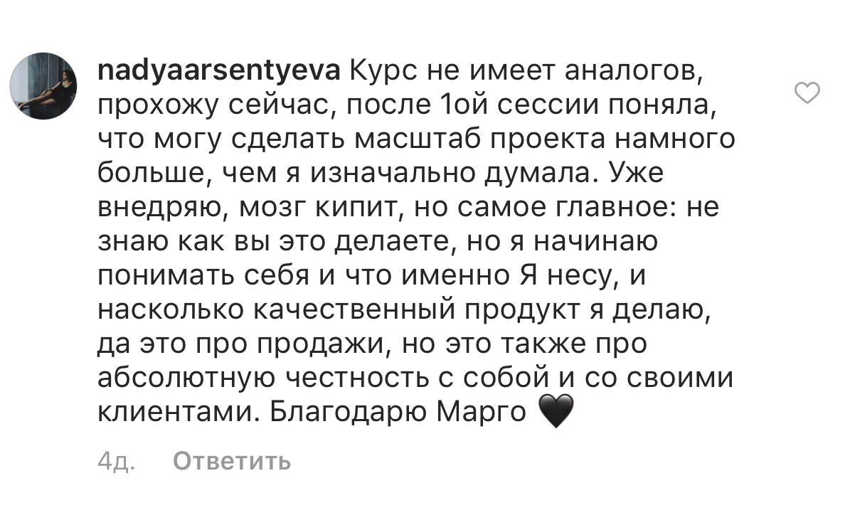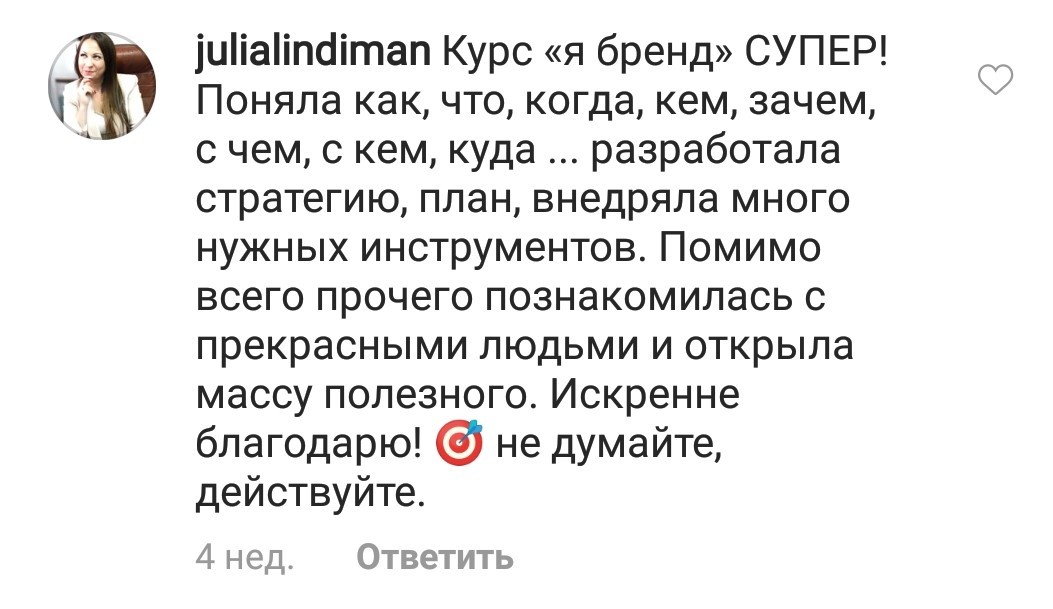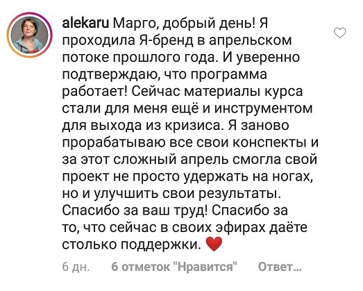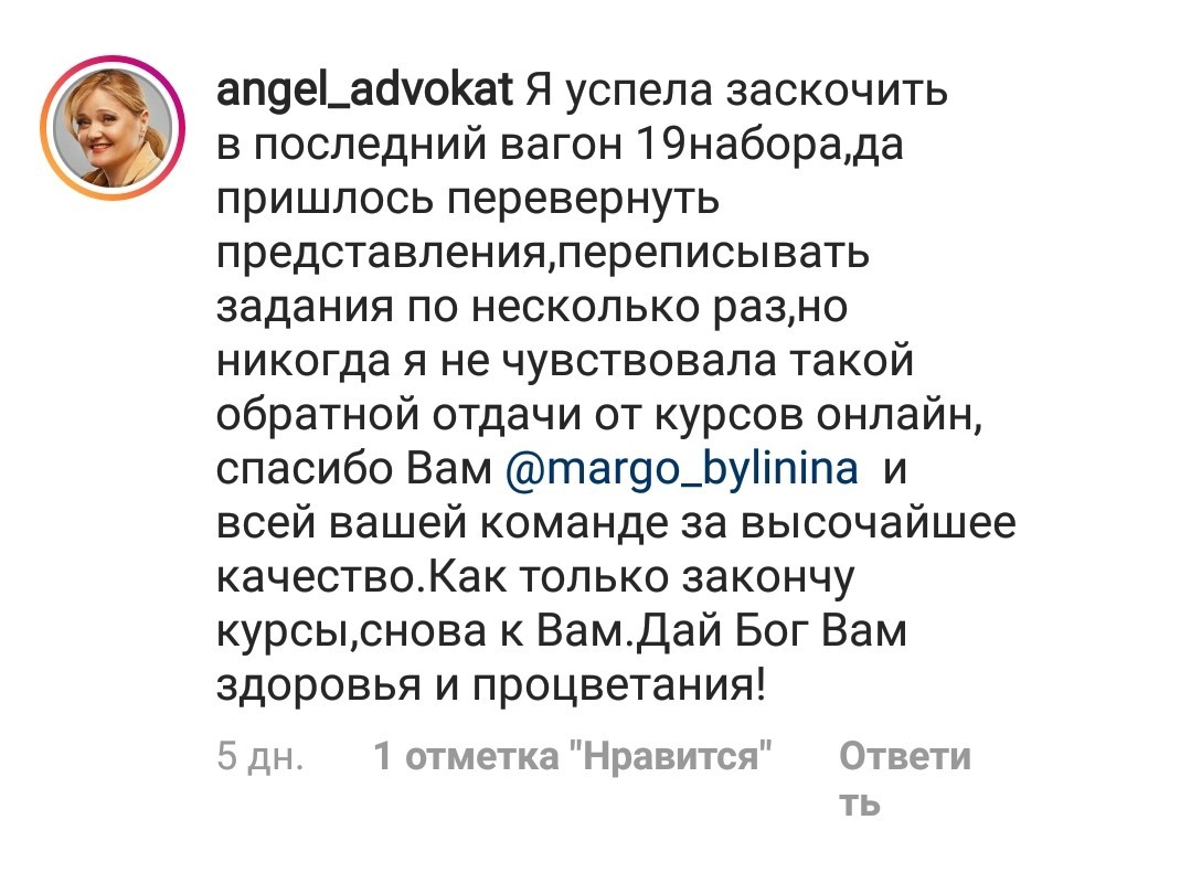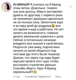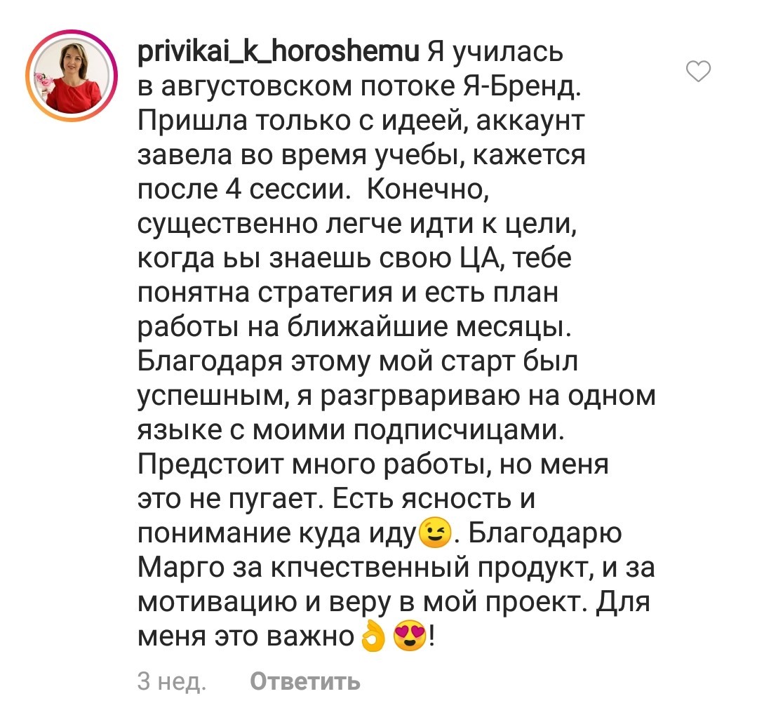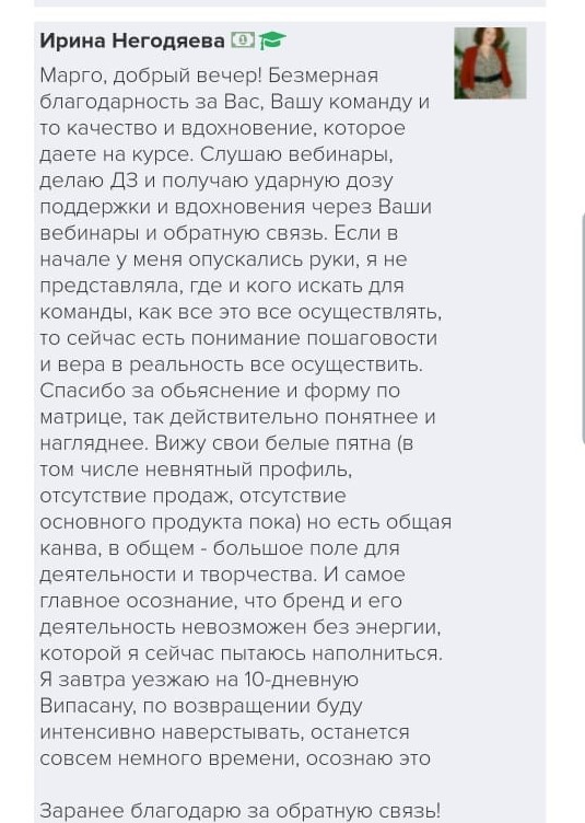 Проект мой стартовал с января, сейчас вышла на доход чуть больше 100 тр, но цель ставлю в 5 раз больше! И знаю, что благодаря тем знаниям, которые вы дали,я смогу легко этого достичь. Я вышла на свою ЦА, настолько комфортная для меня аудитория, ощущения что они это я.