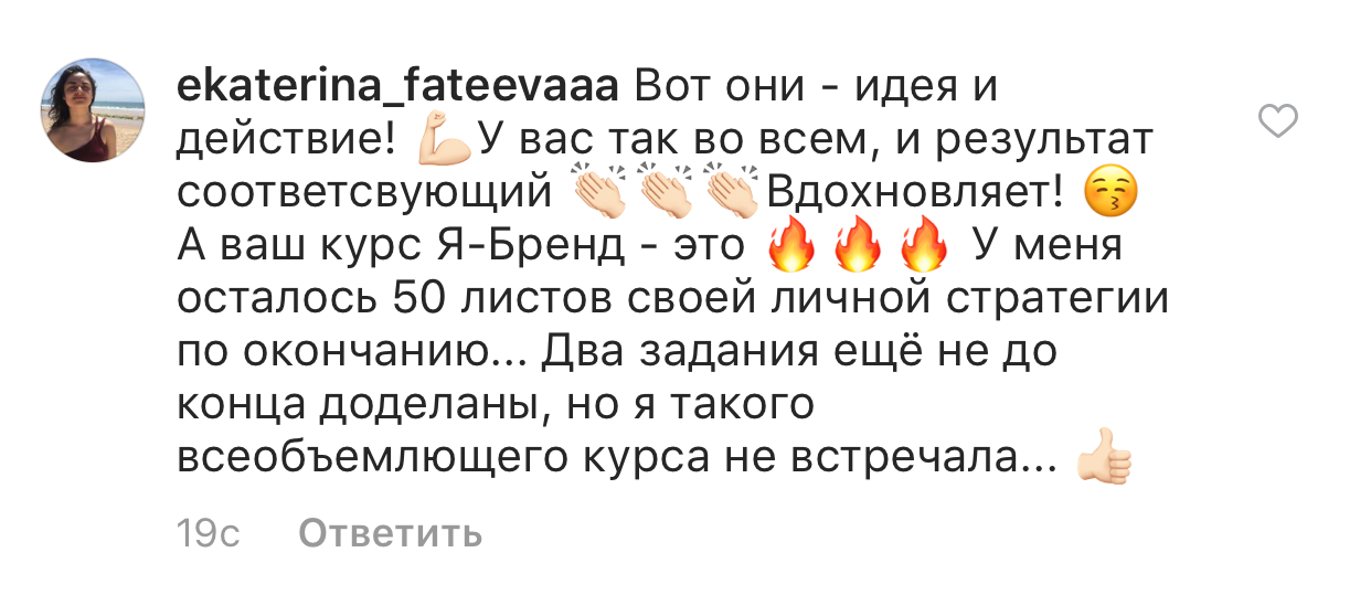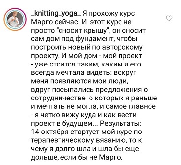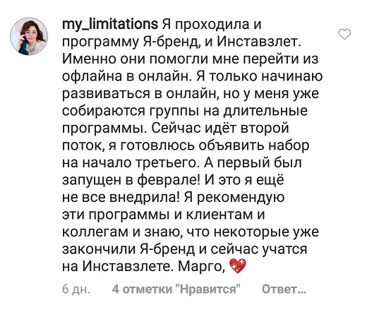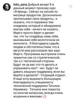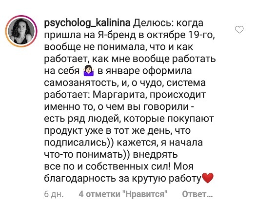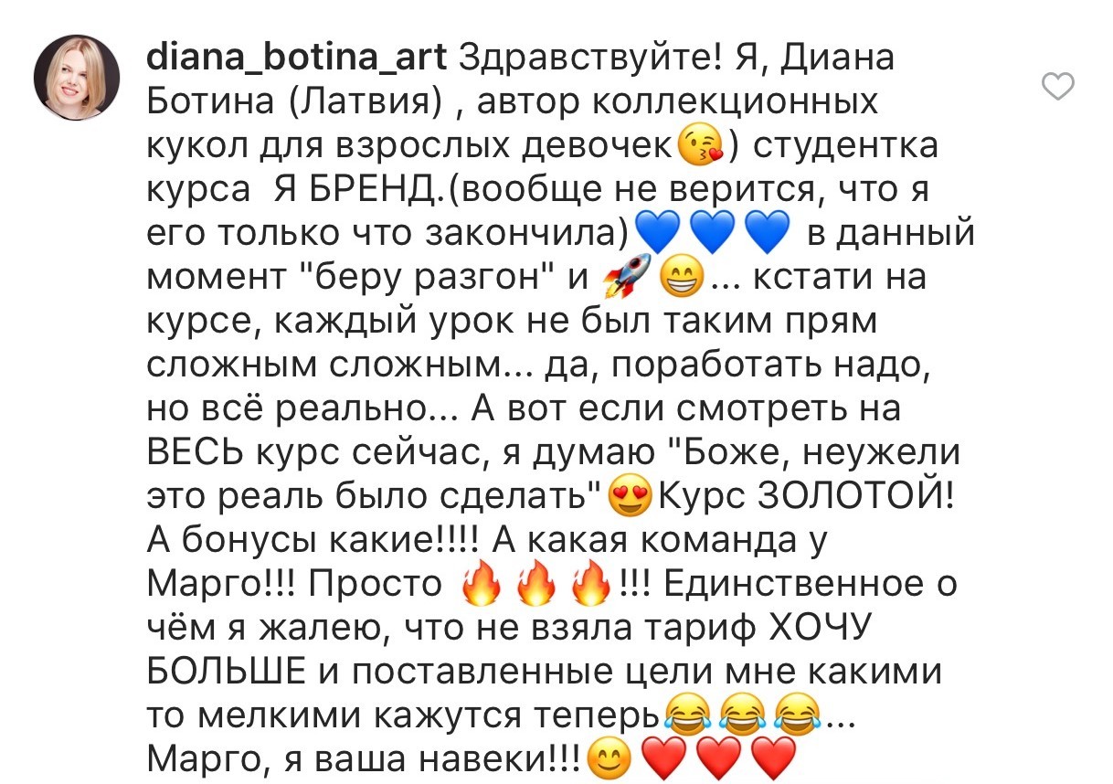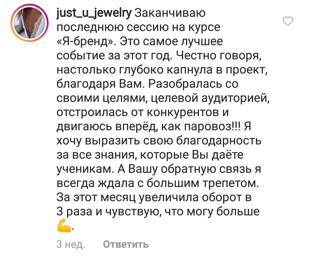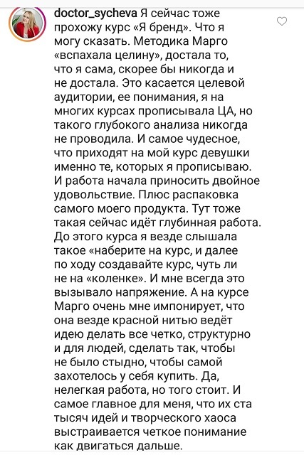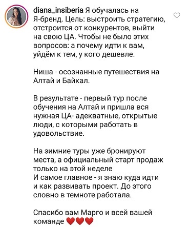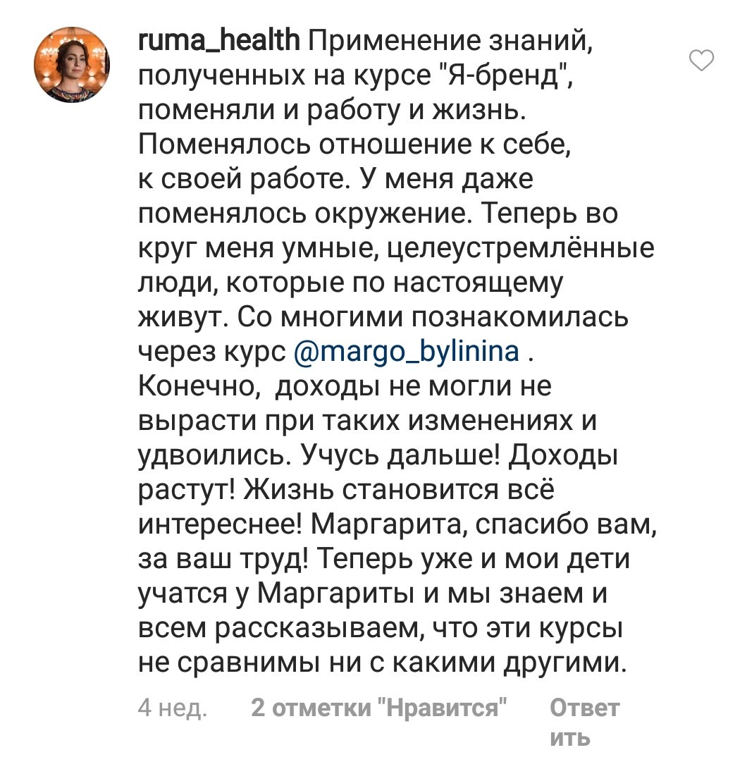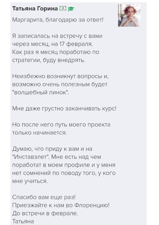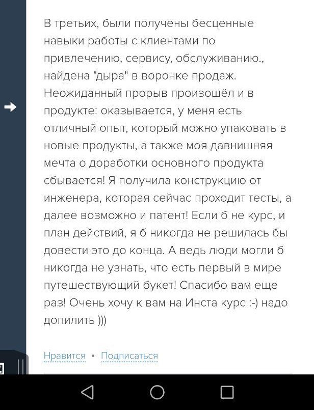 Проект мой стартовал с января, сейчас вышла на доход чуть больше 100 тр, но цель ставлю в 5 раз больше! И знаю, что благодаря тем знаниям, которые вы дали,я смогу легко этого достичь. Я вышла на свою ЦА, настолько комфортная для меня аудитория, ощущения что они это я.