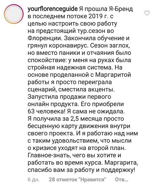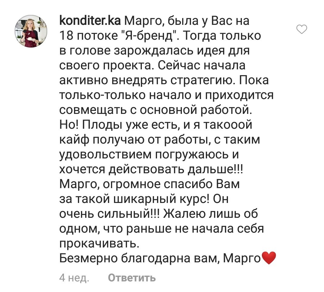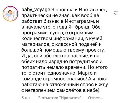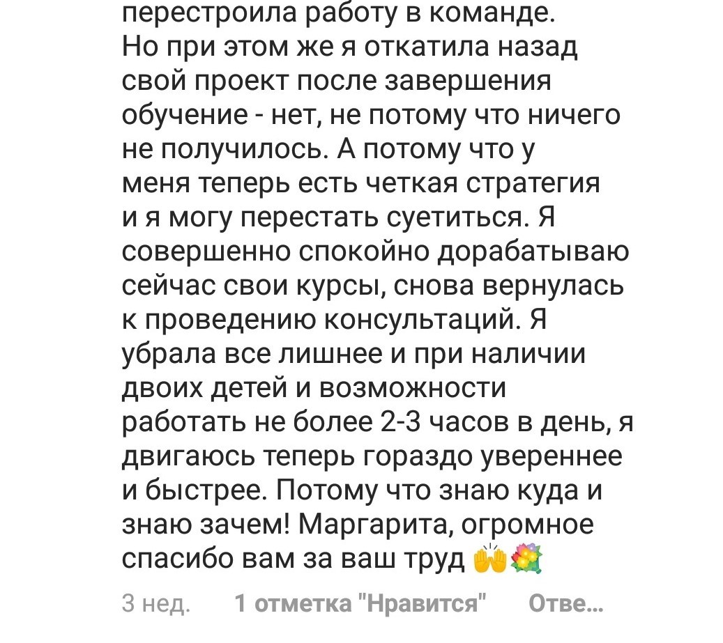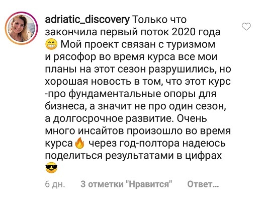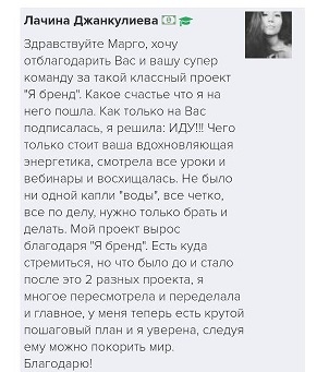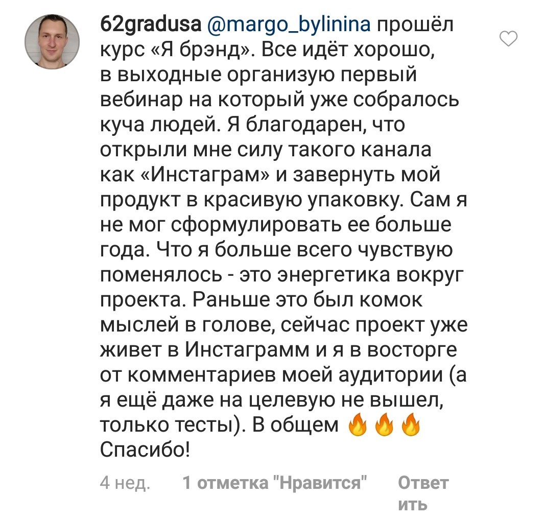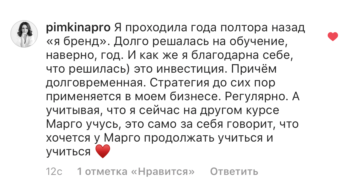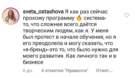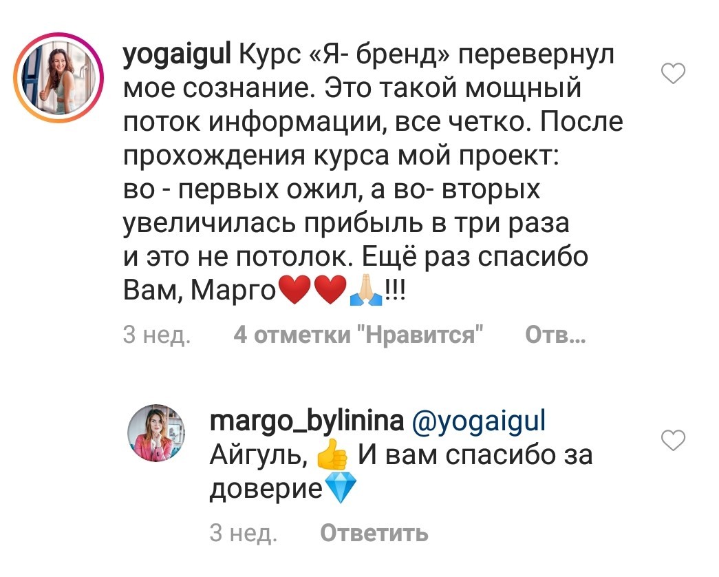 Проект мой стартовал с января, сейчас вышла на доход чуть больше 100 тр, но цель ставлю в 5 раз больше! И знаю, что благодаря тем знаниям, которые вы дали,я смогу легко этого достичь. Я вышла на свою ЦА, настолько комфортная для меня аудитория, ощущения что они это я.