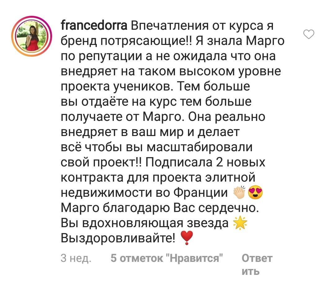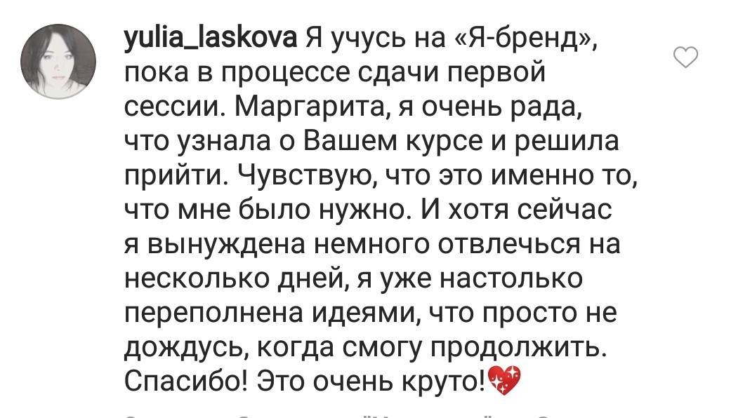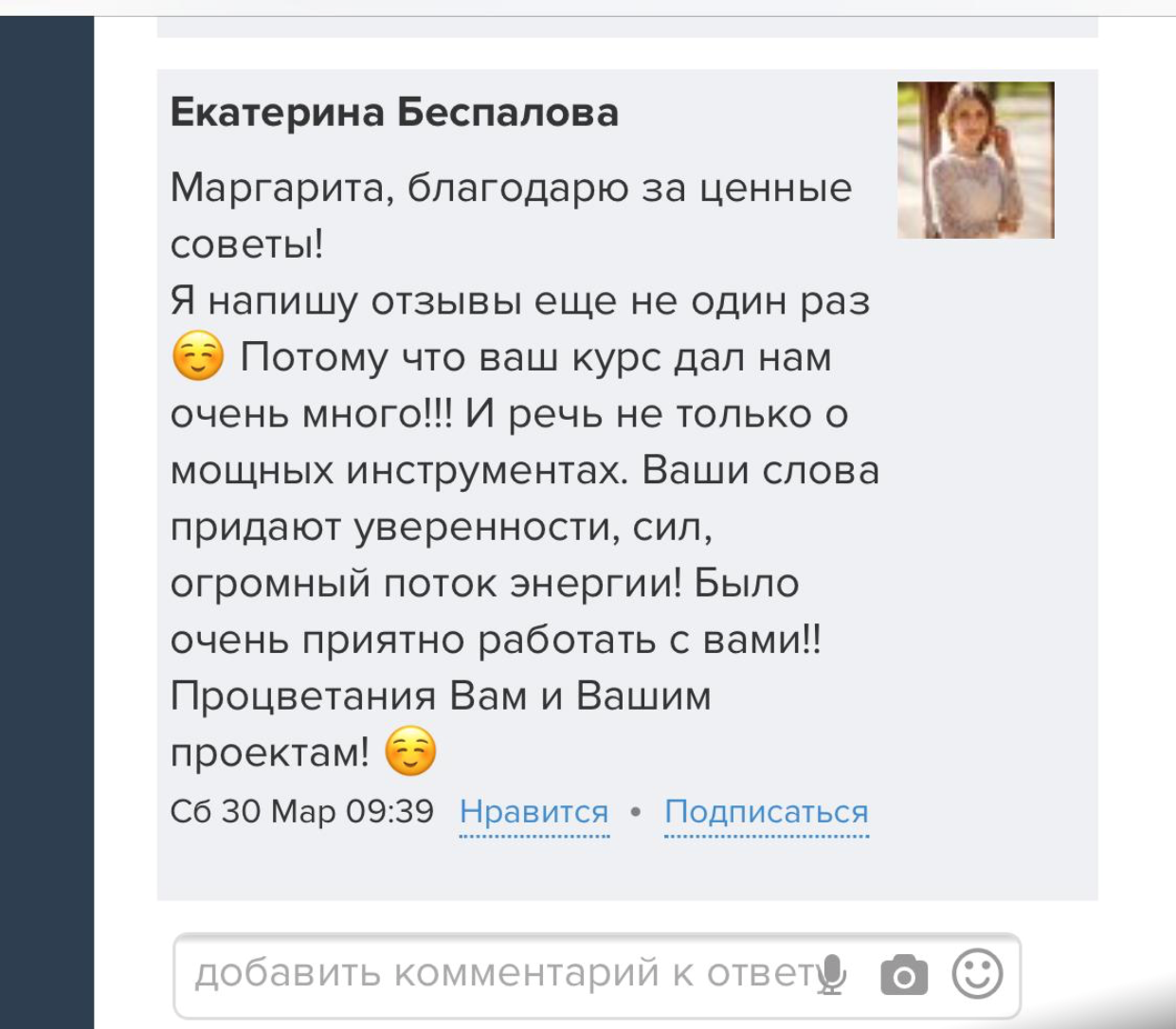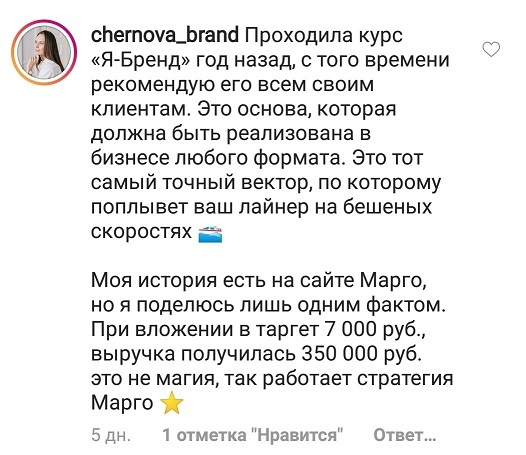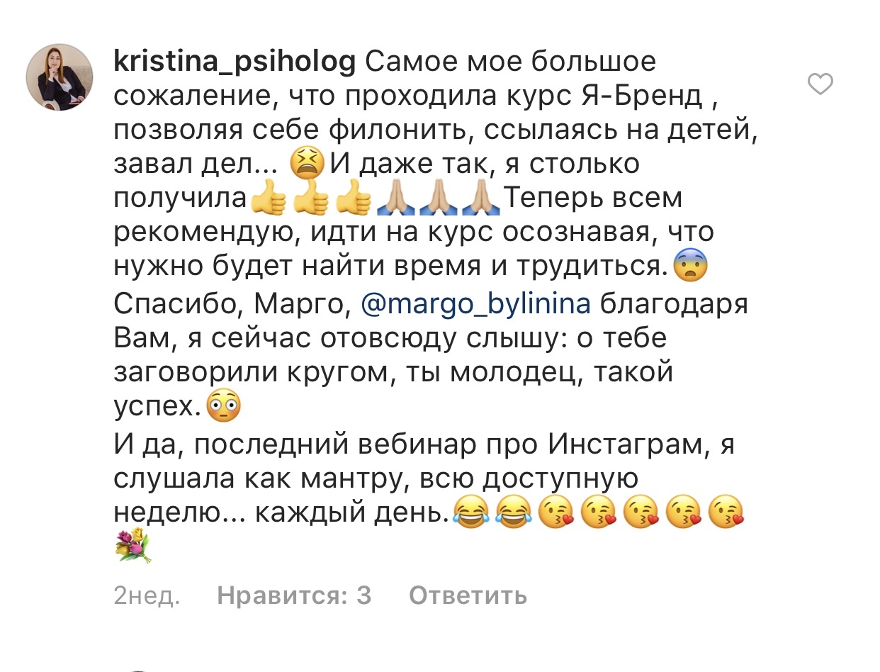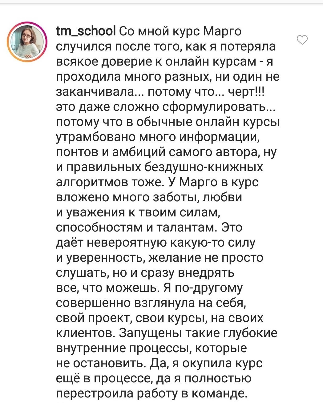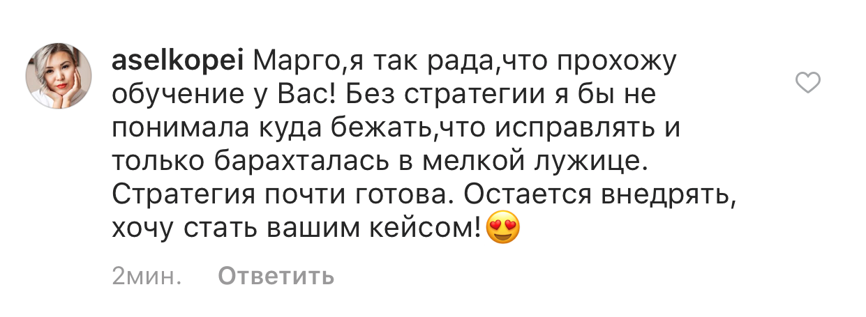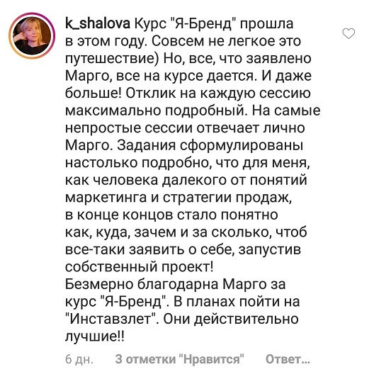 Проект мой стартовал с января, сейчас вышла на доход чуть больше 100 тр, но цель ставлю в 5 раз больше! И знаю, что благодаря тем знаниям, которые вы дали,я смогу легко этого достичь. Я вышла на свою ЦА, настолько комфортная для меня аудитория, ощущения что они это я.