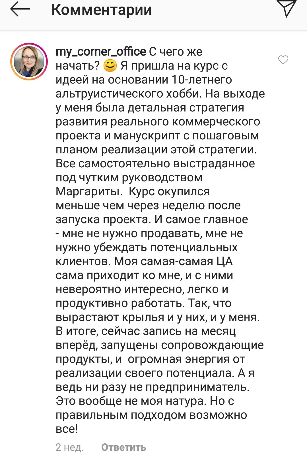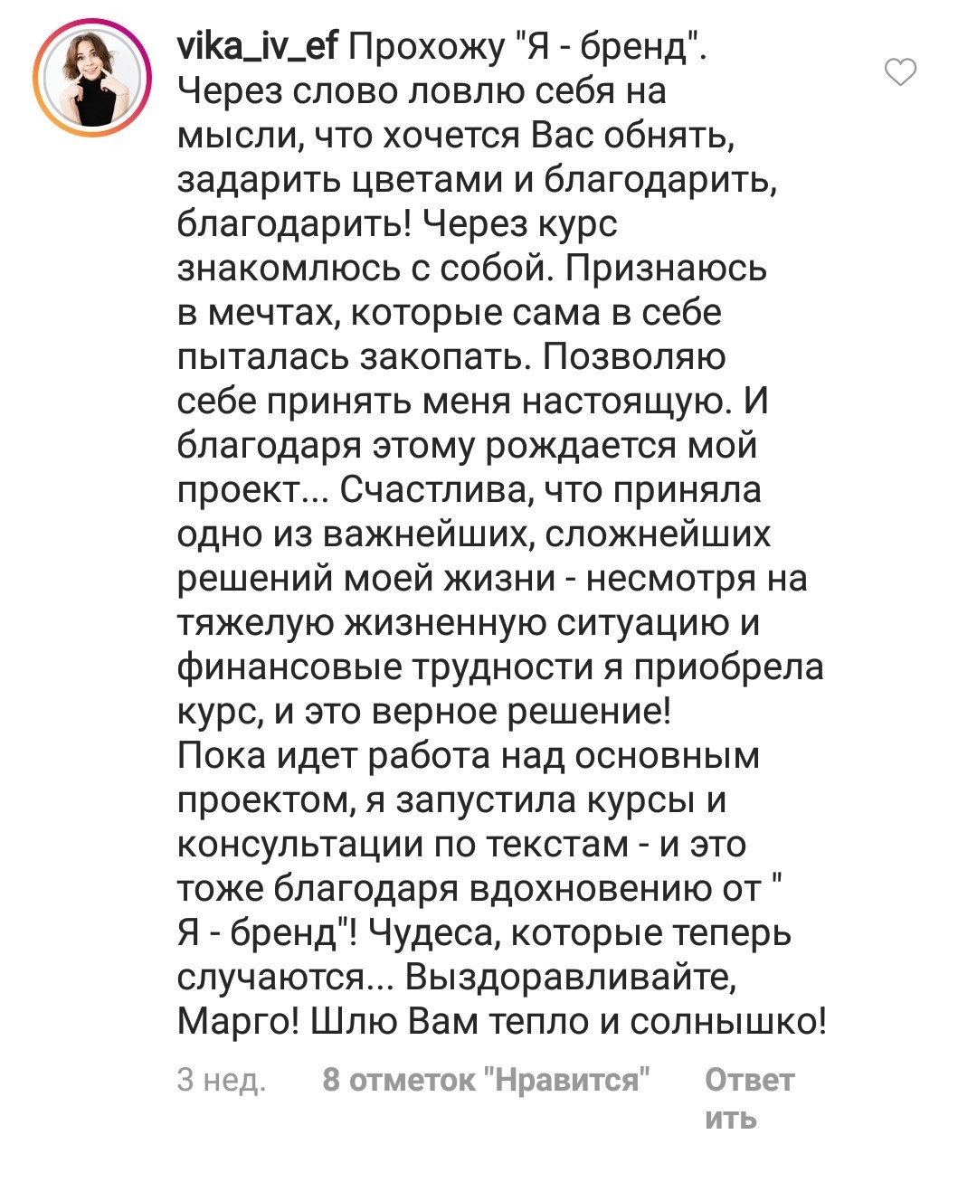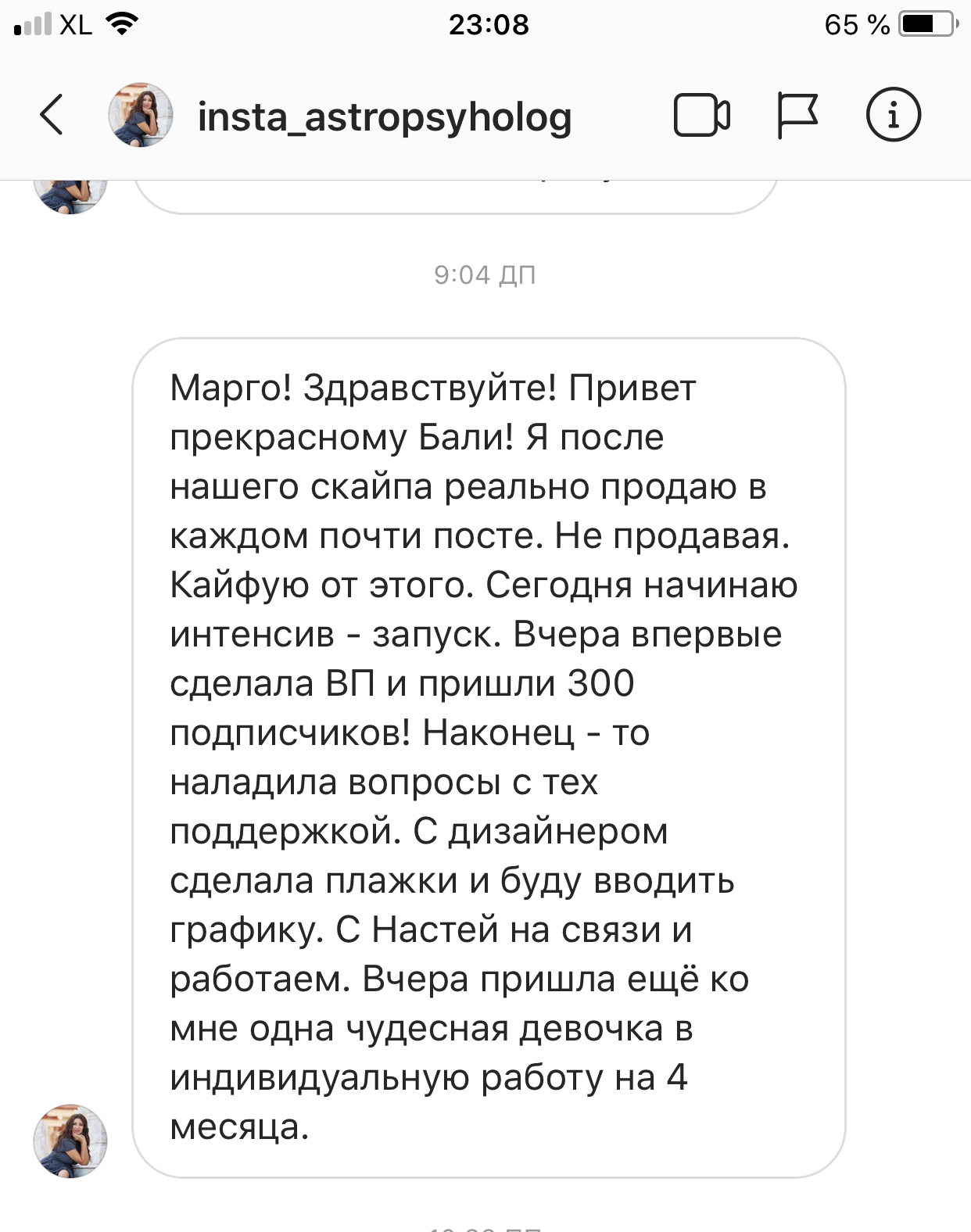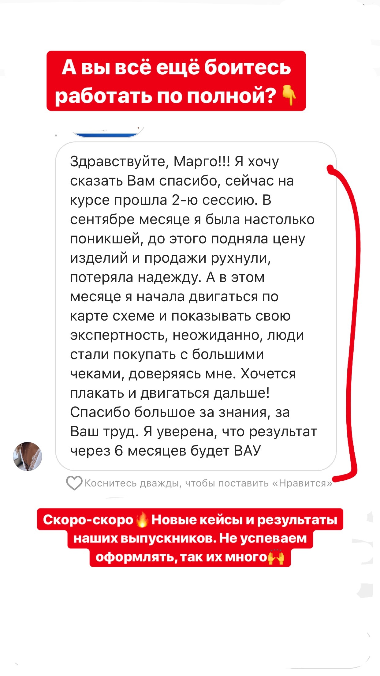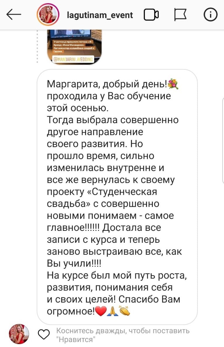 Проект мой стартовал с января, сейчас вышла на доход чуть больше 100 тр, но цель ставлю в 5 раз больше! И знаю, что благодаря тем знаниям, которые вы дали,я смогу легко этого достичь. Я вышла на свою ЦА, настолько комфортная для меня аудитория, ощущения что они это я.
