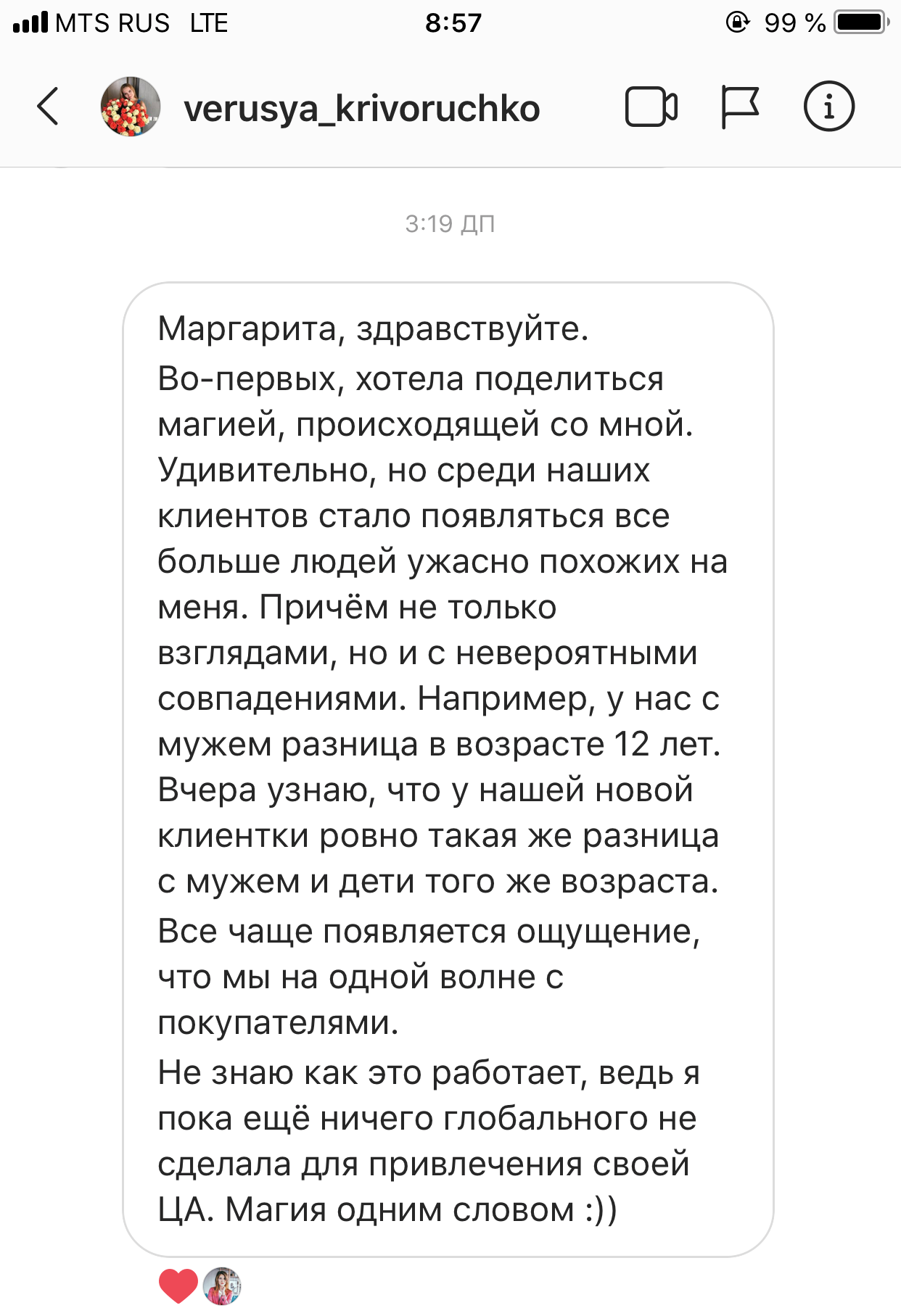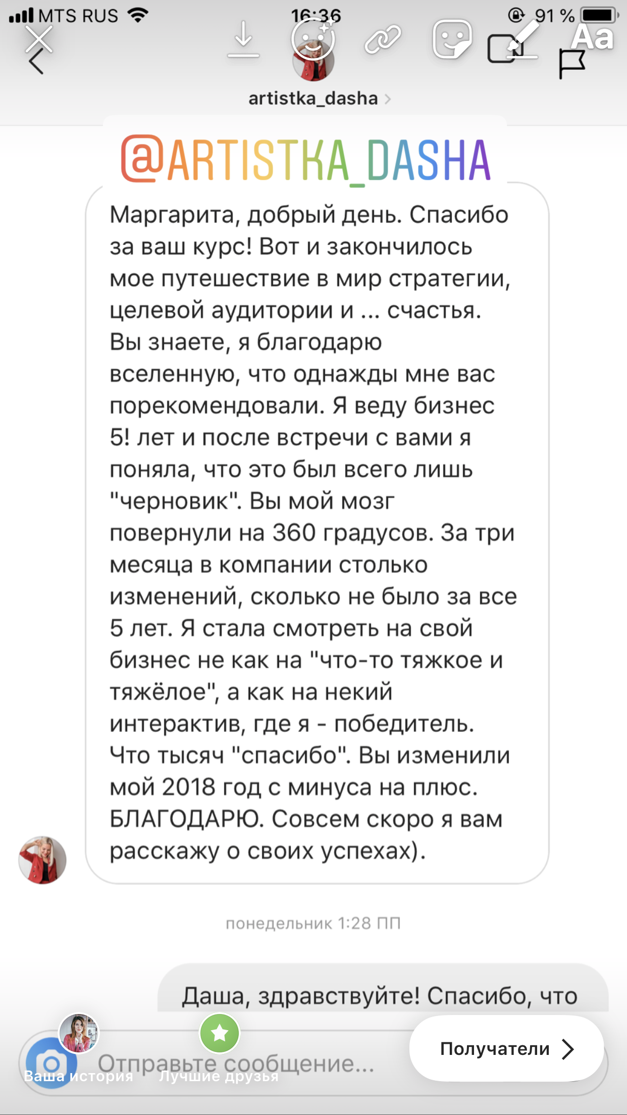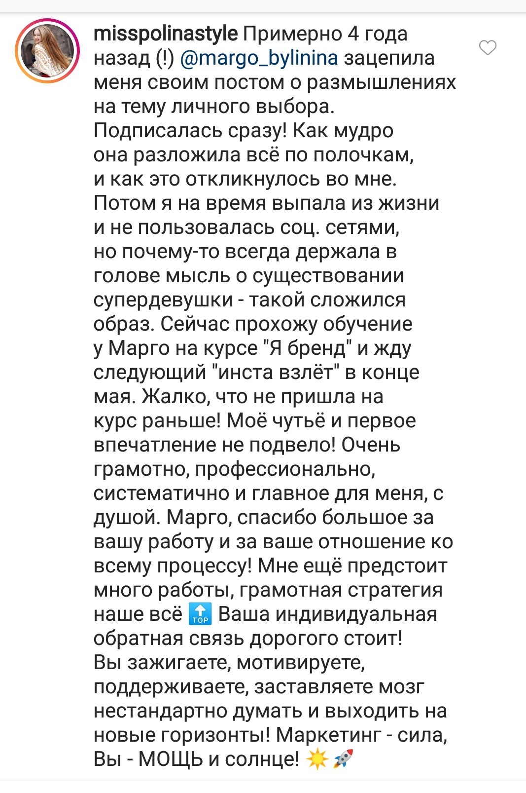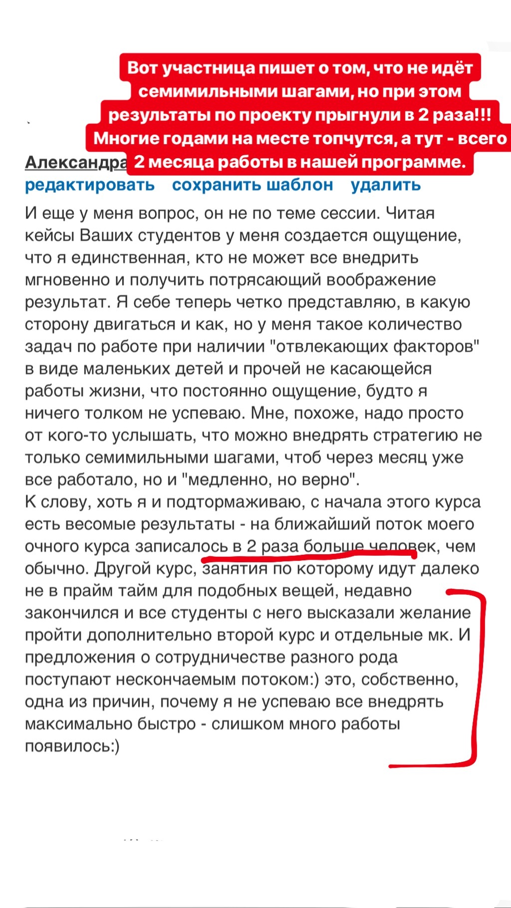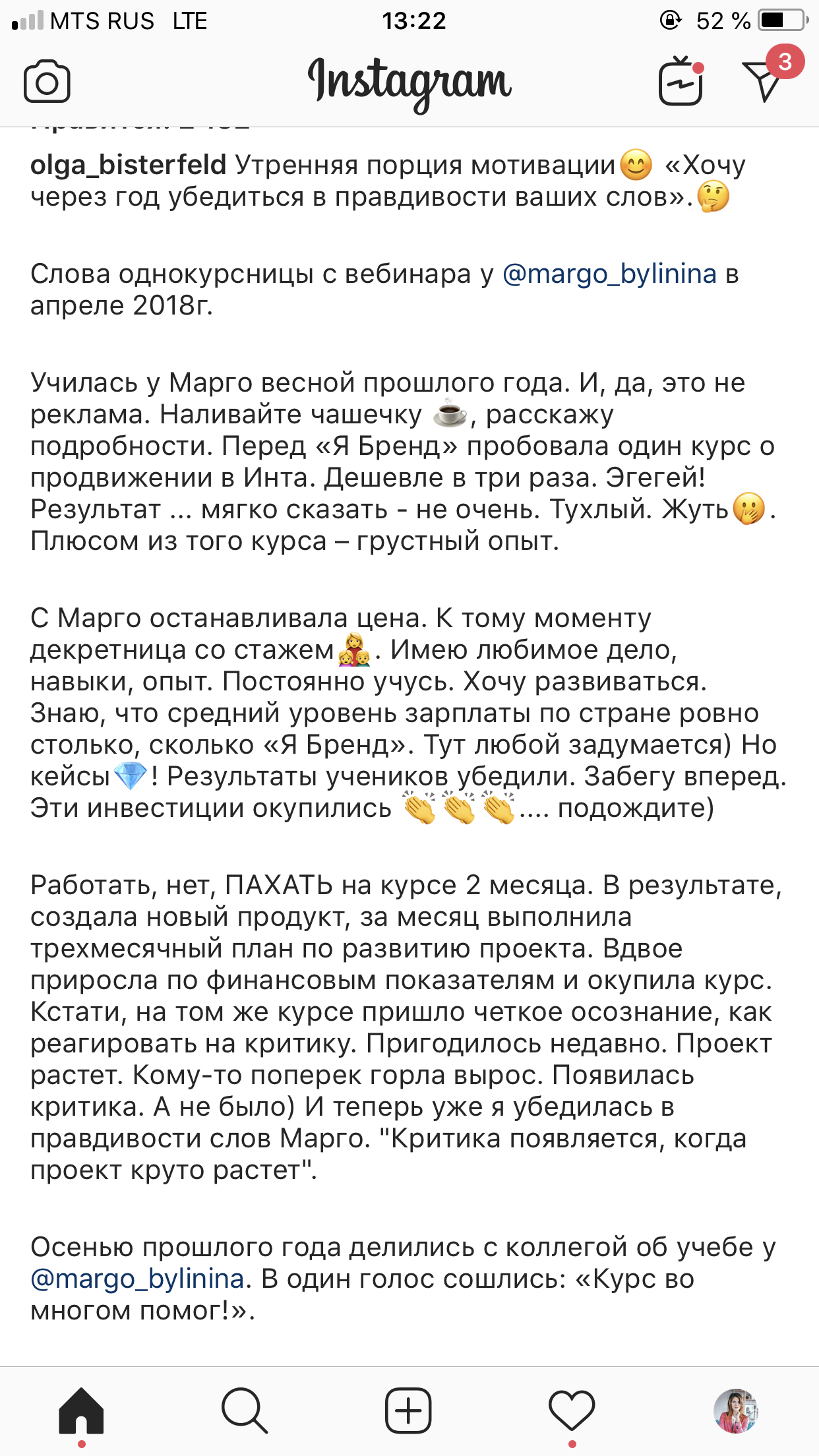 Проект мой стартовал с января, сейчас вышла на доход чуть больше 100 тр, но цель ставлю в 5 раз больше! И знаю, что благодаря тем знаниям, которые вы дали,я смогу легко этого достичь. Я вышла на свою ЦА, настолько комфортная для меня аудитория, ощущения что они это я.