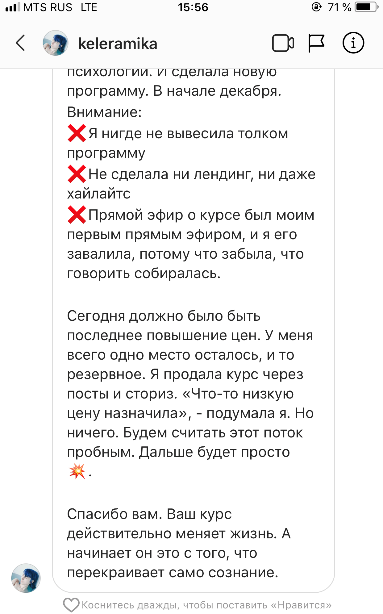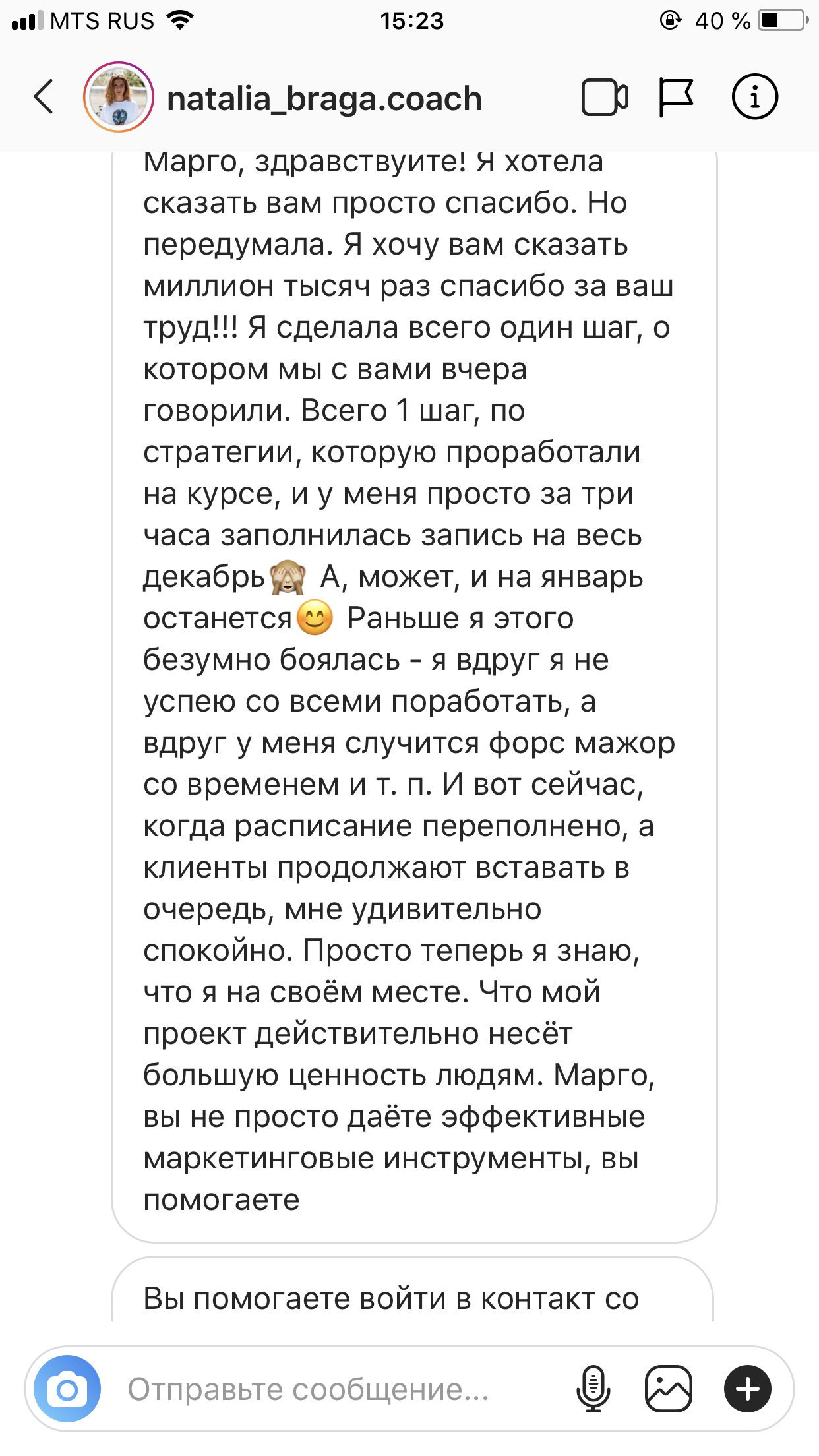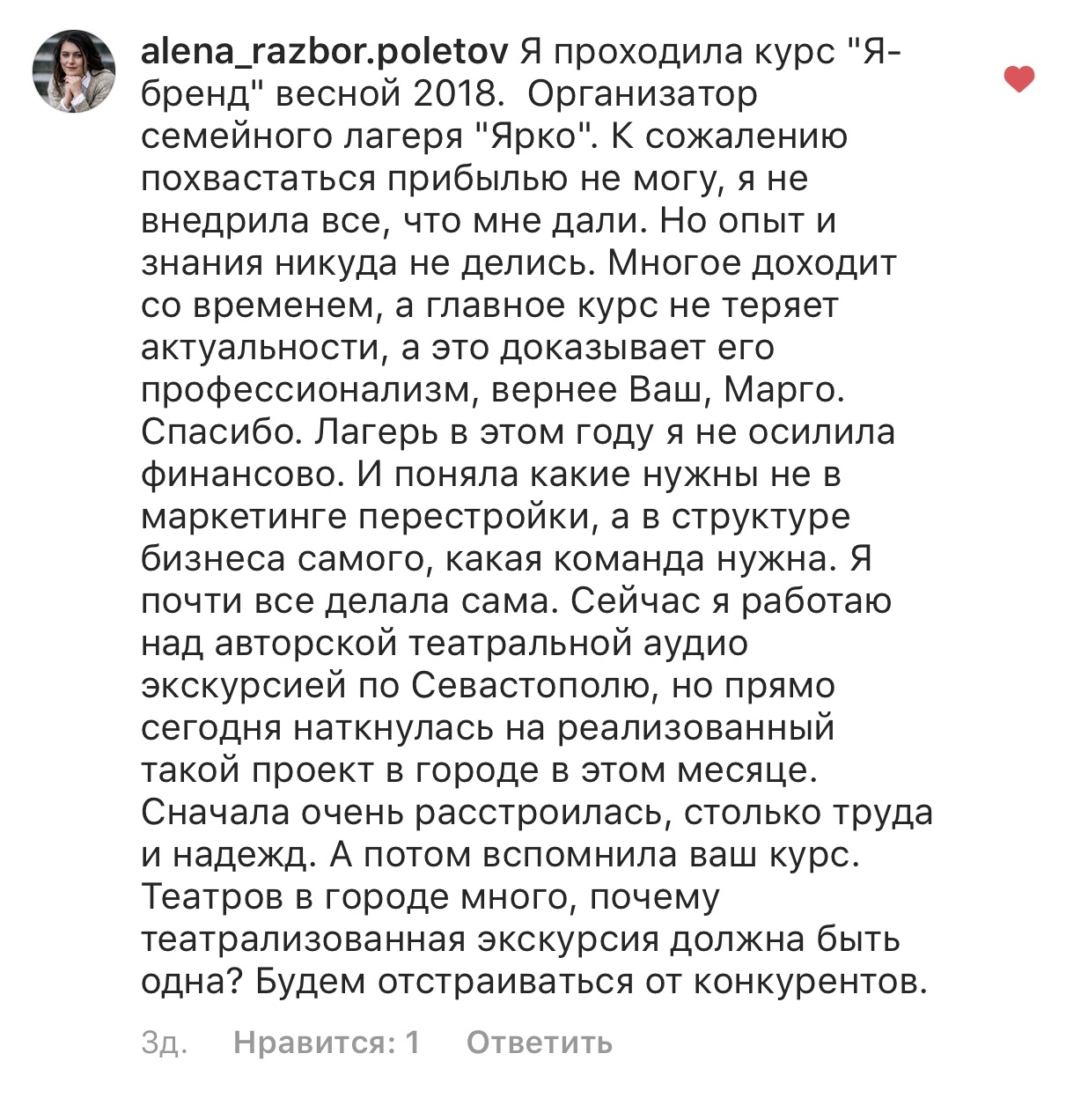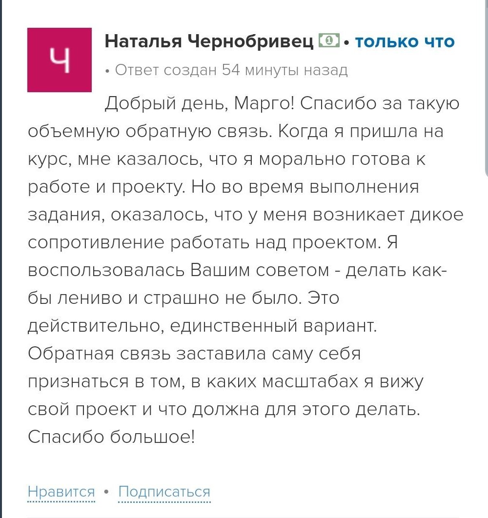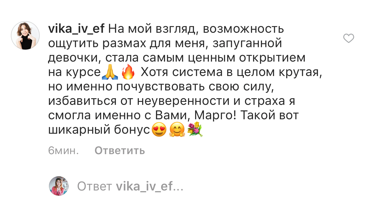 На старте проекта у меня было много сомнений и страхов, были страхи критики, страхи конкуренции, но сейчас даже не думаю об этом, потому что тупо некогда и конкуренция в моем понимании уже имеет совсем другое значение. Я планирую прийти на курс голос в ближайшее время, хочу пройти именно у вас.