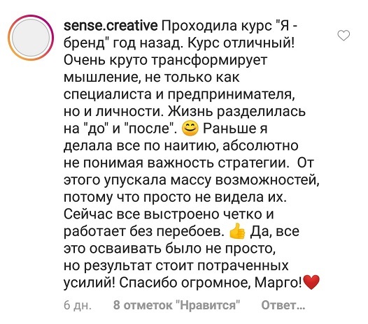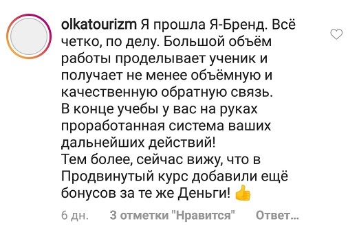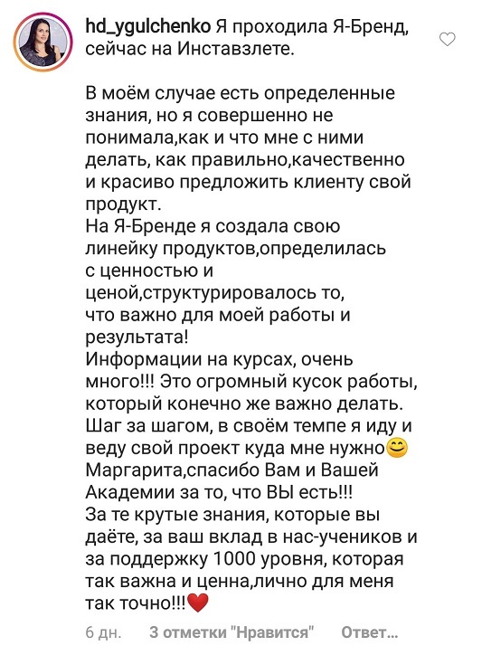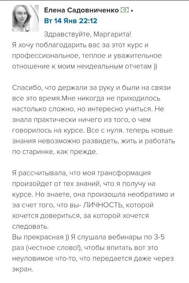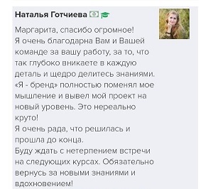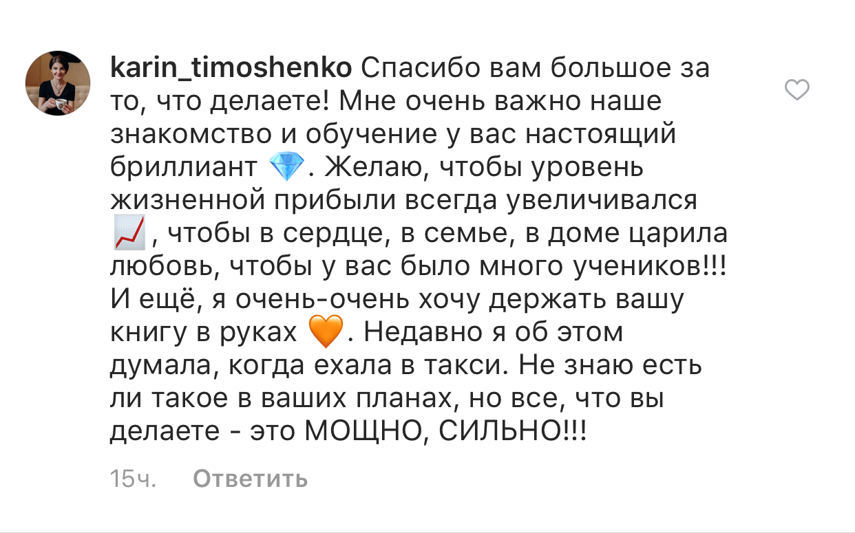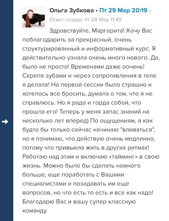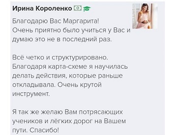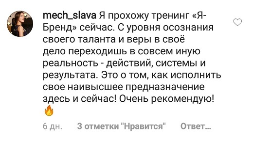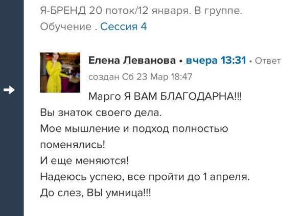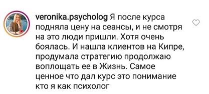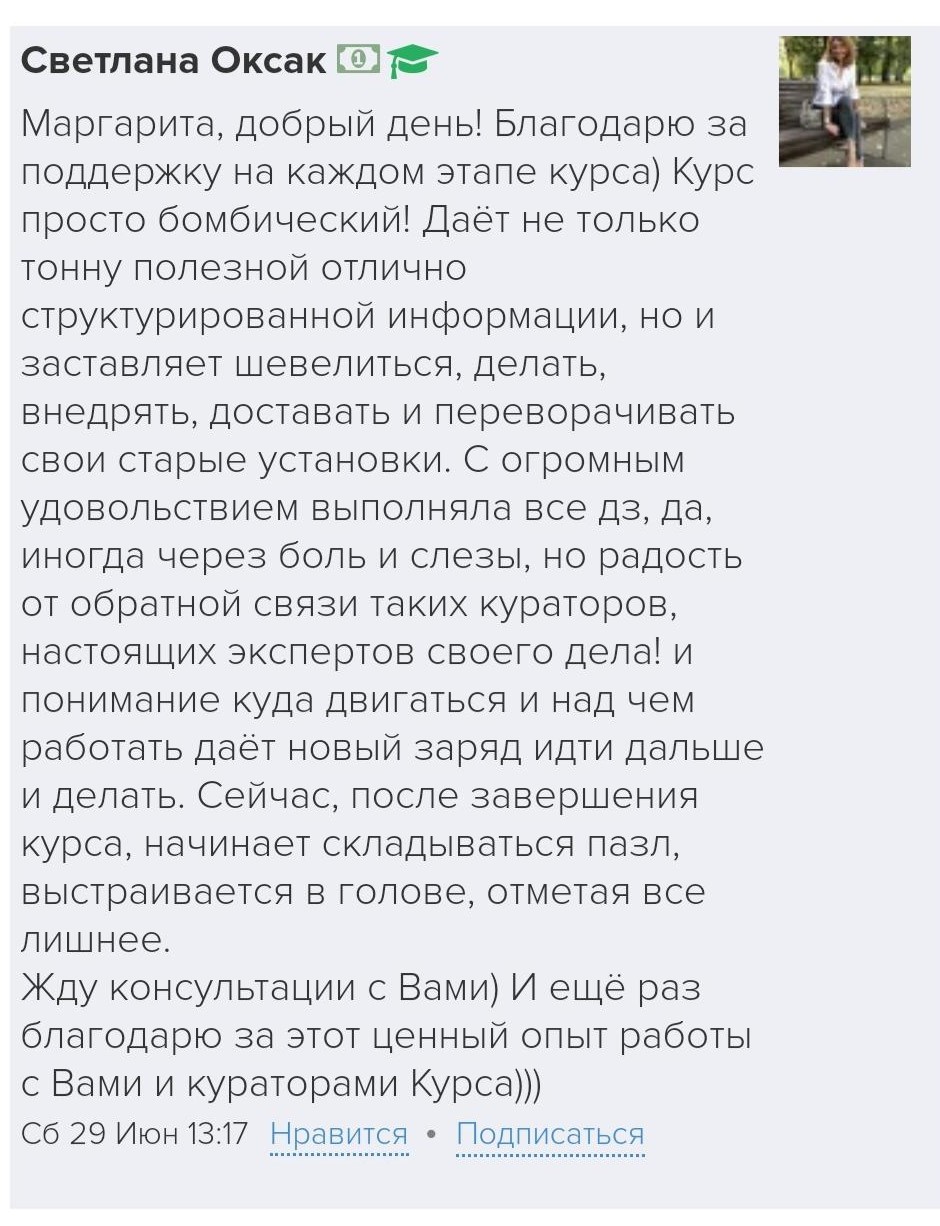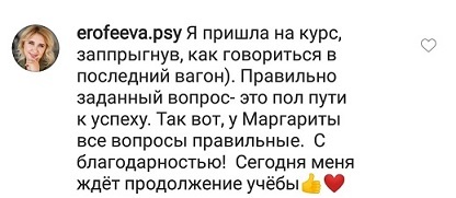 И еще, тренинги, которые я проходила после вашего курса уже не дотягивают, сложно учиться, когда ты уже учился у самого лучшего учителя. Это не лесть, это правда!
